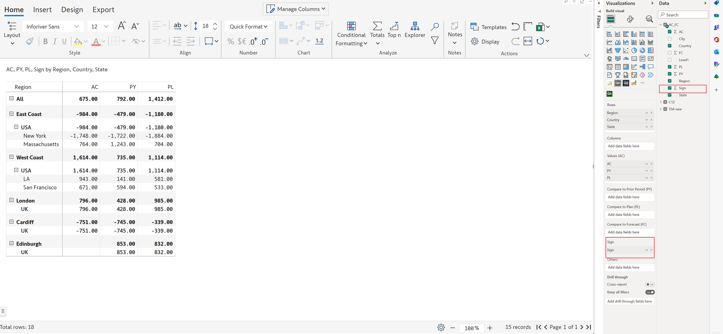 a) Add this sign column in the 'Sign' field. You can see the change in the values in the below image and also the calculation of subtotals and totals.