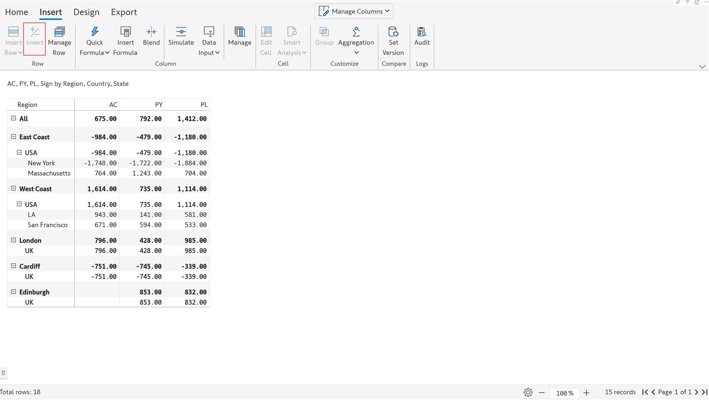1.2. Notice how the measure values are inverted for that row. The grand total row is also updated accordingly.