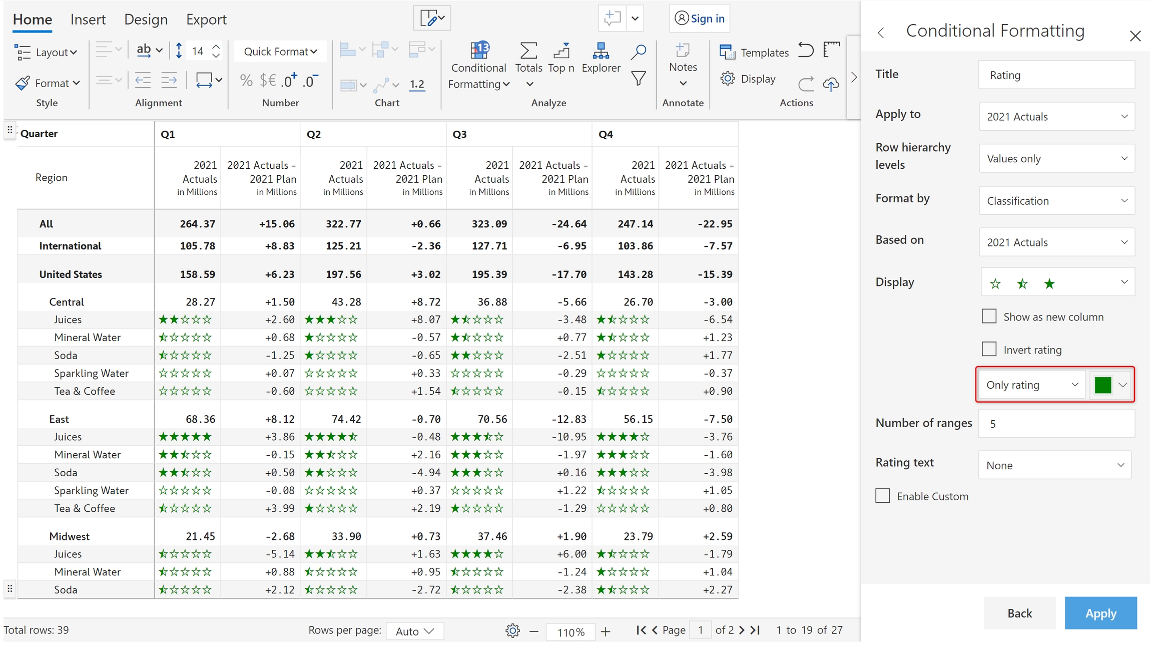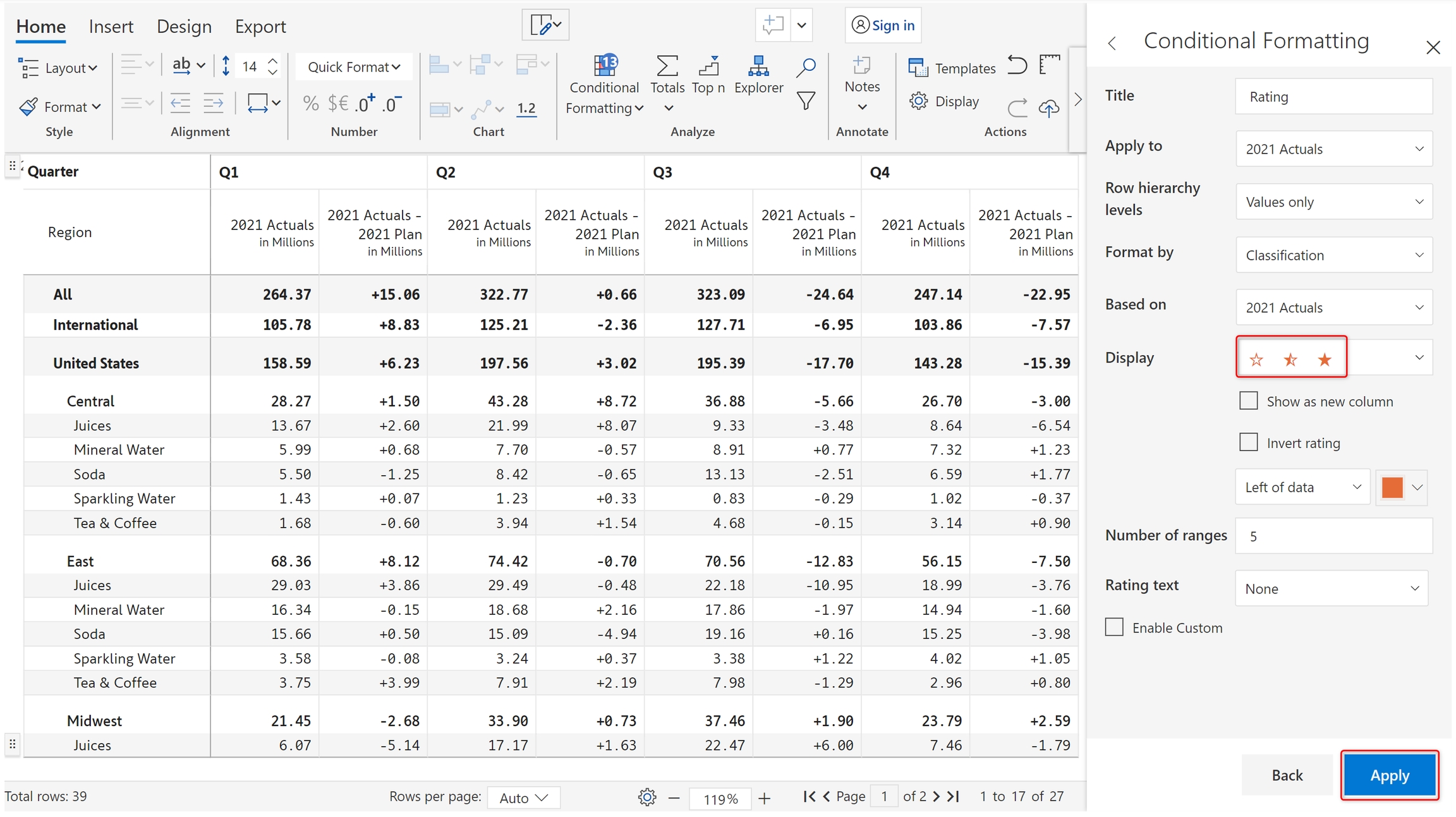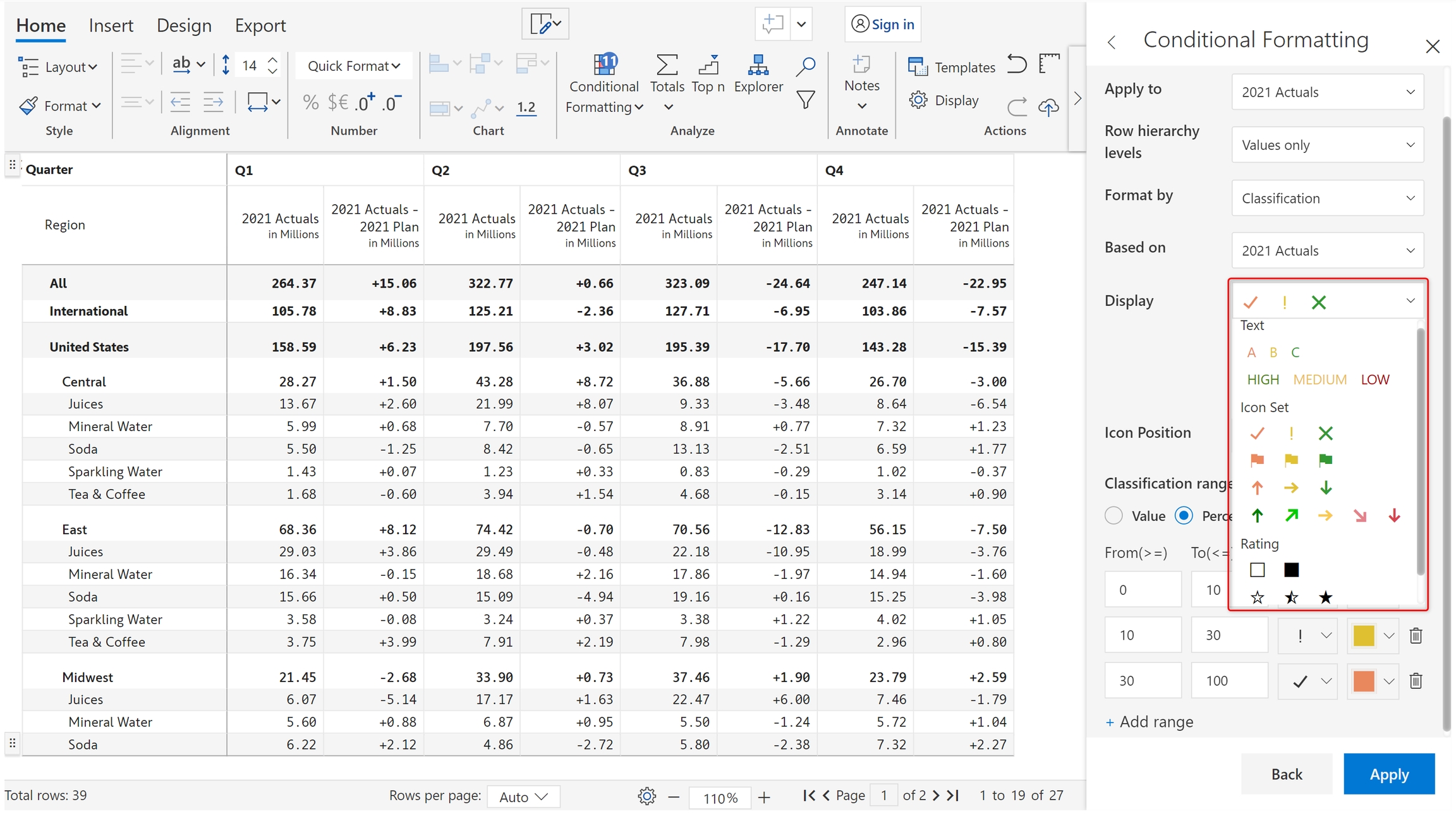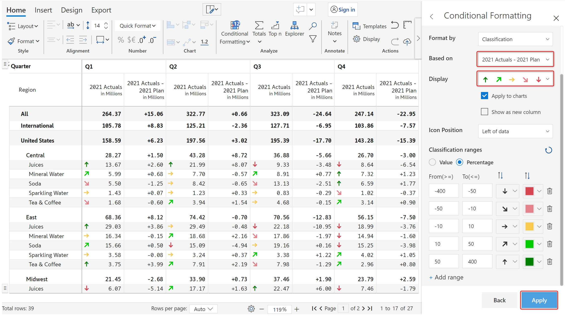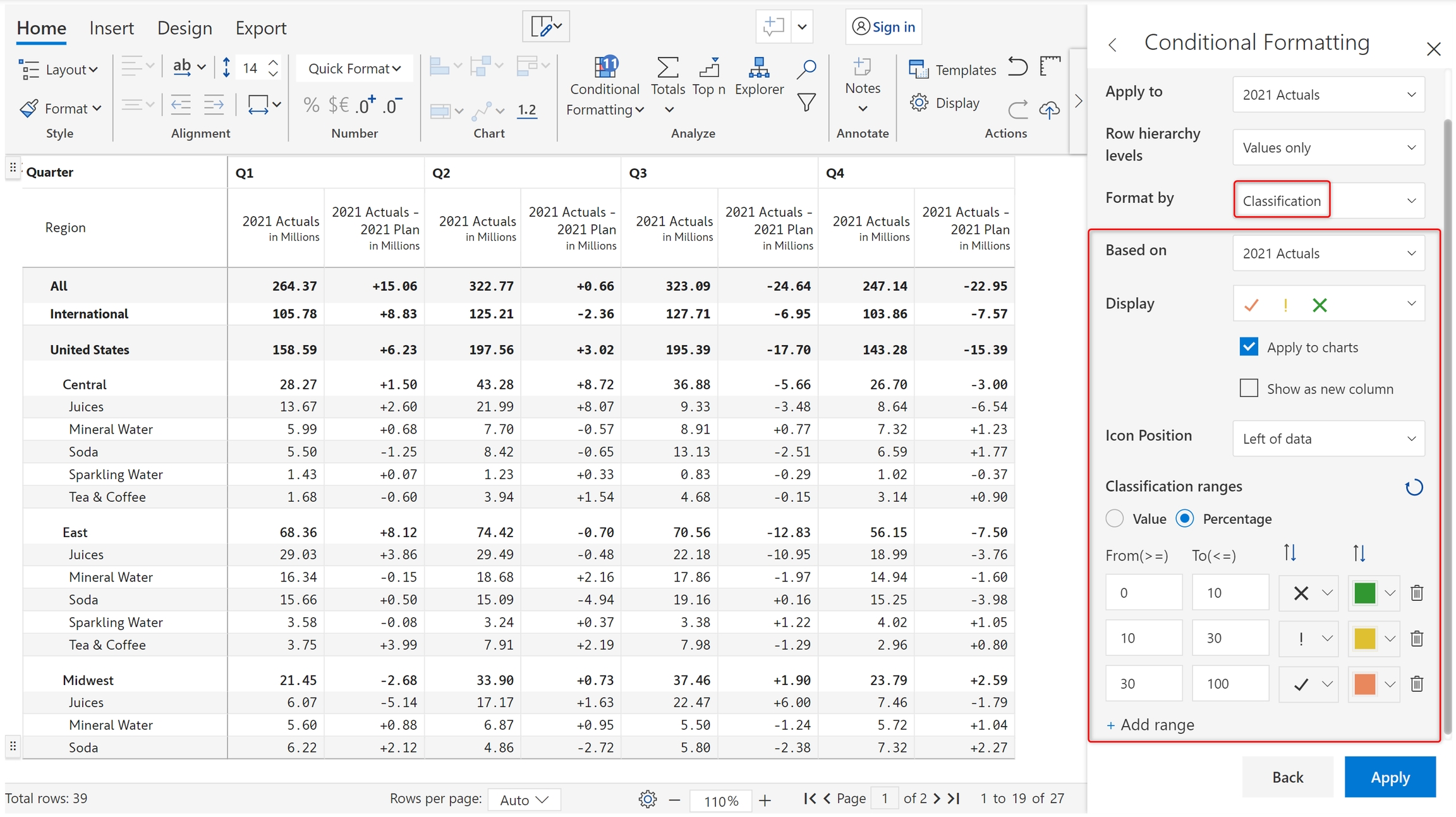 In the 'Display' dropdown, choose the 'Five arrows' option. Click 'Apply'. Note that we have applied formatting to 2021 Actuals based on 2021 Actuals - 2021 Plan. Hence, we can see which categories have done worse/better than the plan.