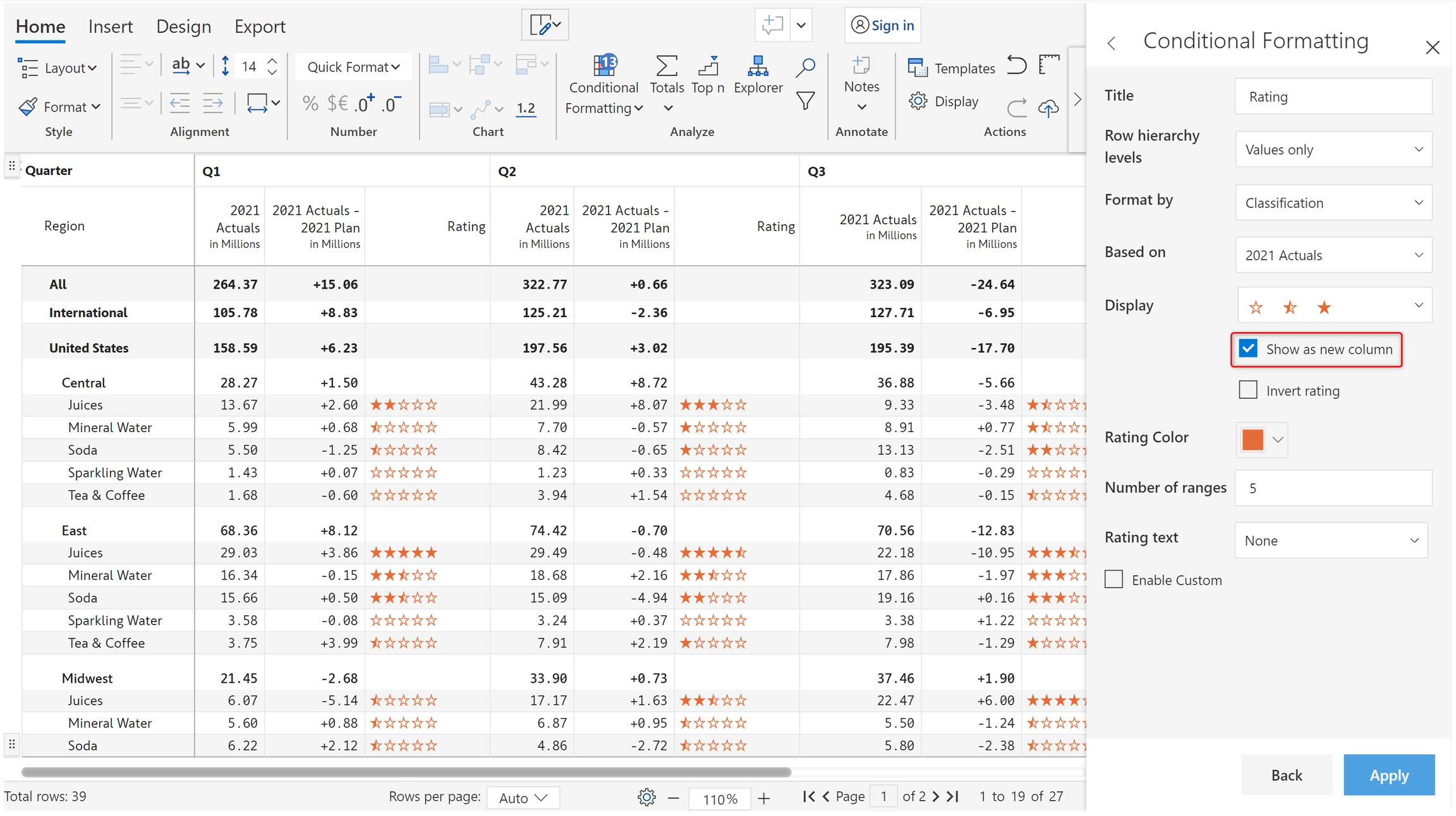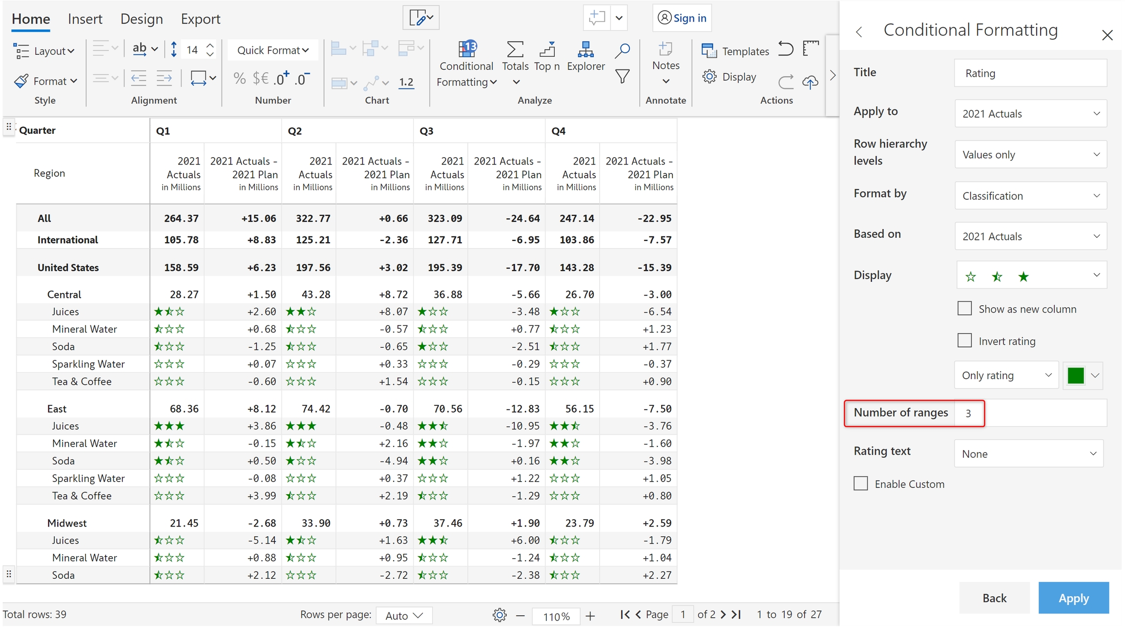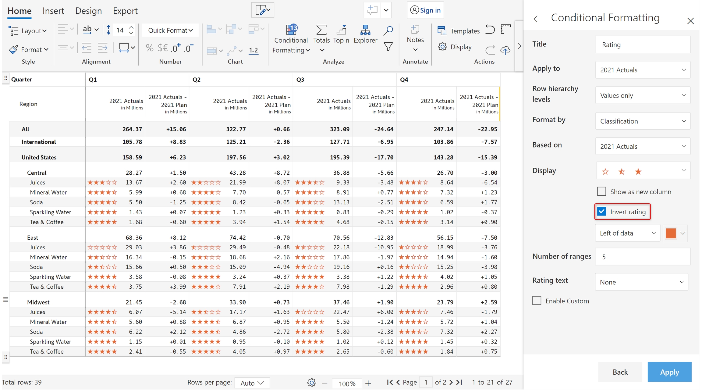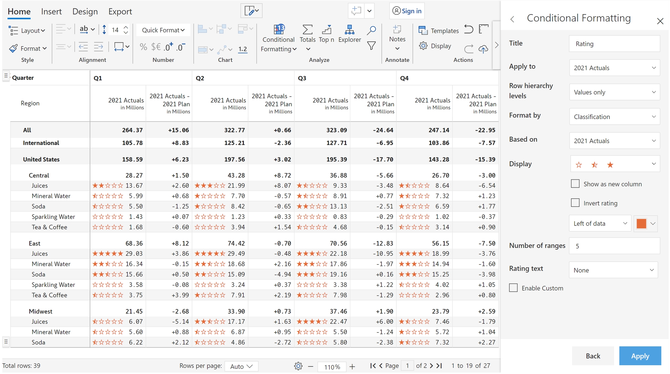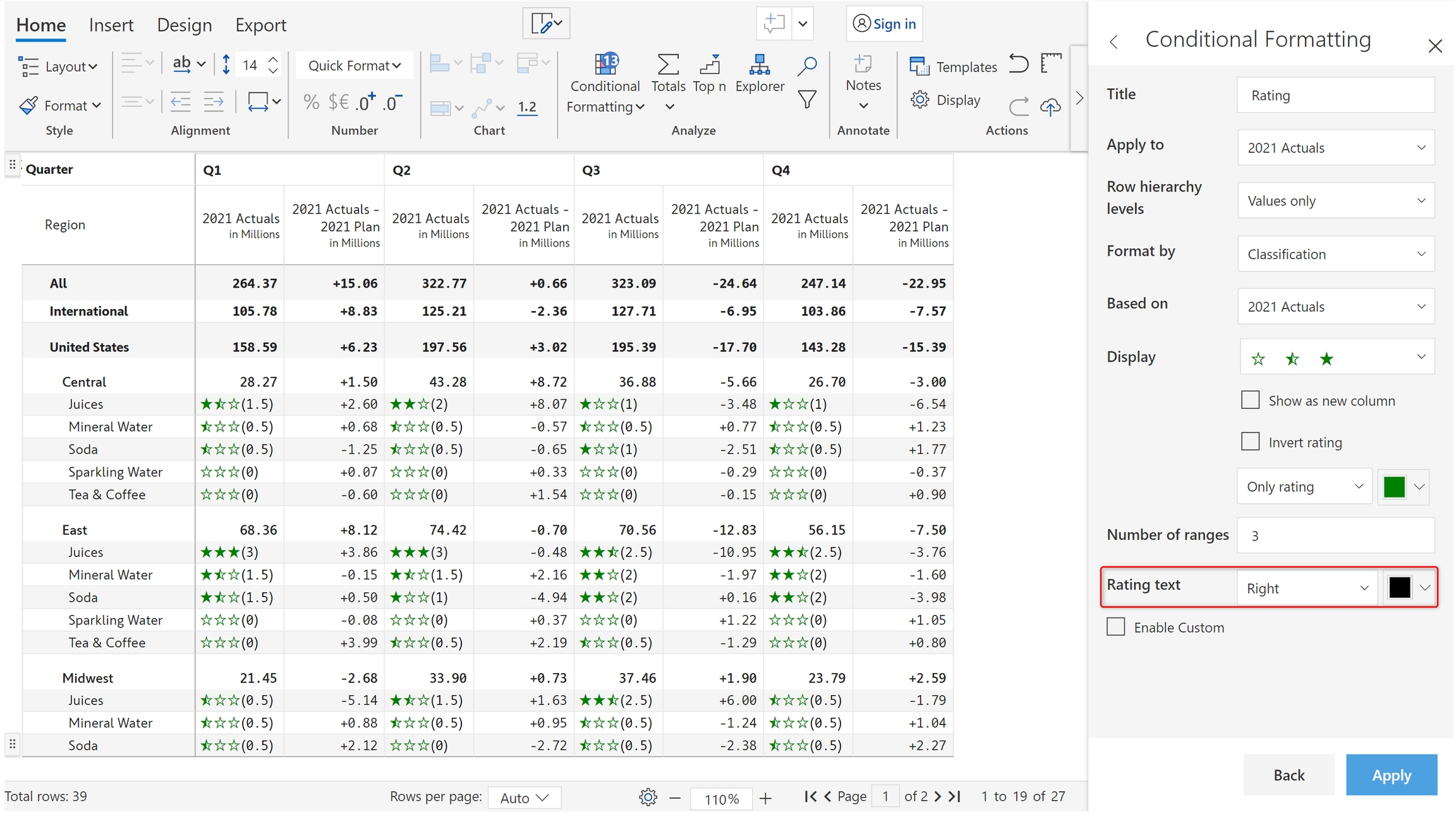 In the 'Display' dropdown, choose the 'Five arrows' option. Click 'Apply'. Note that we have applied formatting to 2021 Actuals based on 2021 Actuals - 2021 Plan. Hence, we can see which categories have done worse/better than the plan.