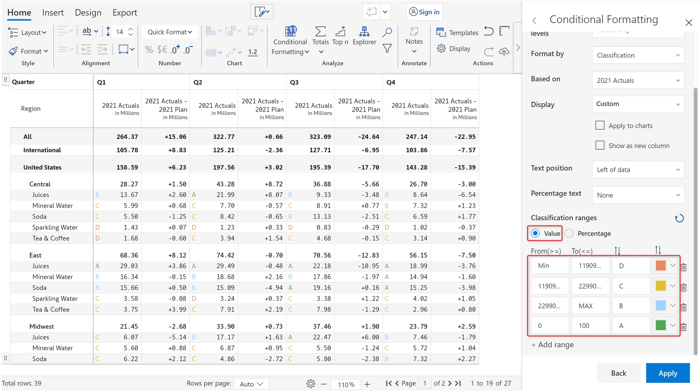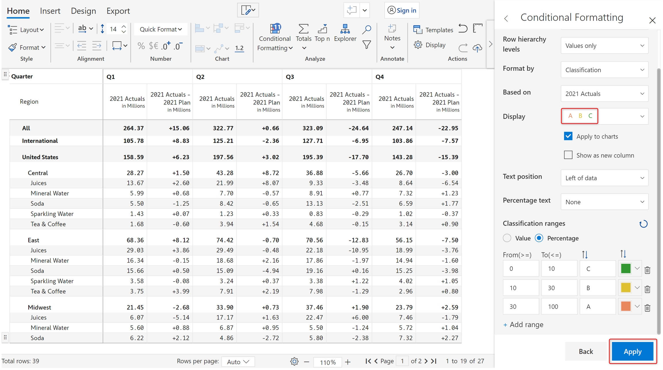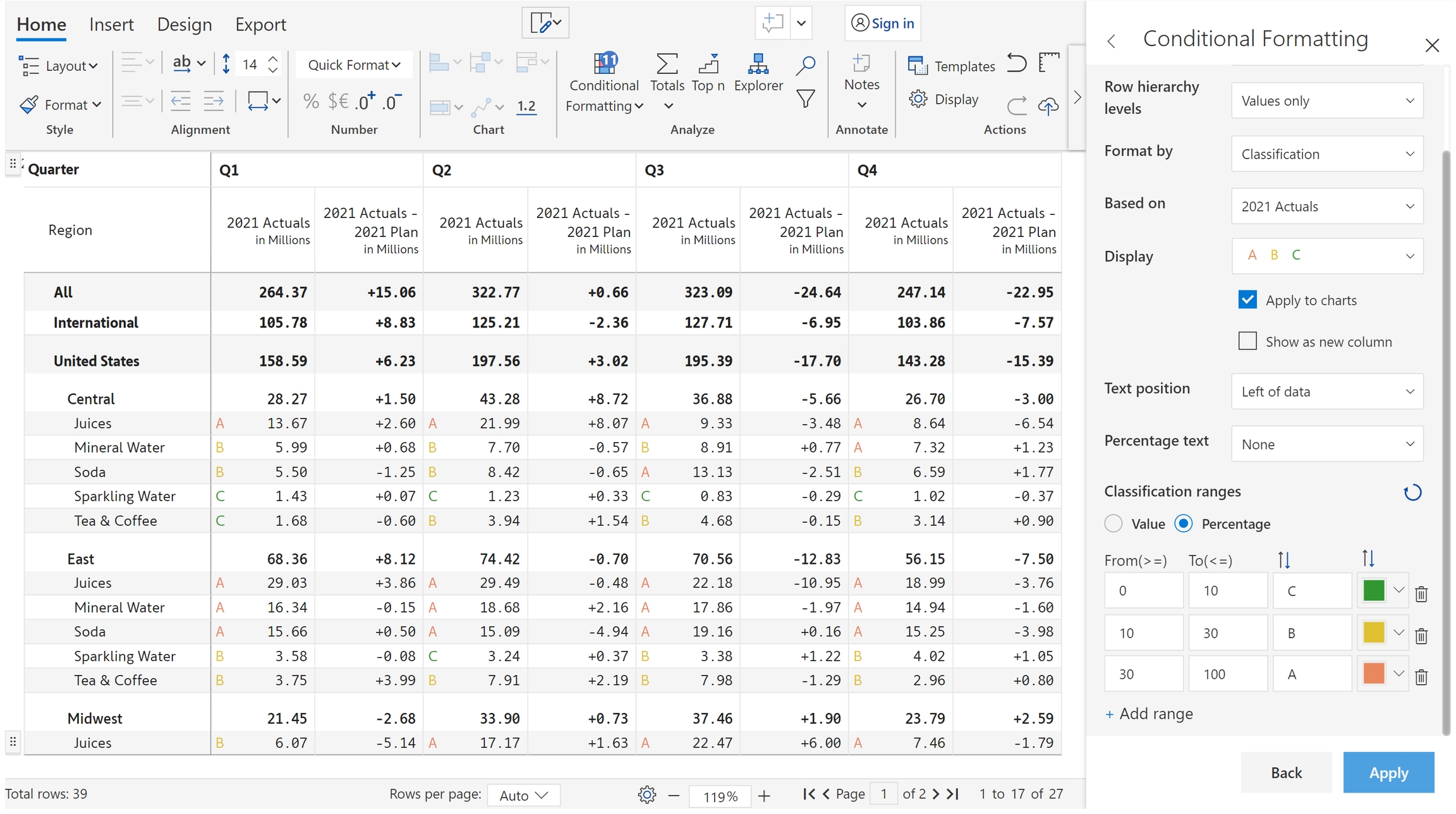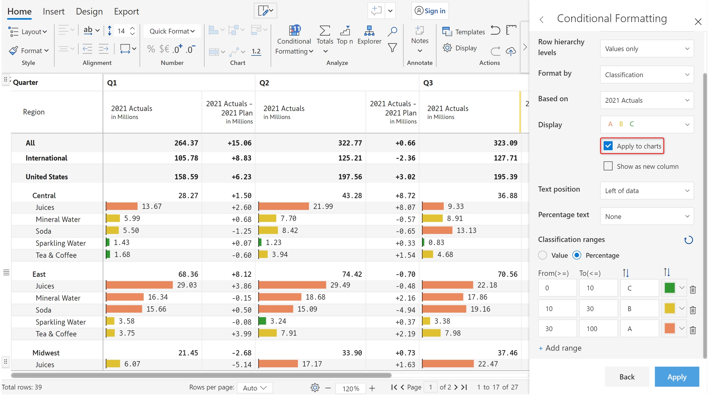 1.4. When there are charts in the column where classification is to be applied, check the Apply to charts checkbox. In the below image, 2021 Actuals are visualized using bar charts, and the colors defined for the ABC ranges are used for formatting.