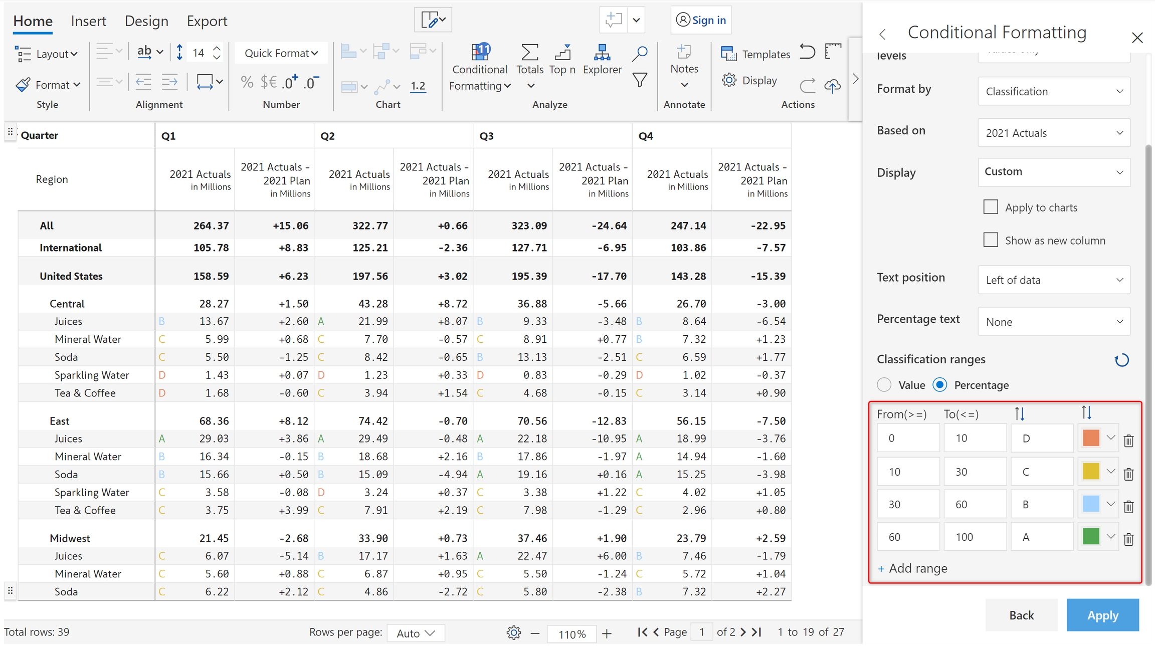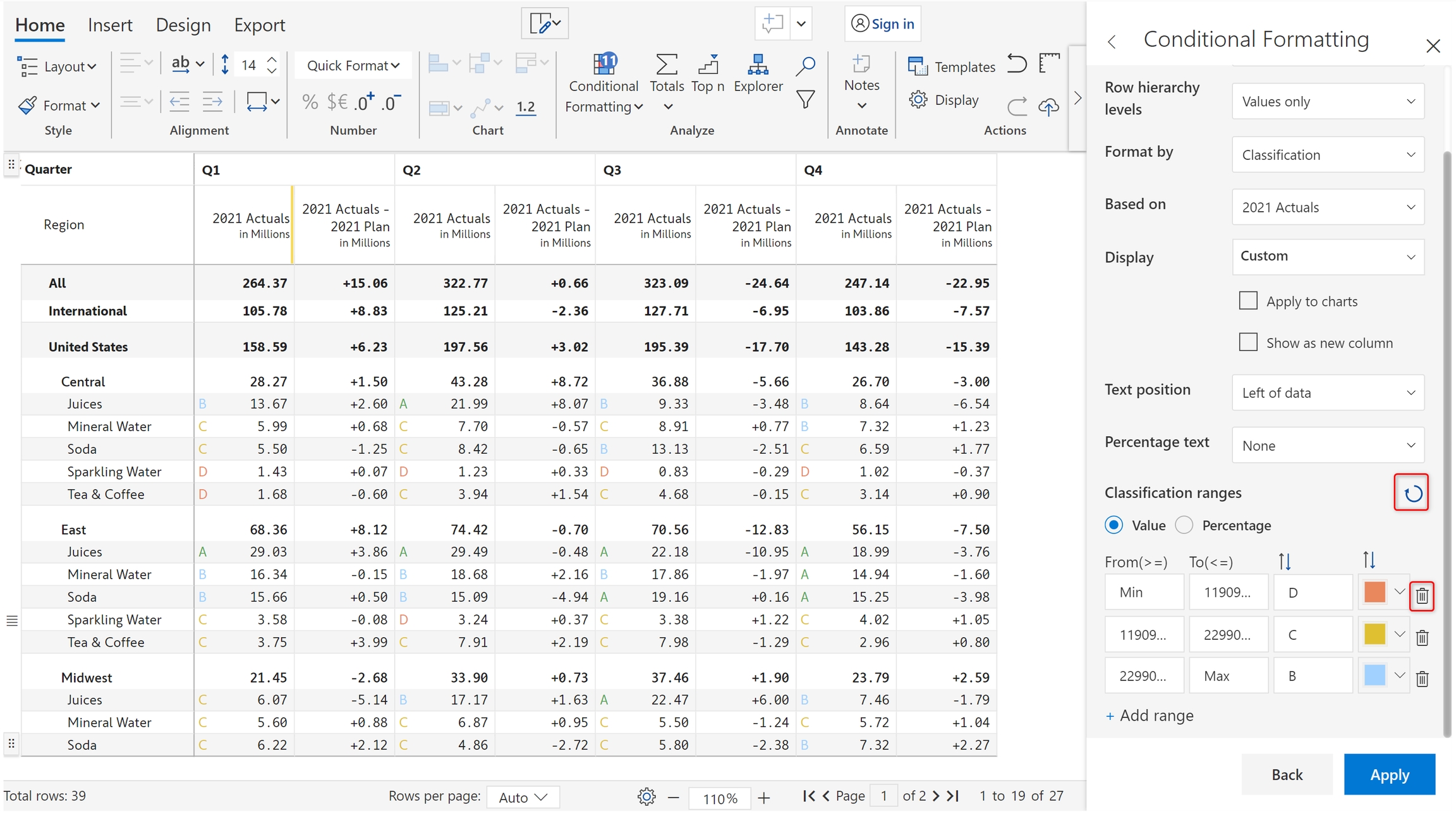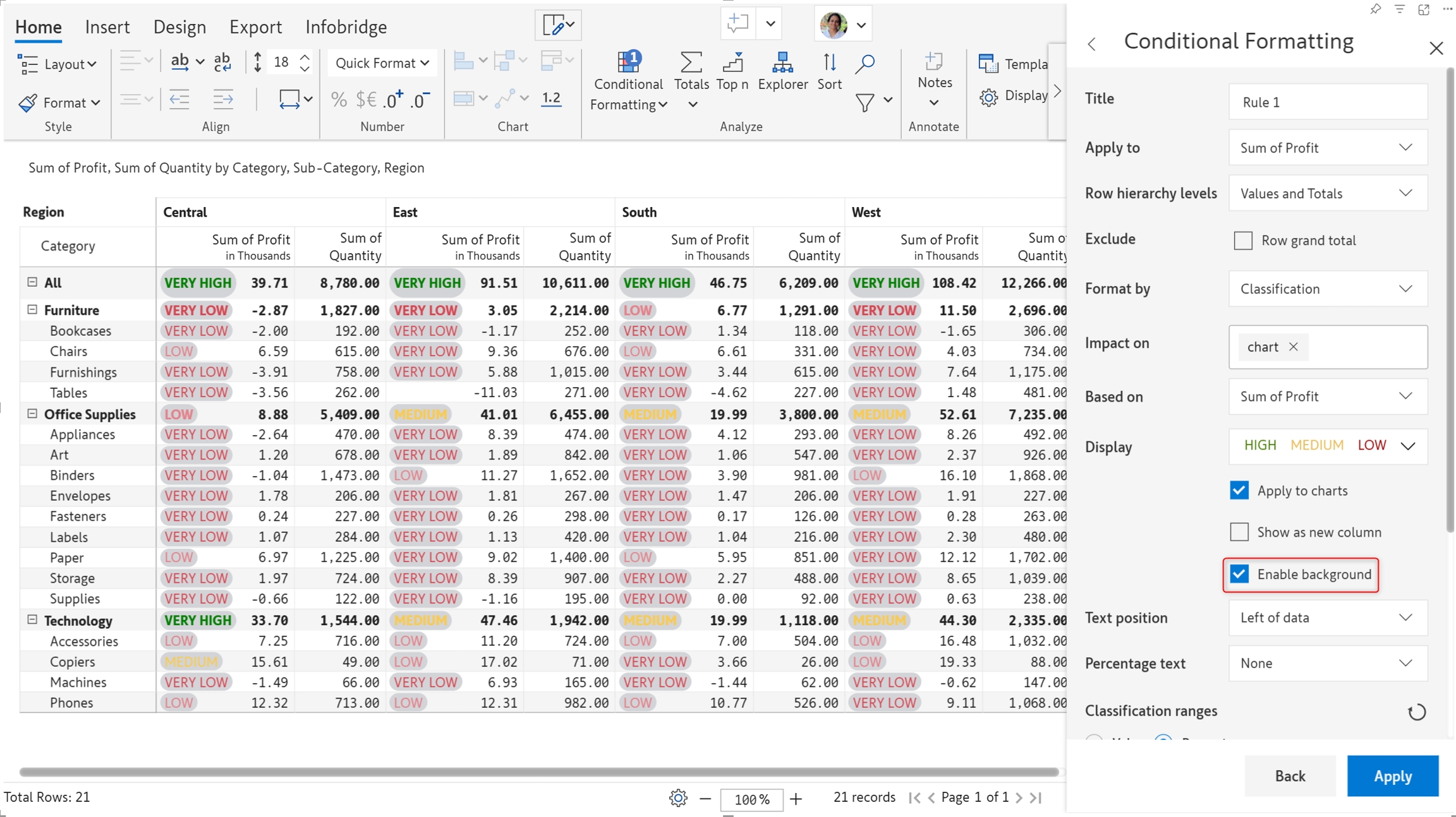 1.4. When there are charts in the column where classification is to be applied, check the Apply to charts checkbox. In the below image, 2021 Actuals are visualized using bar charts, and the colors defined for the ABC ranges are used for formatting.