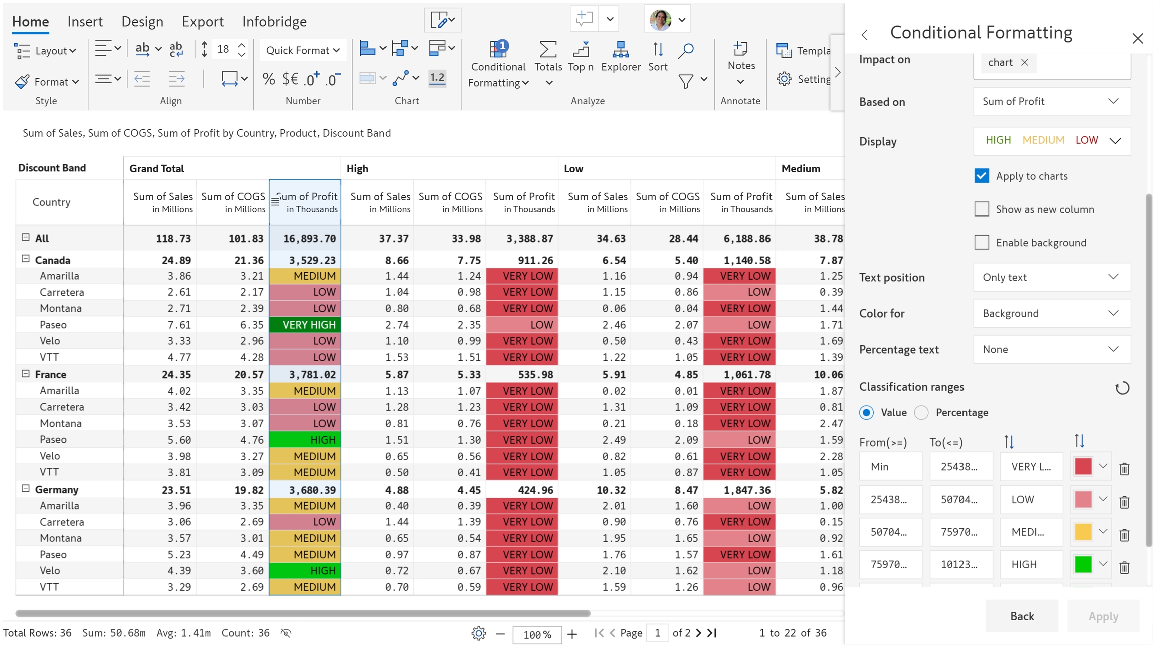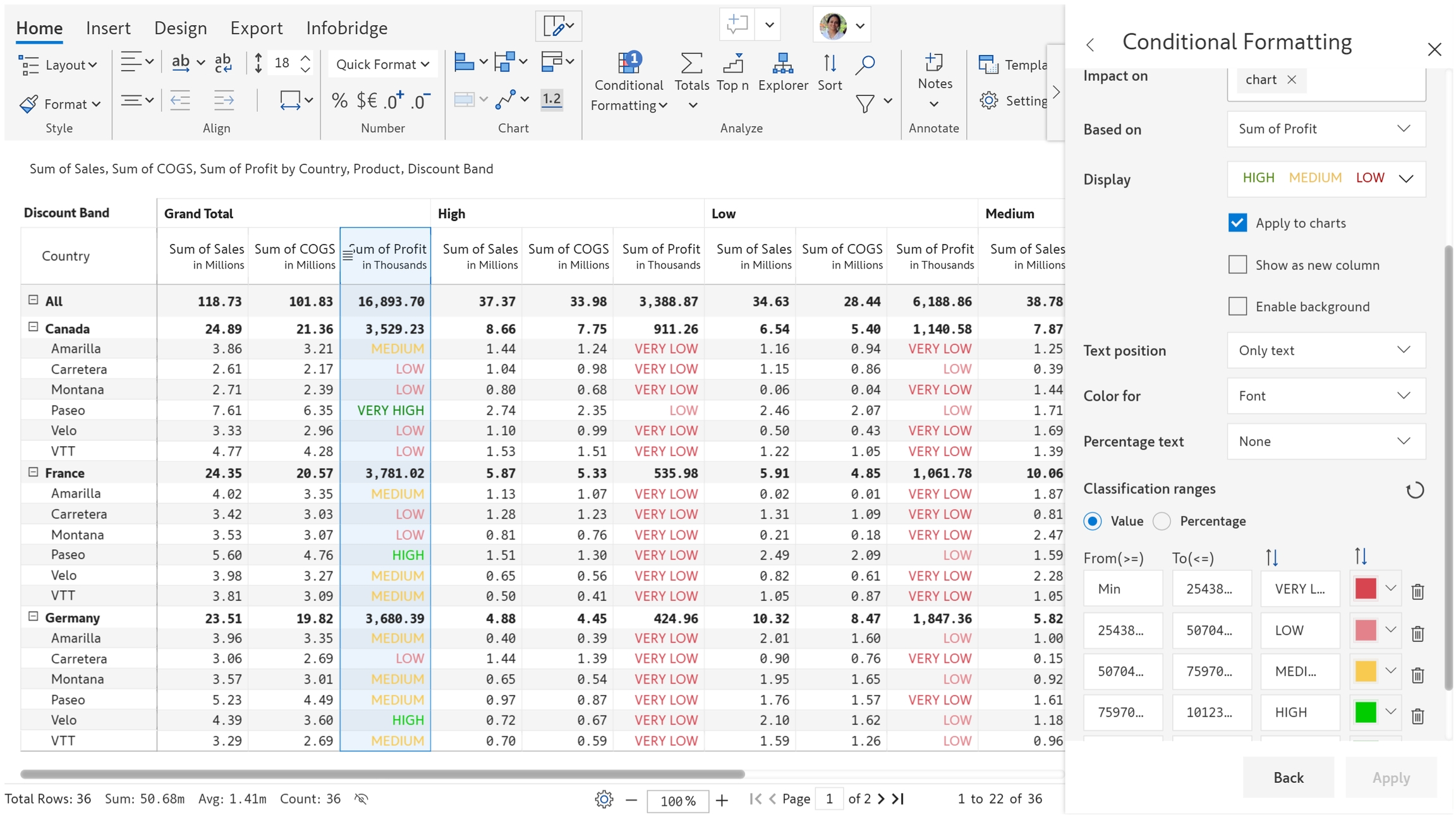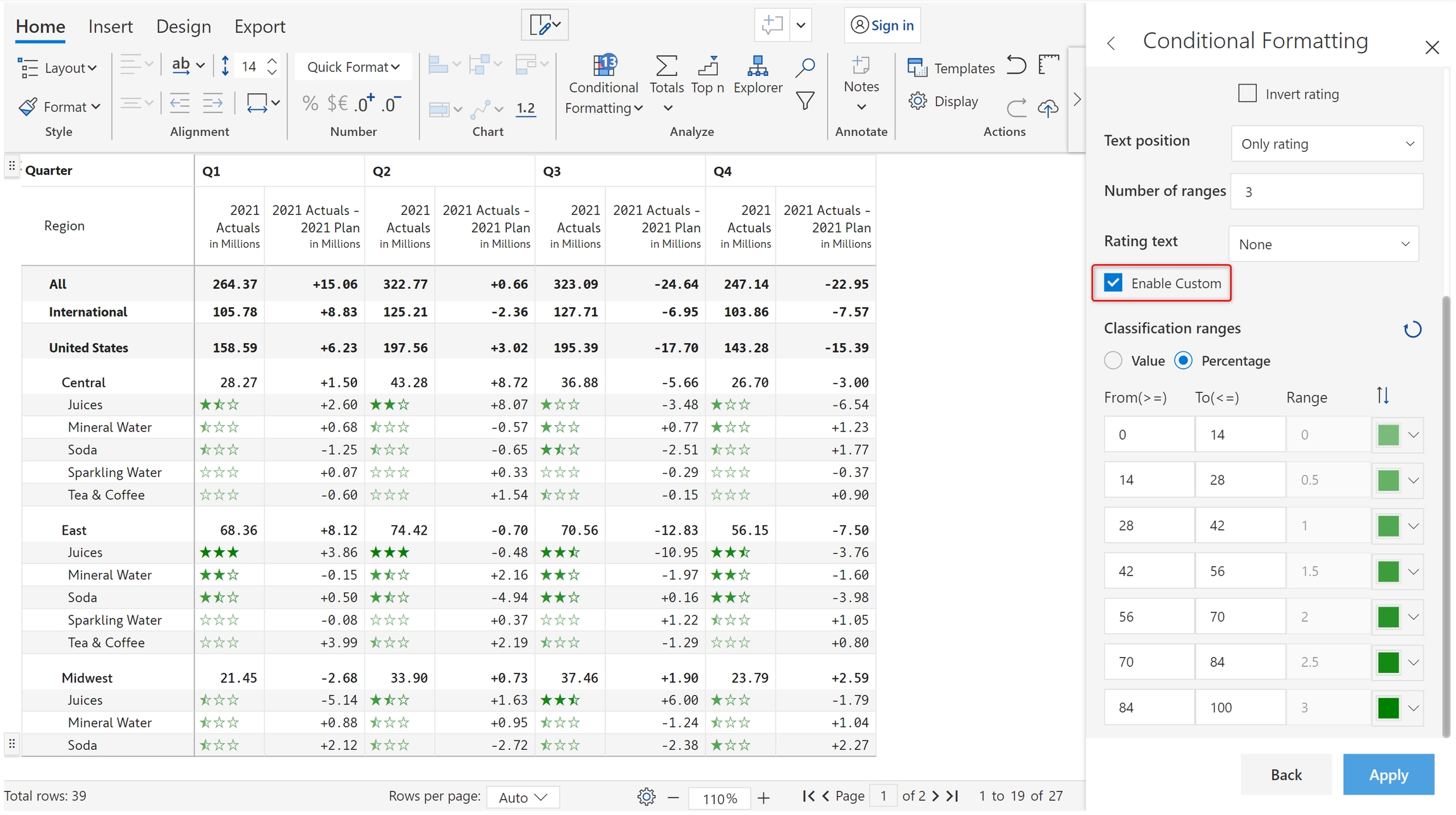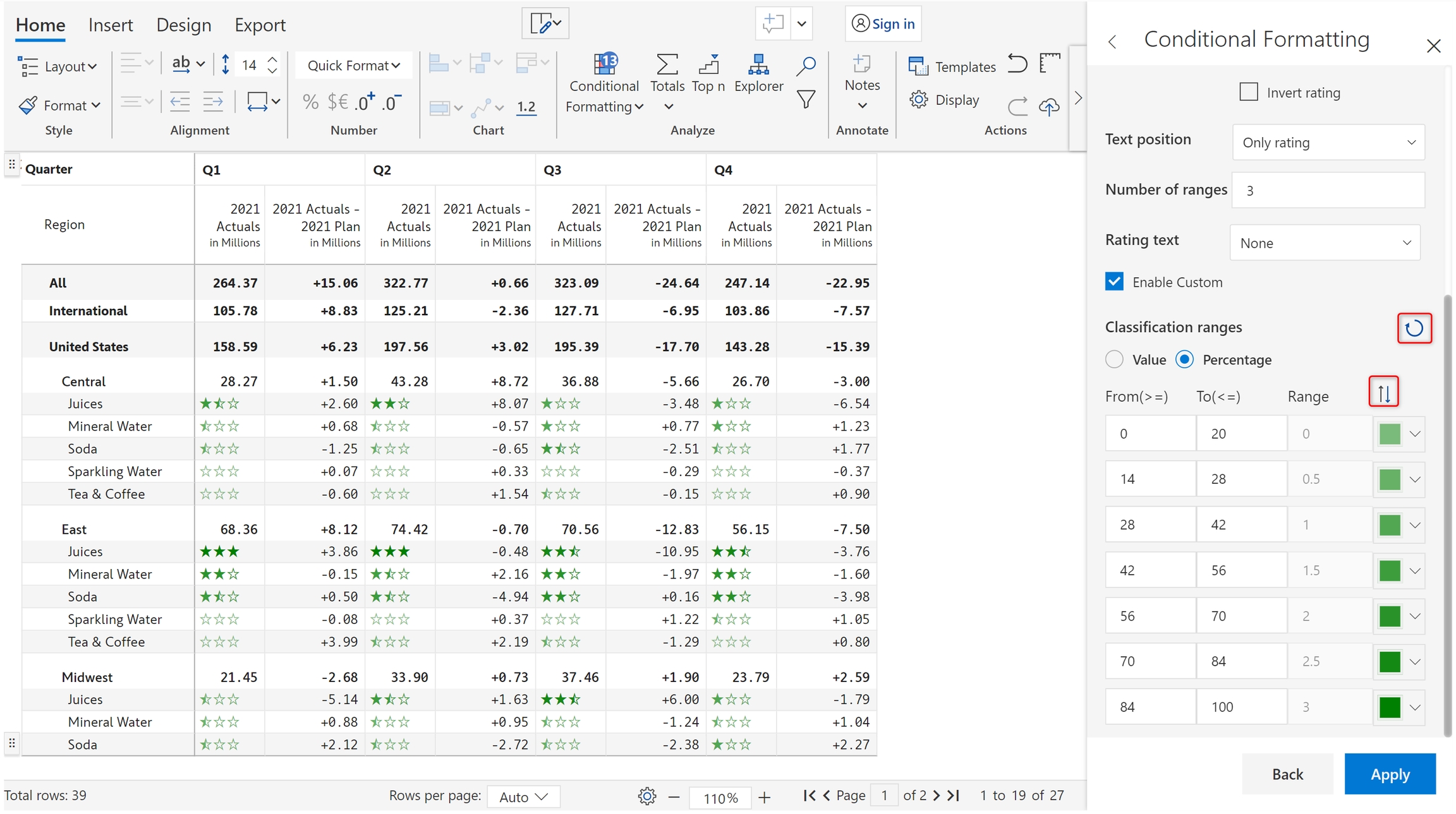 1.4. When there are charts in the column where classification is to be applied, check the Apply to charts checkbox. In the below image, 2021 Actuals are visualized using bar charts, and the colors defined for the ABC ranges are used for formatting.