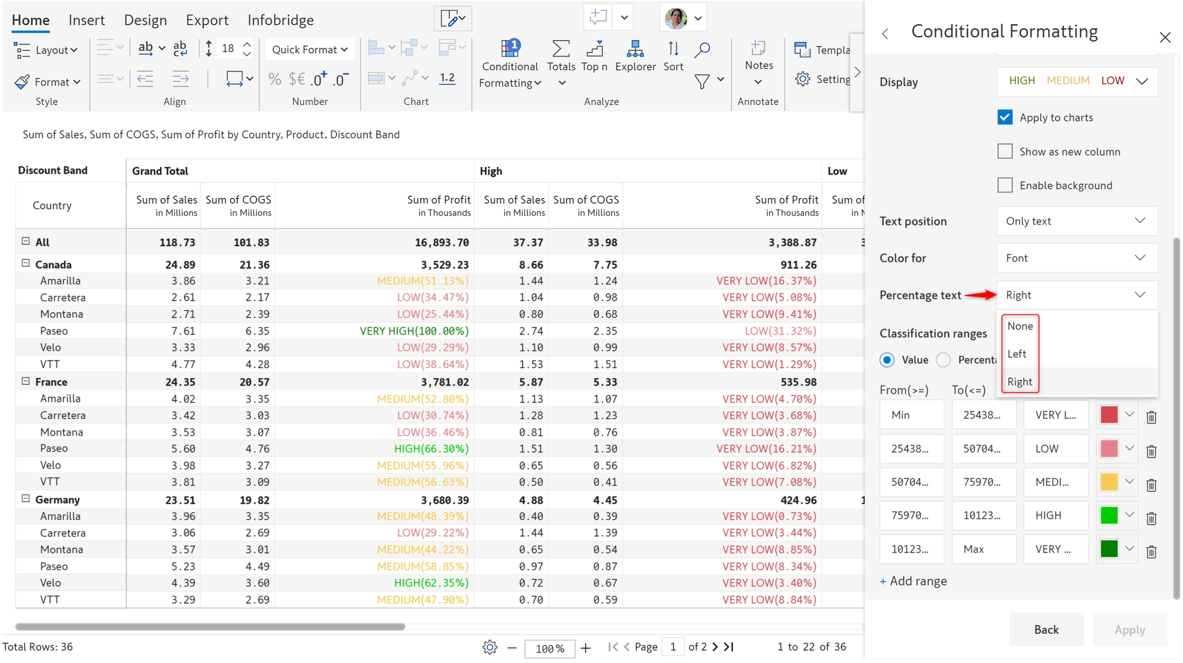 1.8. You can display the percentage contribution to the left or right of the text using the Percentage text dropdown.