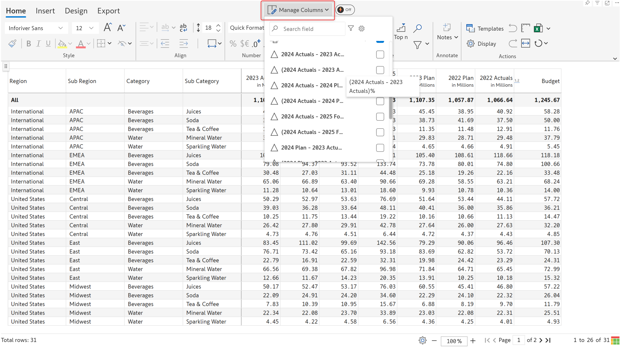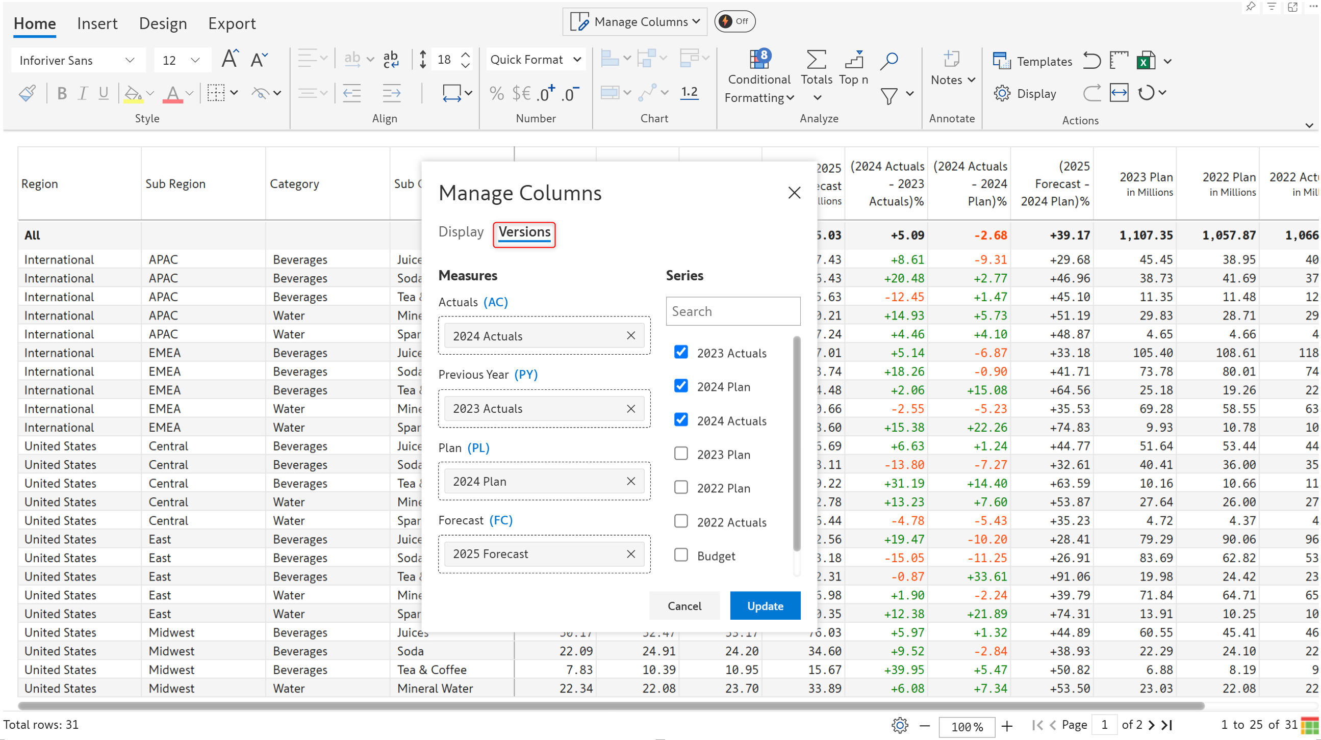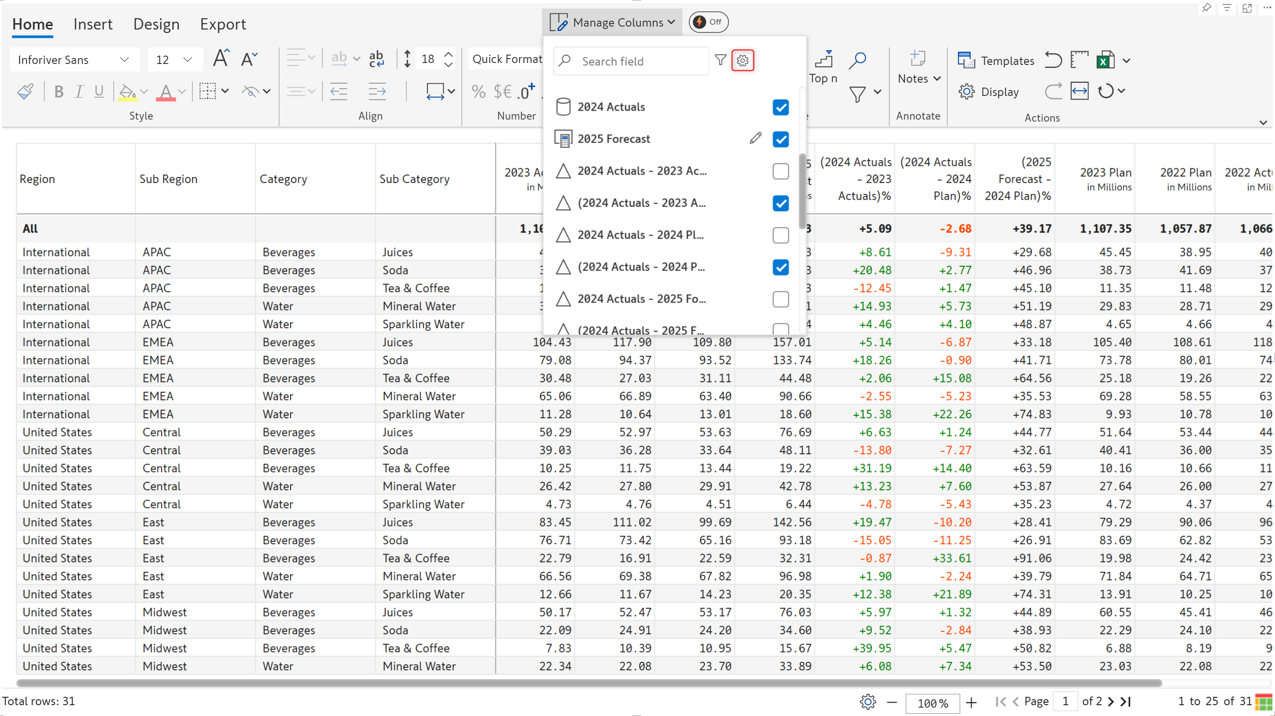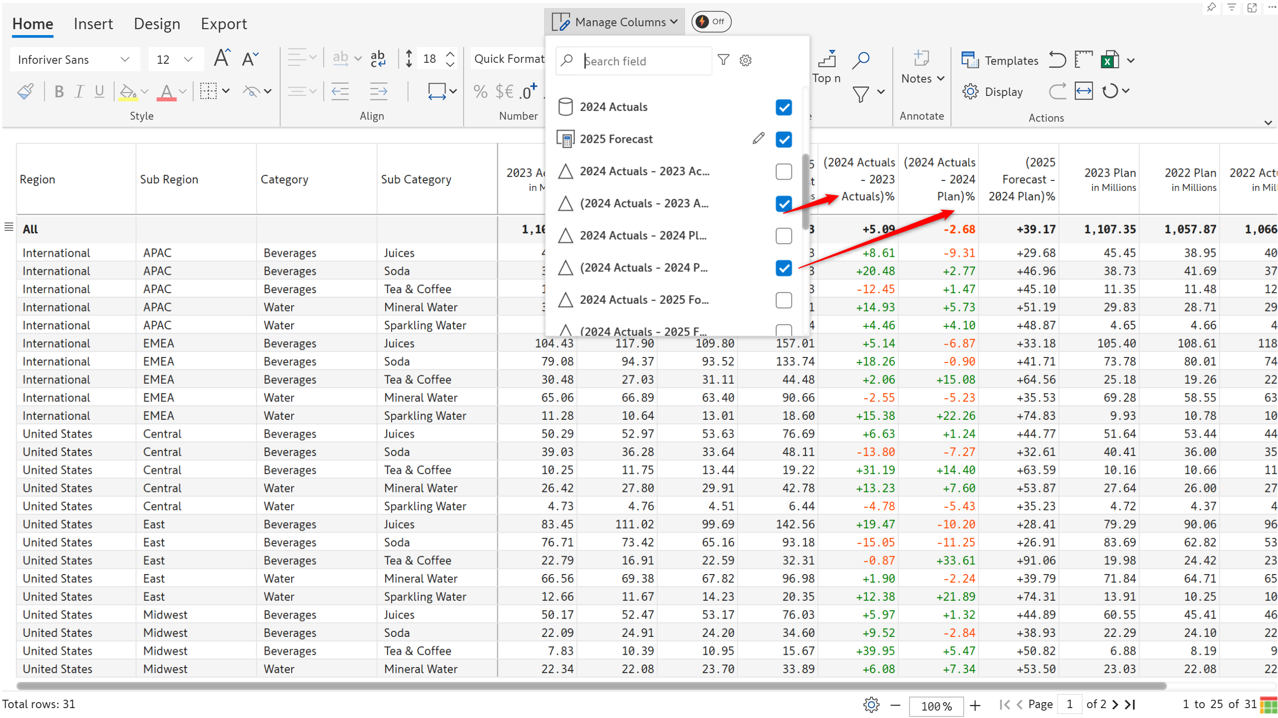Based on the configurations in the Set Version window, Premium table will calculate the absolute and relative variance between the AC/PY/PL/FC measures. You can view the variance fields from the **Manage Columns** interface. Select the variance fields that are required for your report.
