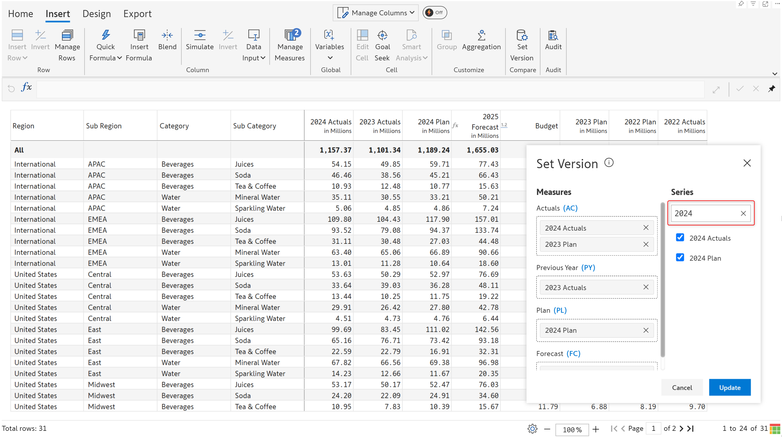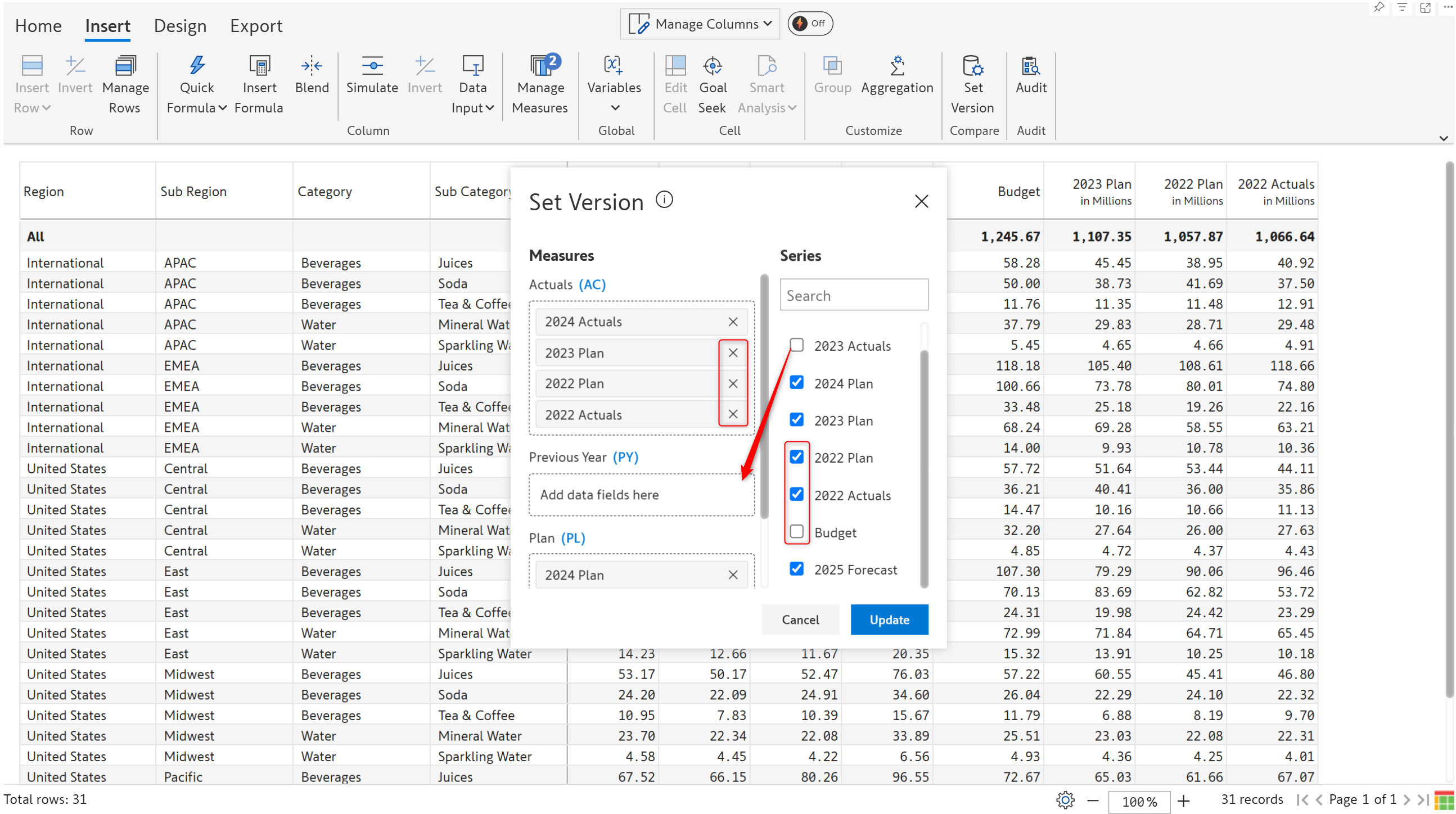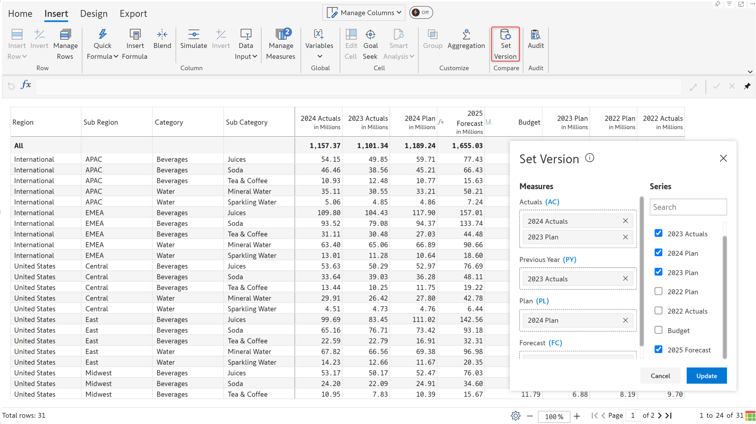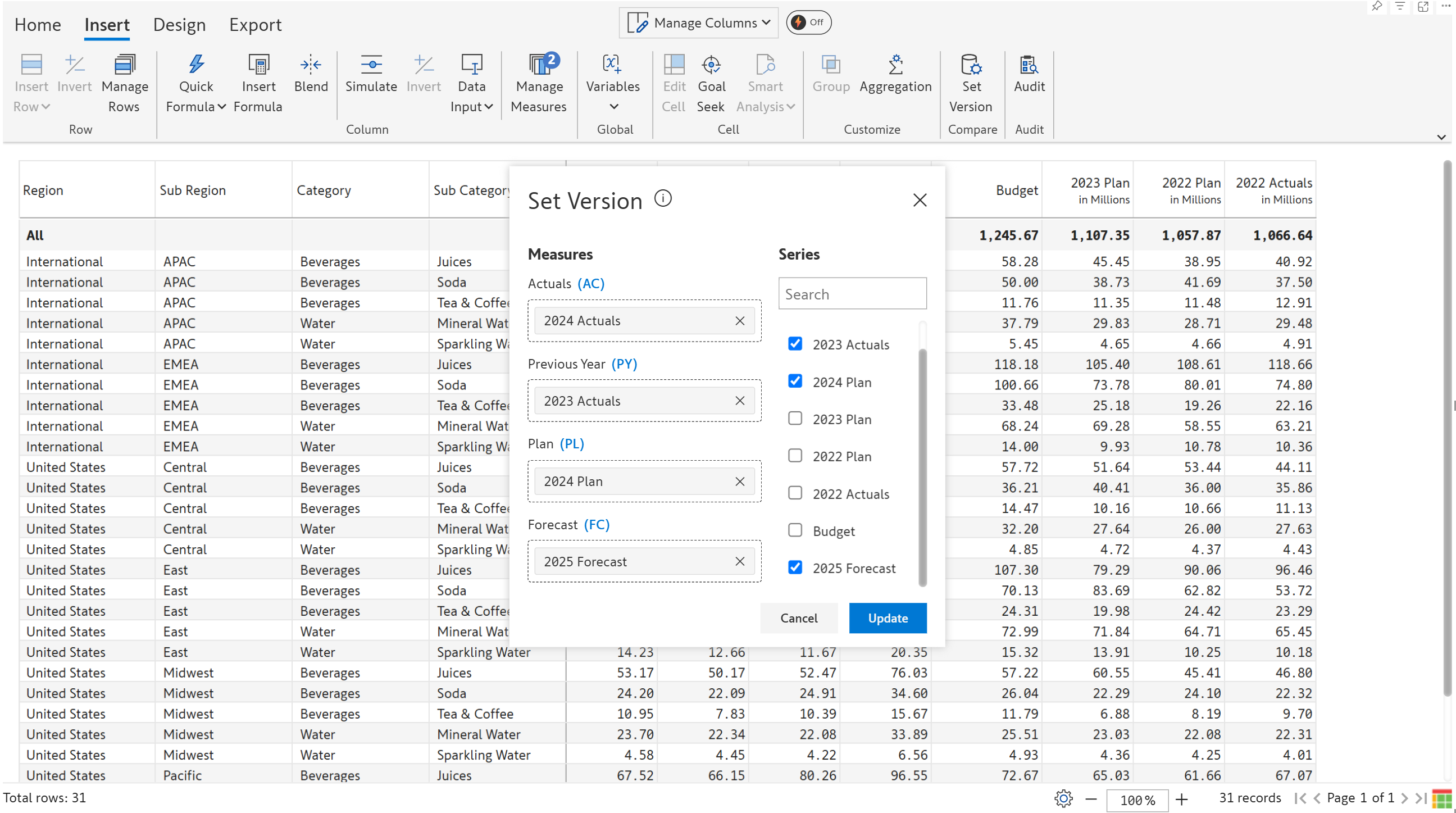 Click  **Set version** in the Insert tab of the toolbar. The current AC, PY, PL, and FC mapping is shown along with other measures created in the visual - such as simulations and budgets.