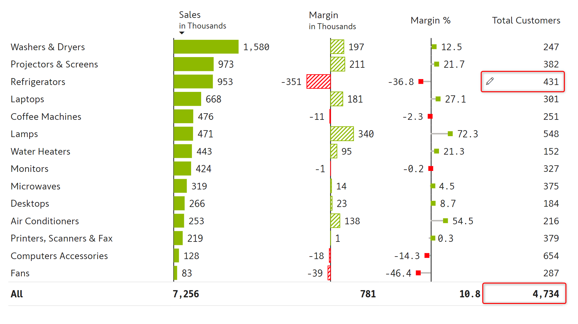In the example above, we have increased the value for the category 'Projectors & Screens' by 9%. The Grand Total row reflects how individual simulations impact the overall target sales.