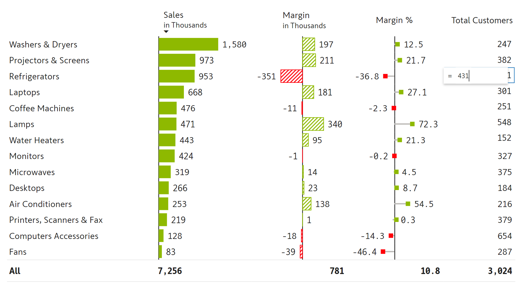 To simulate outcomes in Inforiver by editing data, you select a specific cell and start typing in a new value. Just as with Excel, a cell editor shows up just over the value.