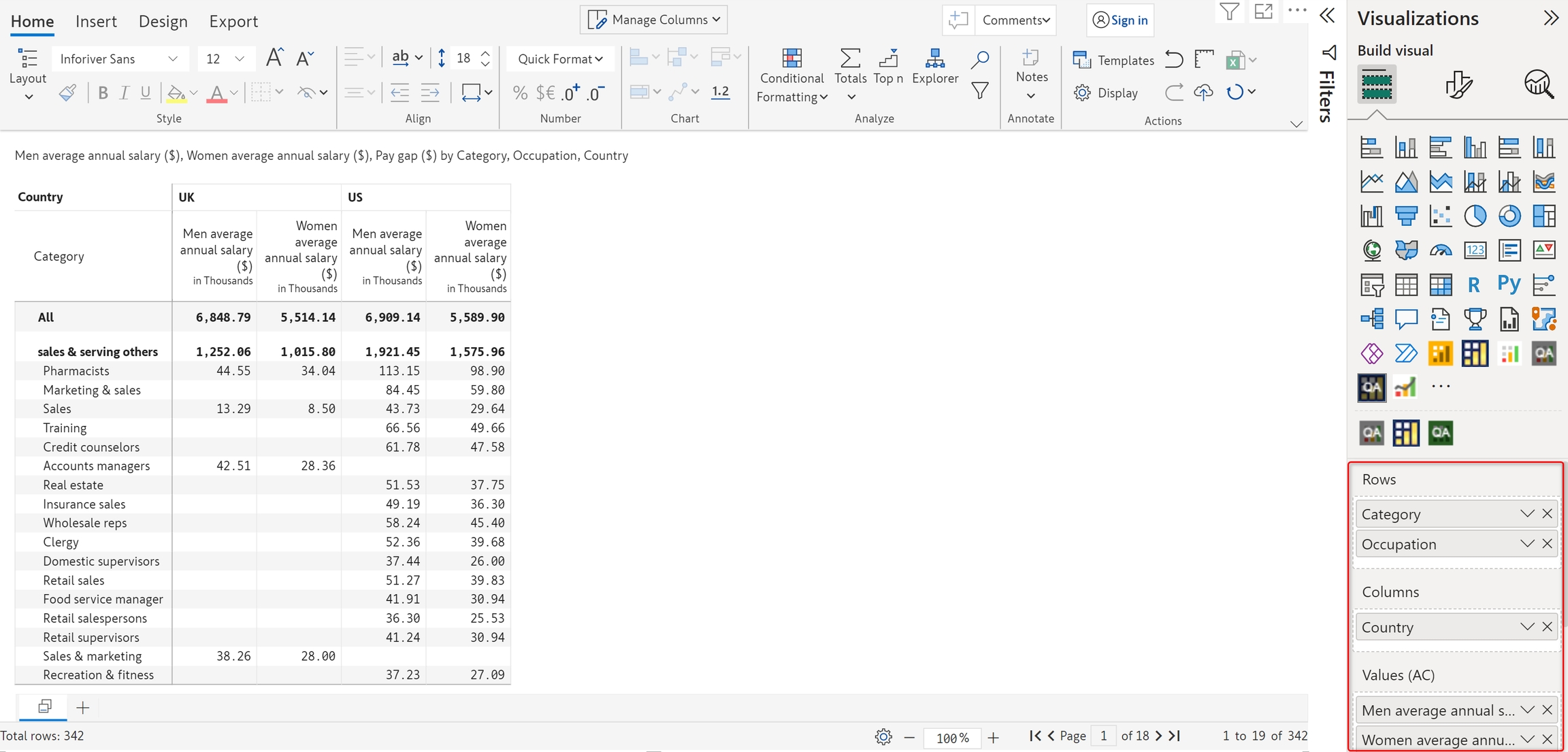 a) We have added 'Category' and ‘Occupation’ in the 'Rows' field, ‘Country’ in the ‘Columns’ field, and 'Men average annual salary' and ‘Women average annual salary’ in the 'Values (AC)' field in the visualization pane.