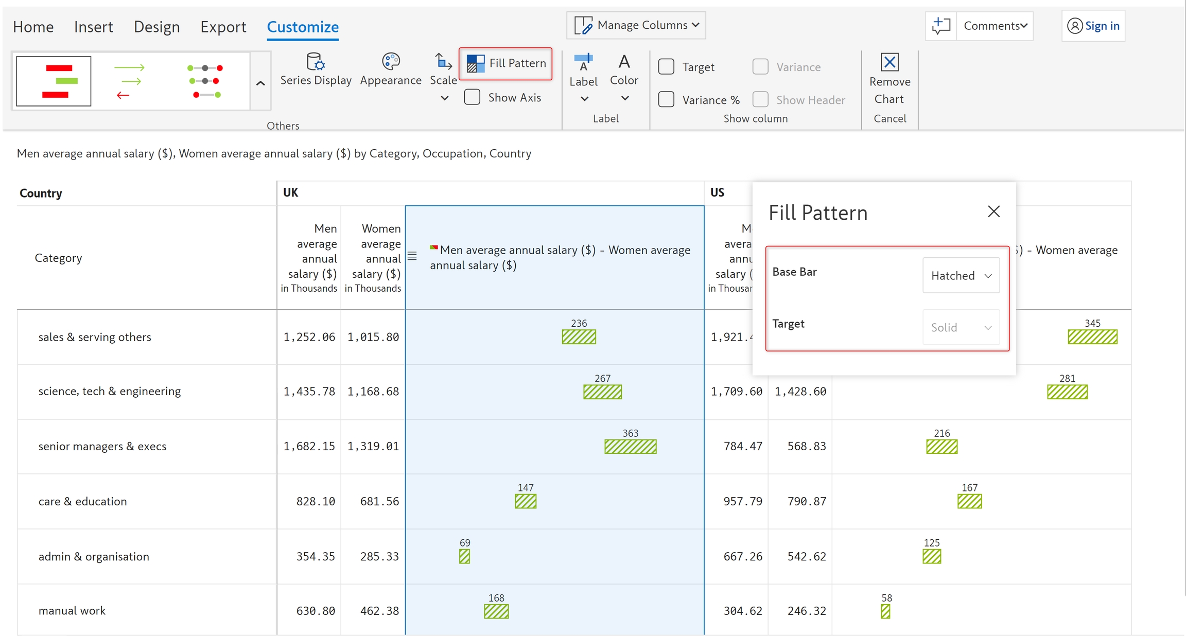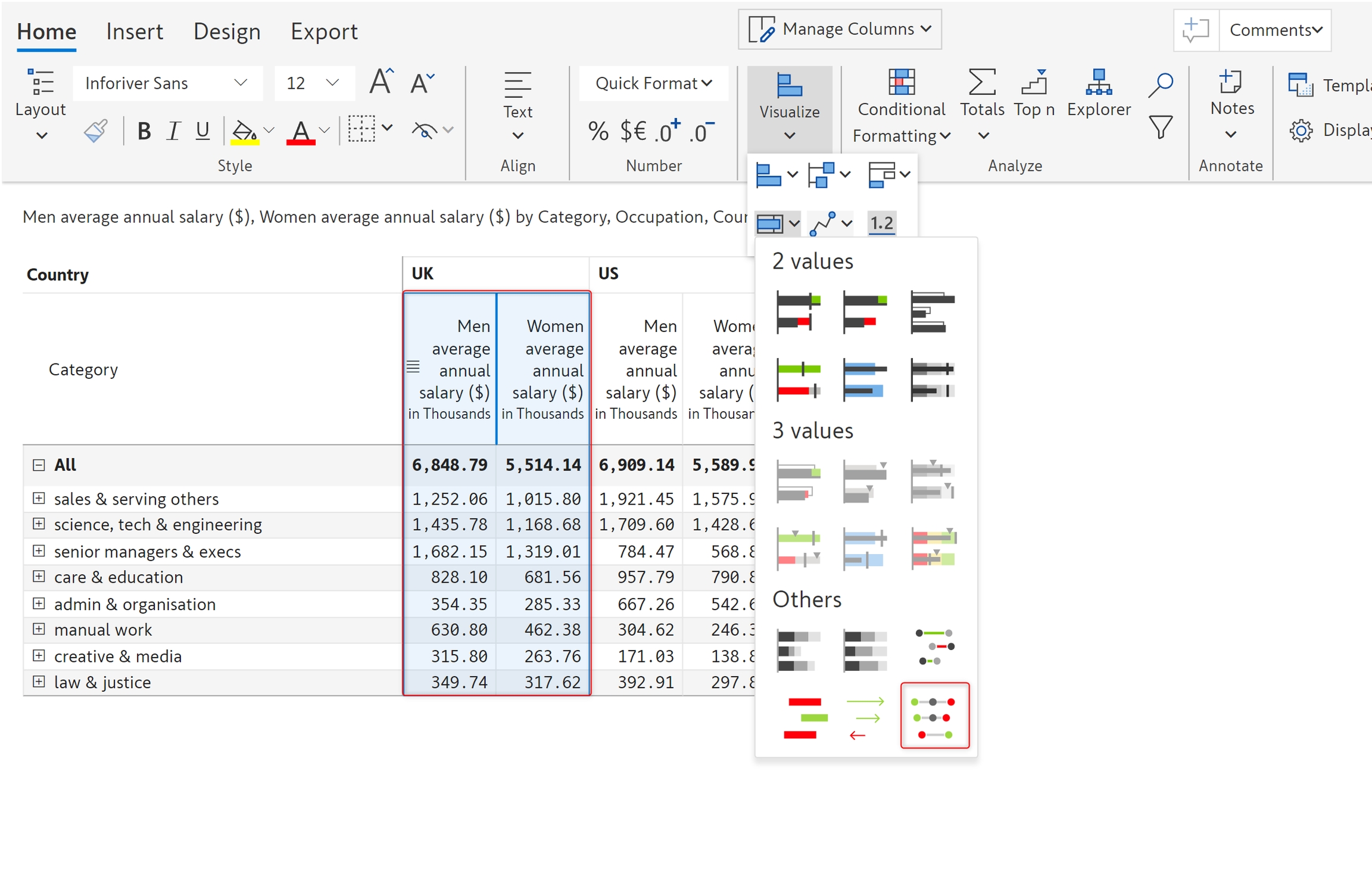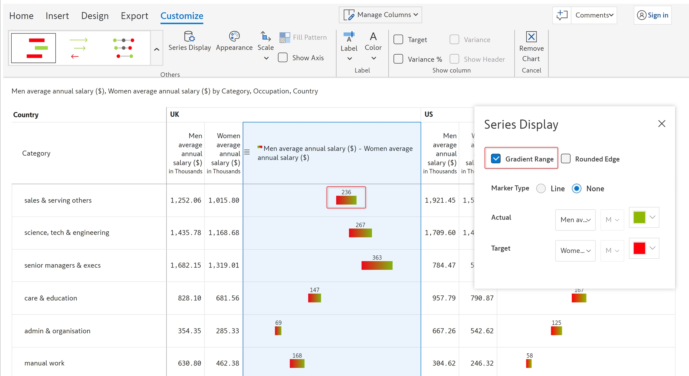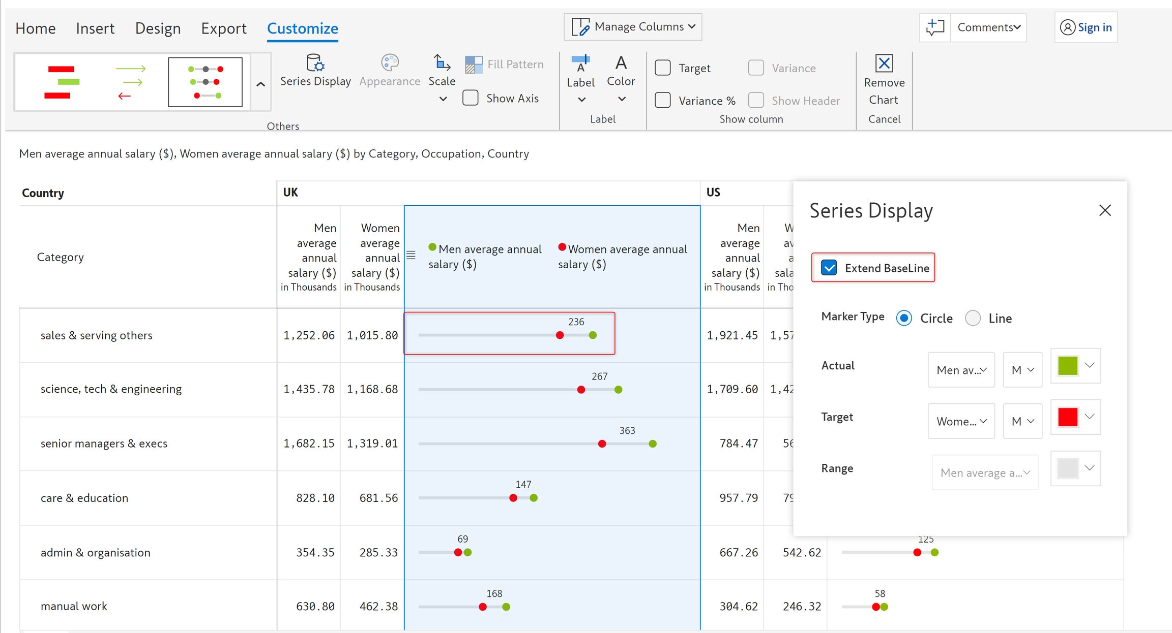In this example, let's visualize the pay gap between men and women in the UK and the US using a Dot plot.