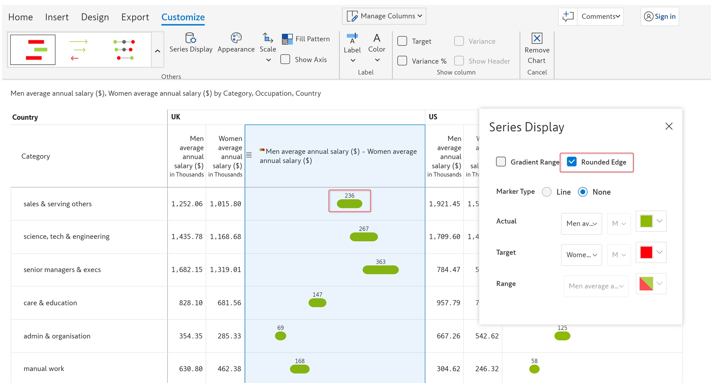 g) Rounded edge - Enabling this option will display rounded edges to the bars of the range and dumbbell plots.