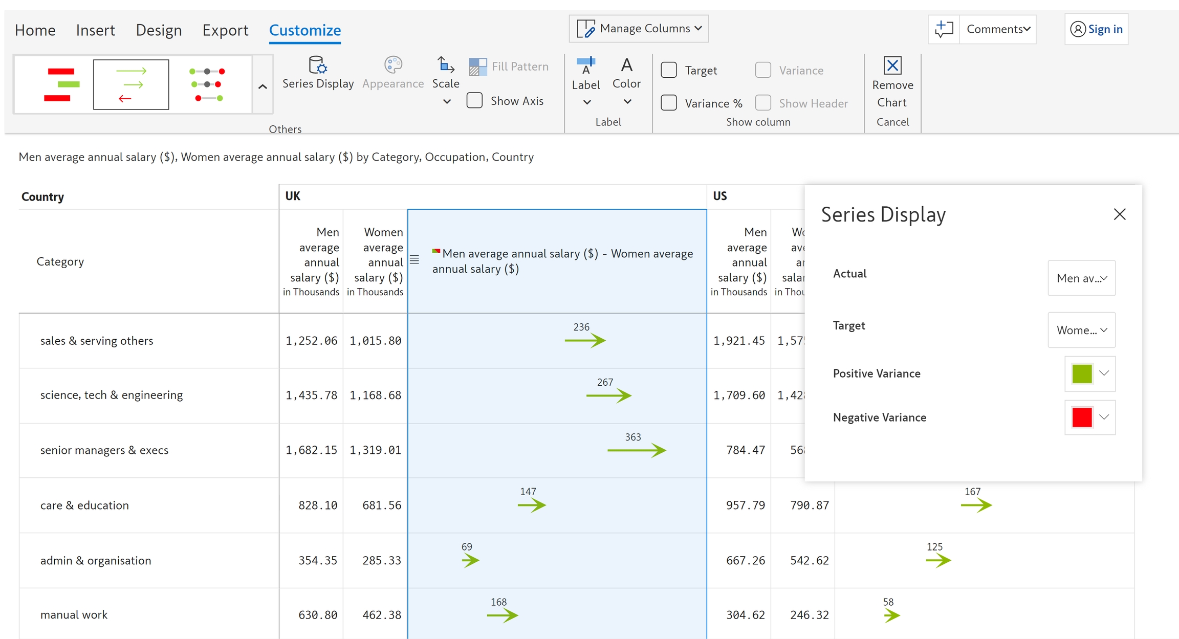 h) Positive variance and Negative variance - From this drop-down, you can select the arrow color for the positive and negative variances.