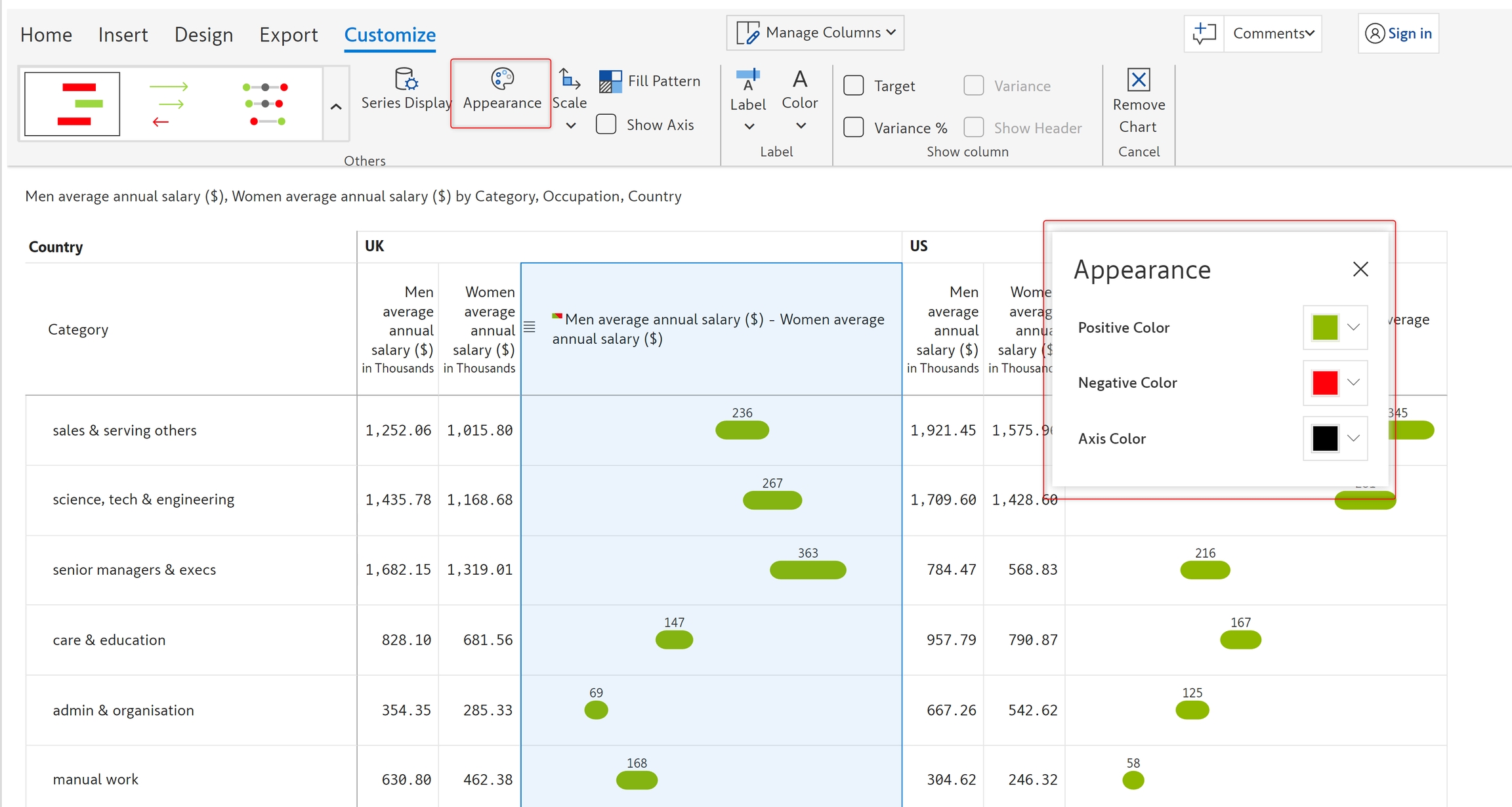 This option lets you change the appearance of the bar/pin charts. Clicking on this option will open up an Appearance model in which you can configure the following properties: