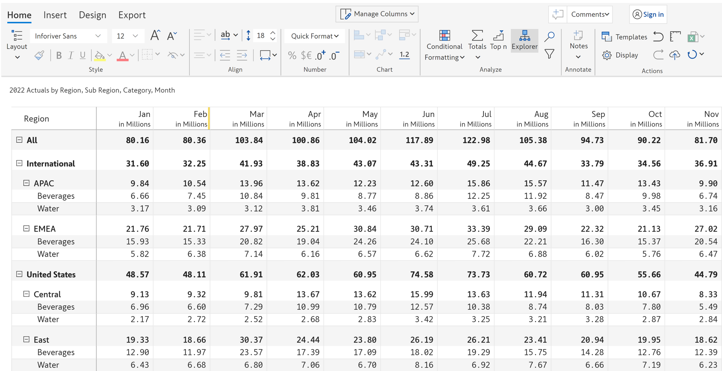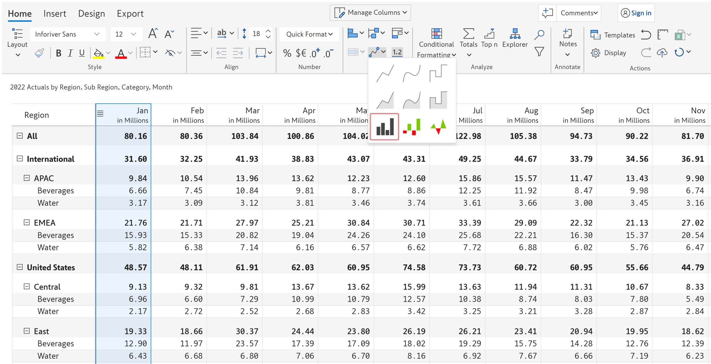 In this example, we have 12 months of data across regions and categories that we want to visualize using a column sparkline chart.