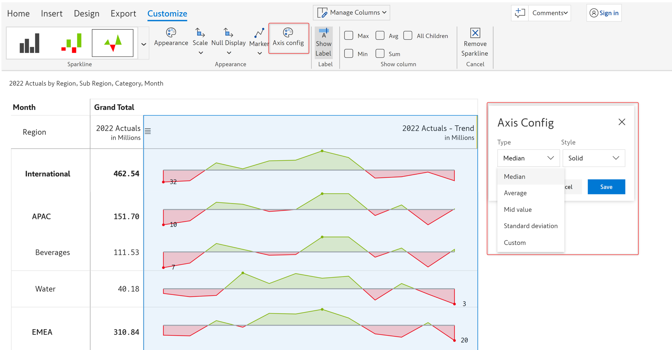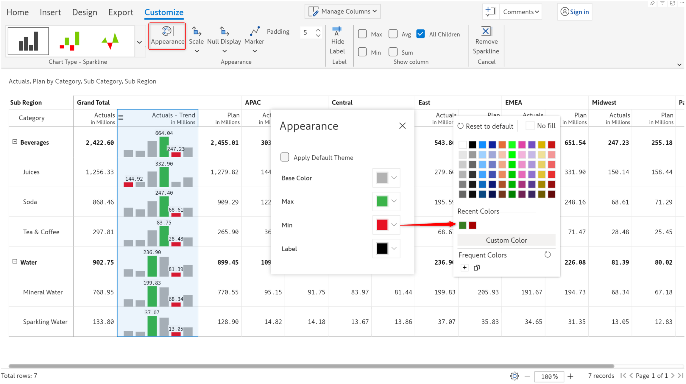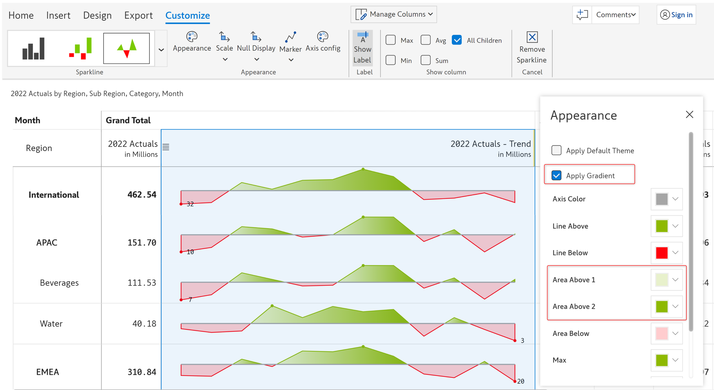STEP 3: The spark column appears in the grand total column, incorporating data for all the months. You can see the minimum and maximum values for each row highlighted in red and green. The Customize ribbon is enabled when you insert an inline chart.