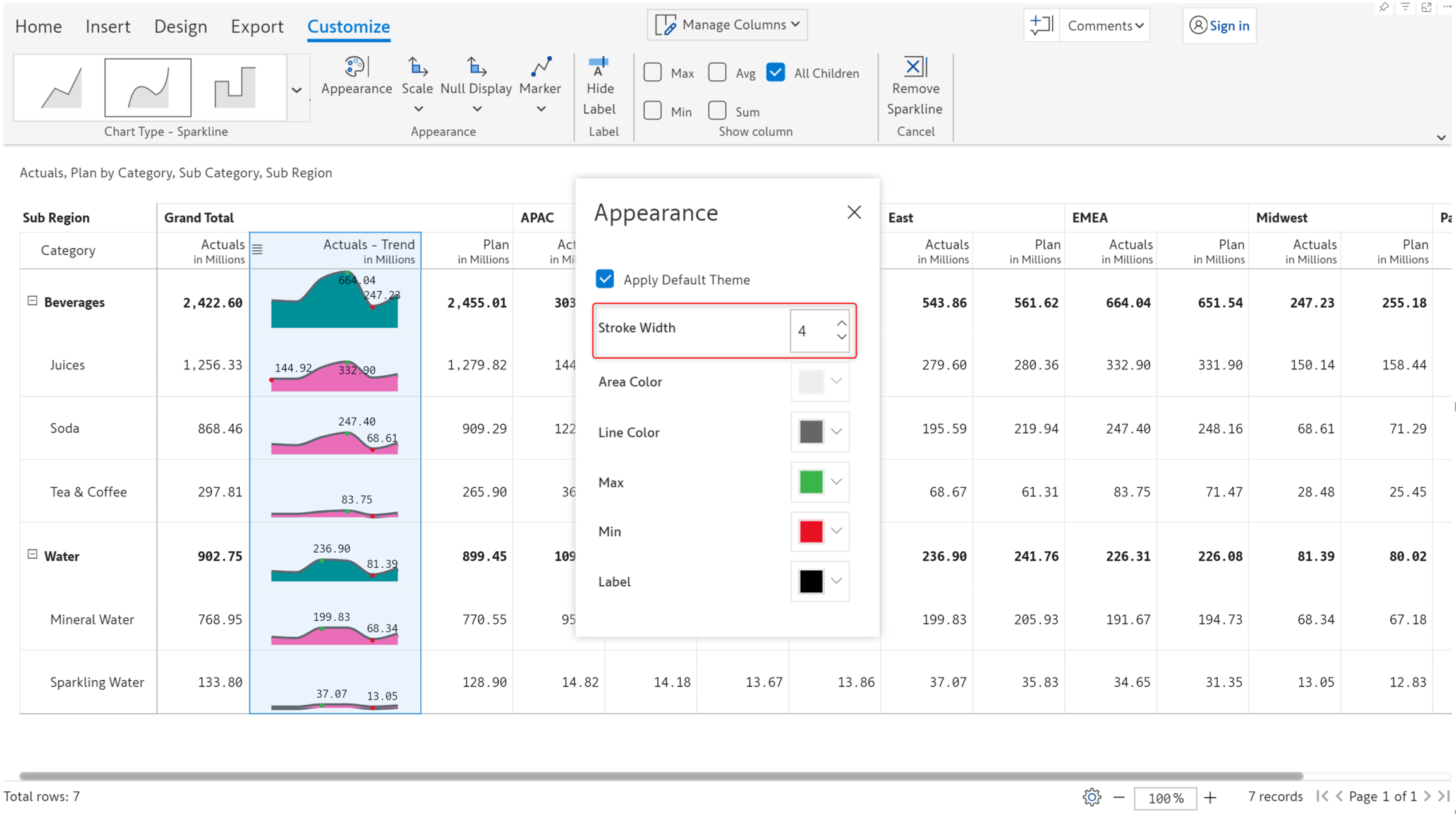 Inforiver Premium Table provides line, area, baseline, column, and win-loss sparkline charts.
