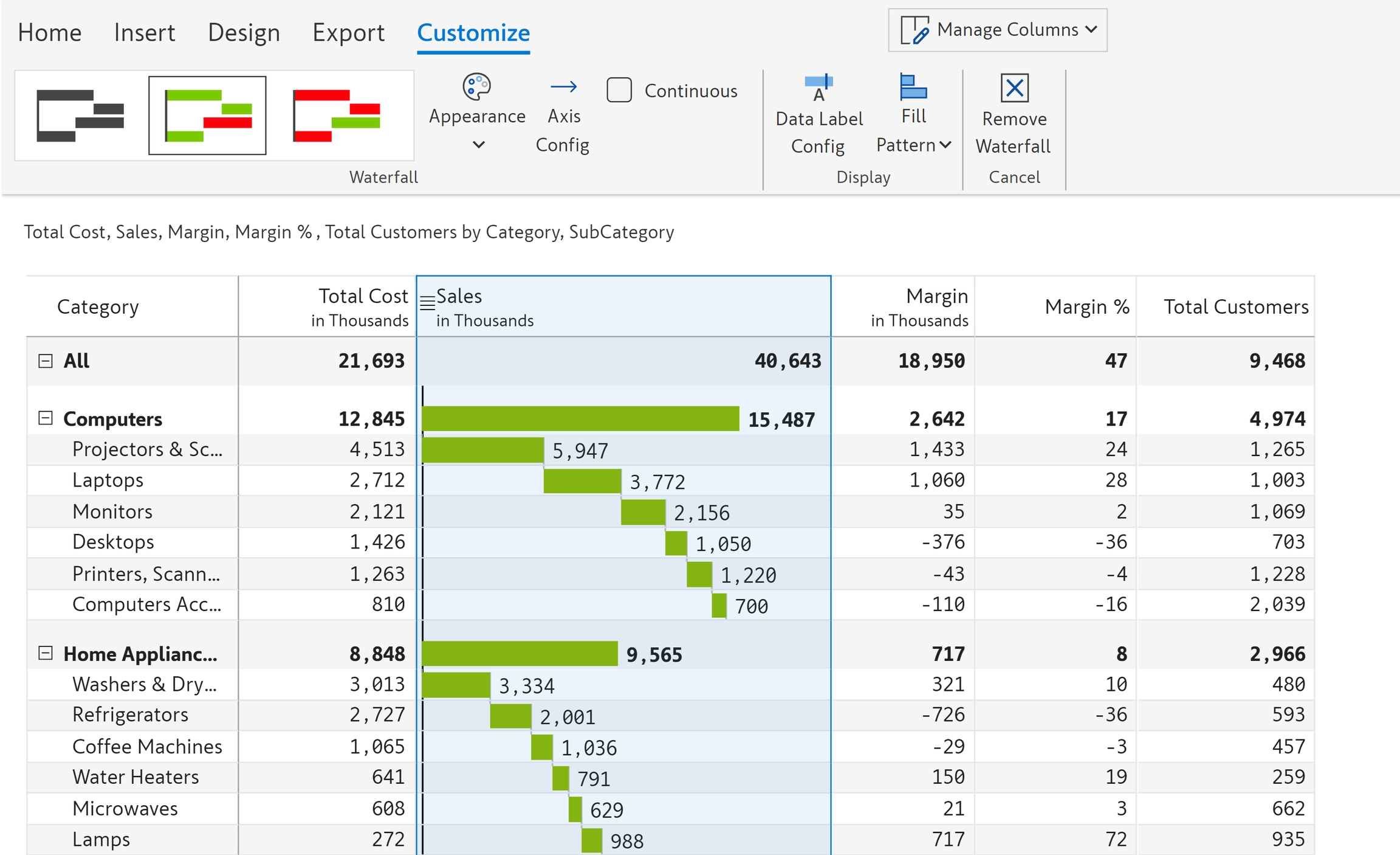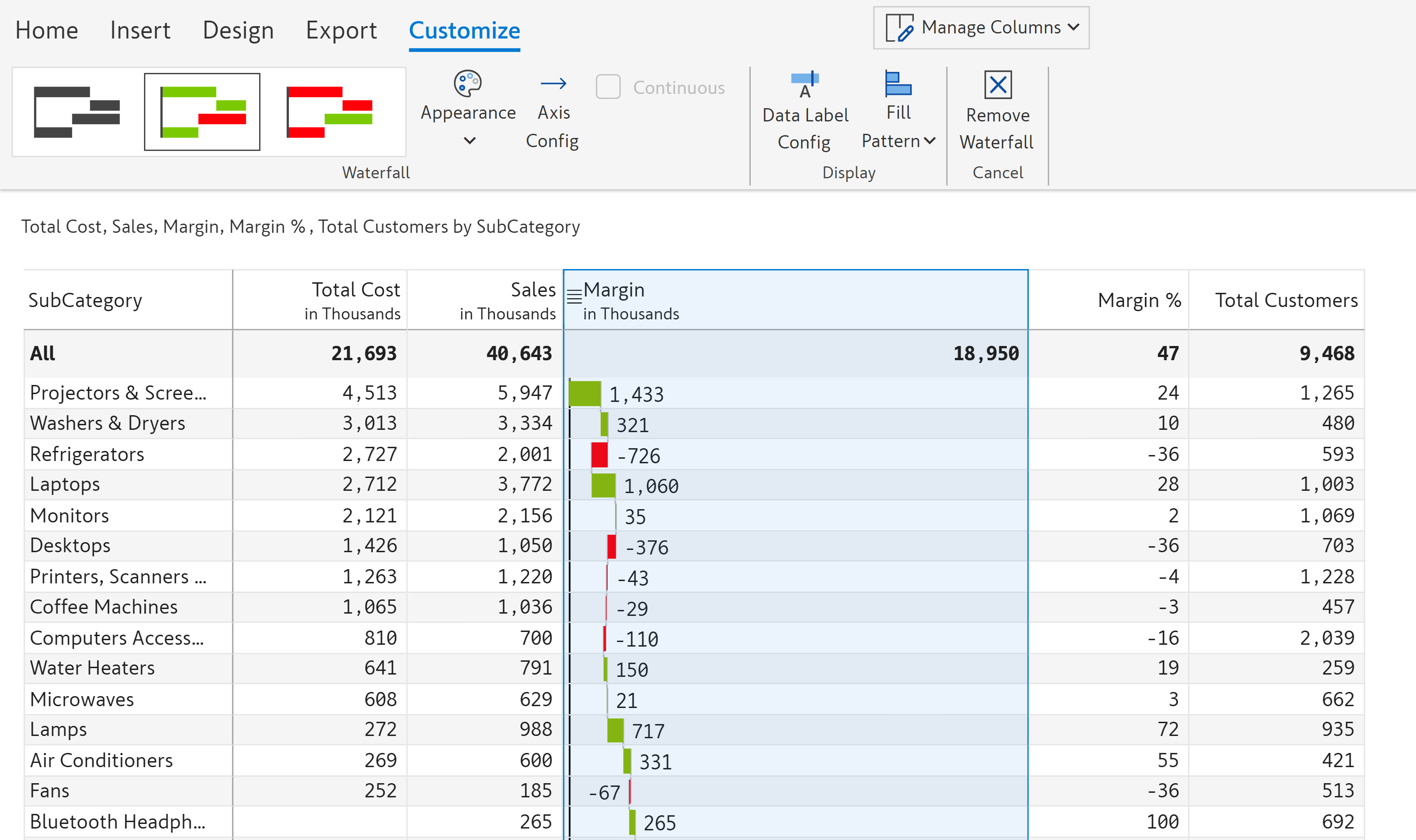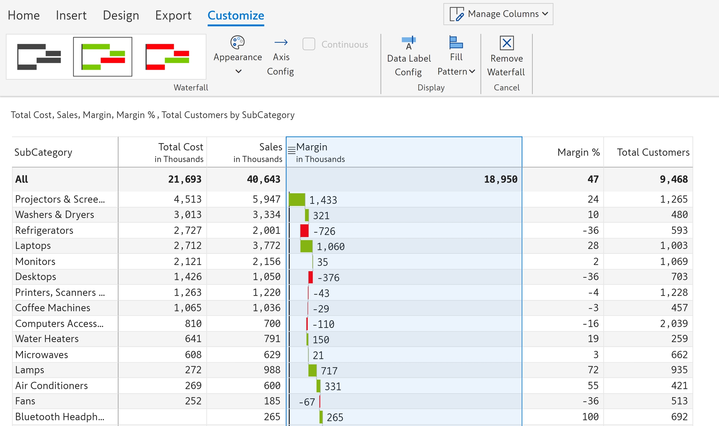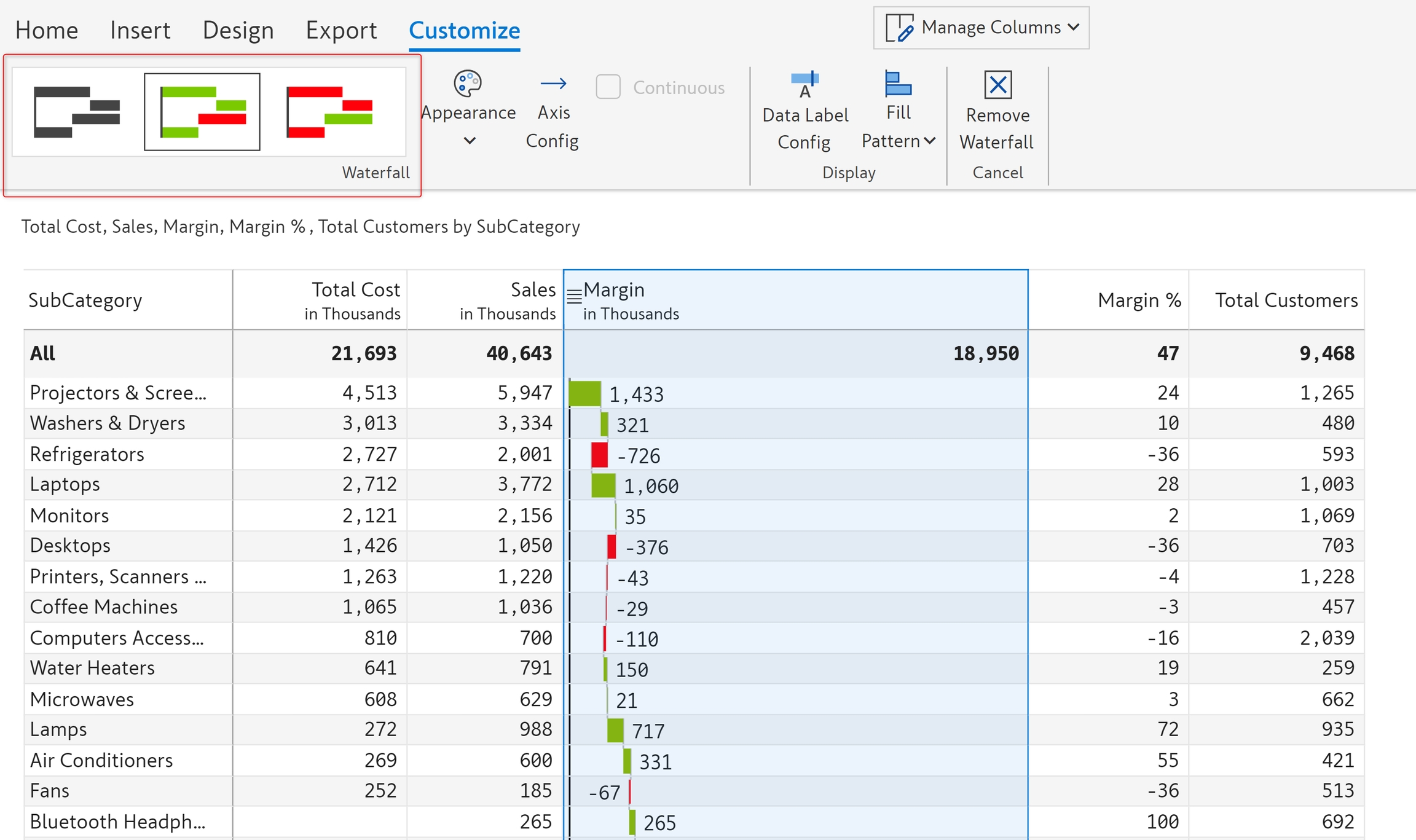 In this example, we will visualize the contribution of the subcategories to the total margin using a waterfall chart.
