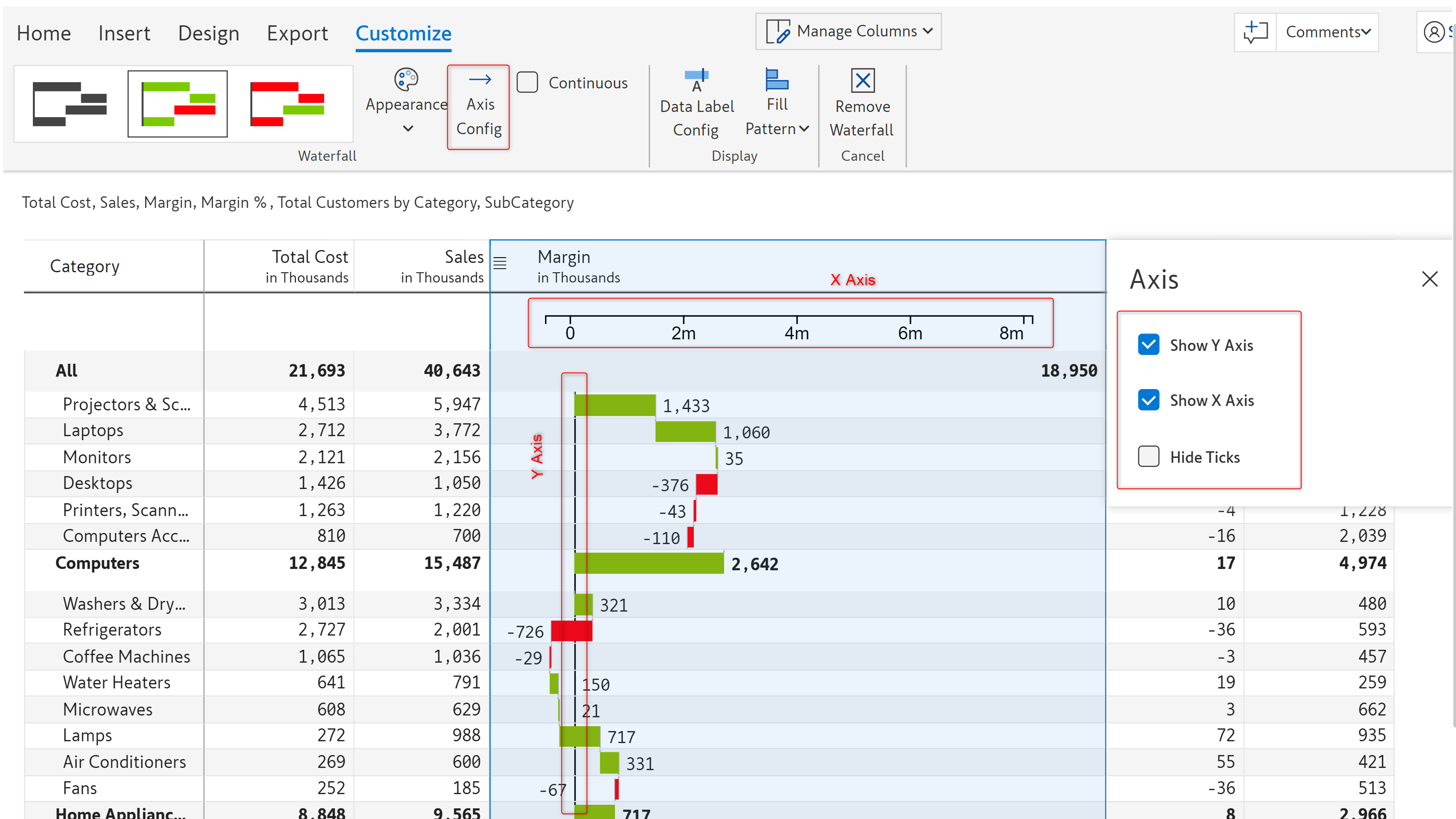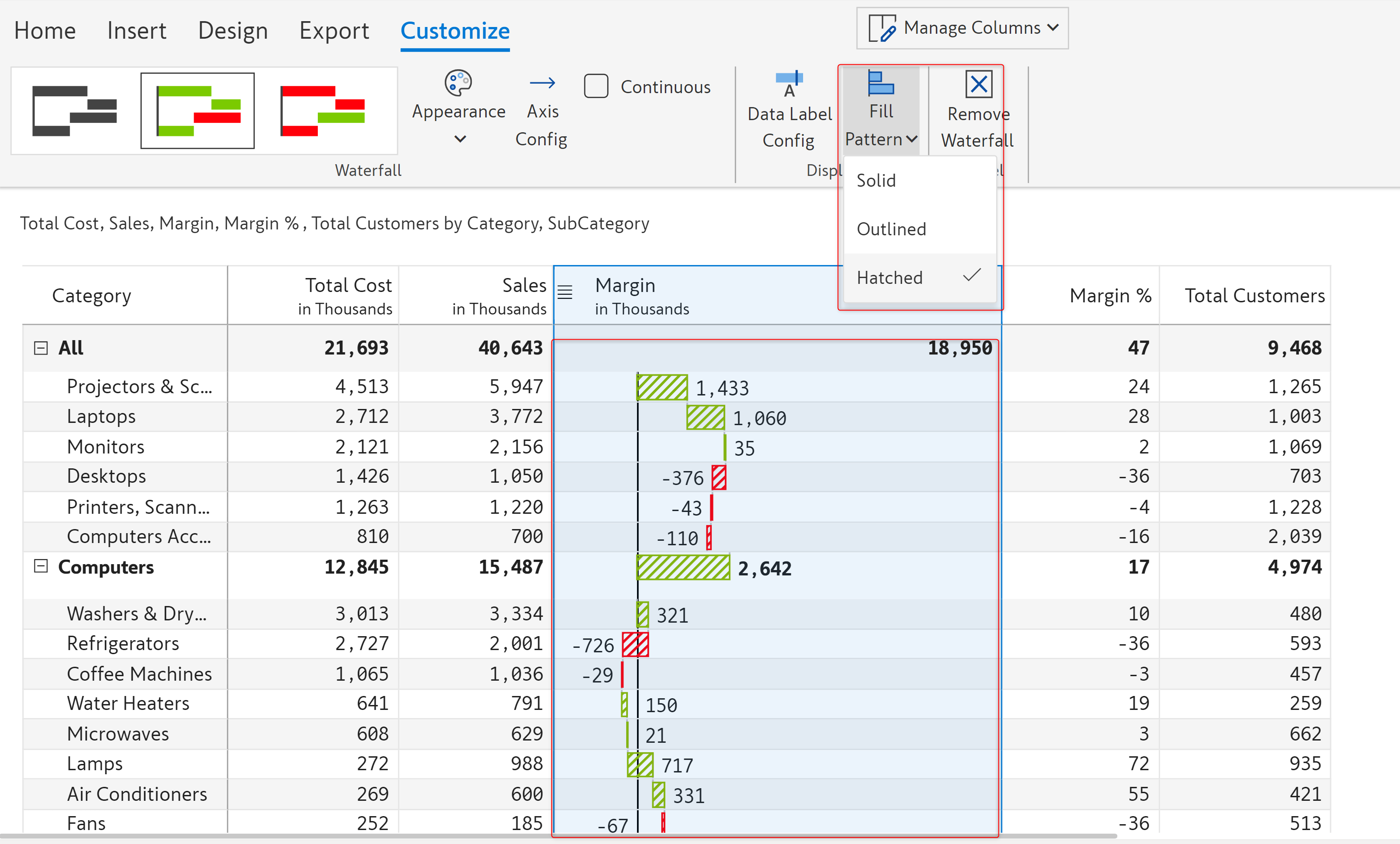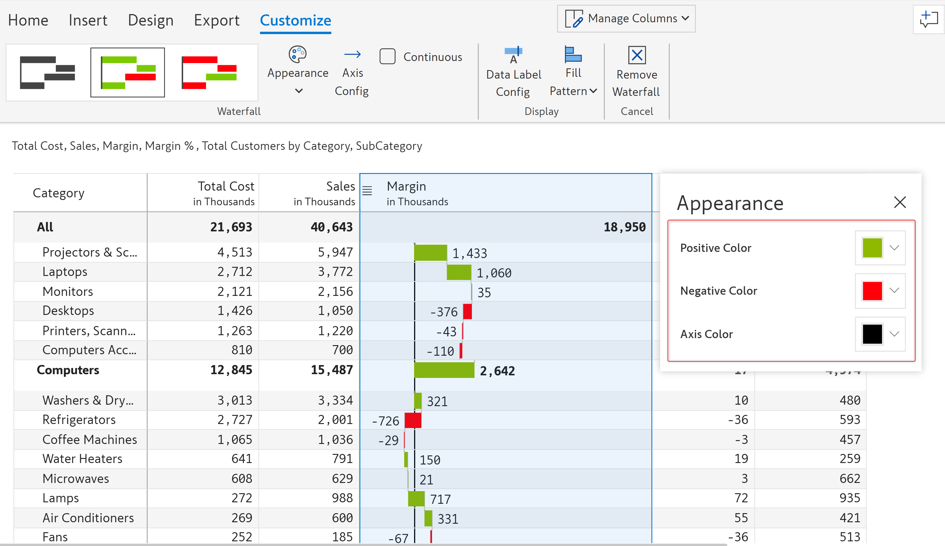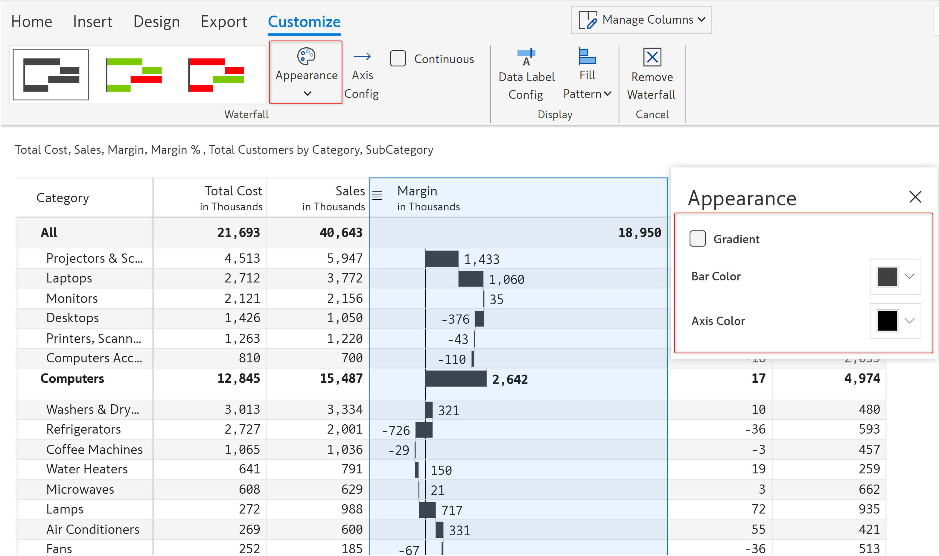 In this example, we will visualize the contribution of the subcategories to the total margin using a waterfall chart.