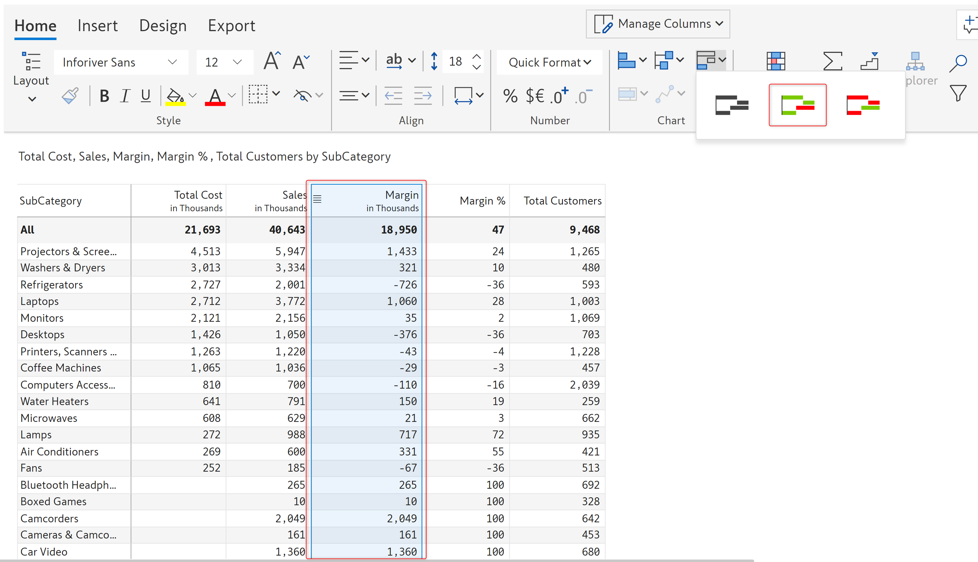 b) Select the column for which you want to insert the waterfall chart. In the following image, the margin column has been selected.