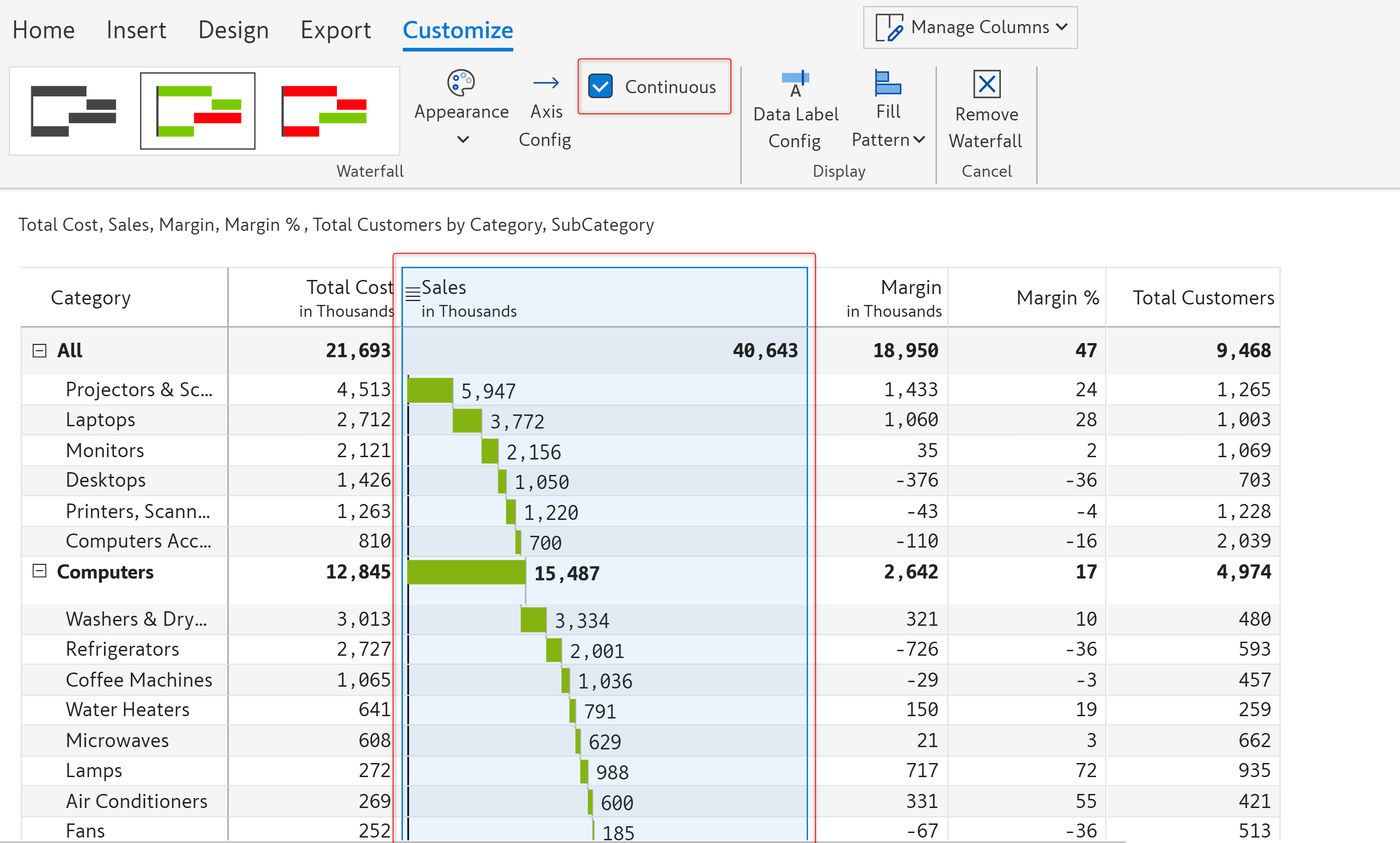 The continuous option now becomes available under the 'Customize' tab. Enabling this option will display a continuous waterfall chart as shown in the image below.