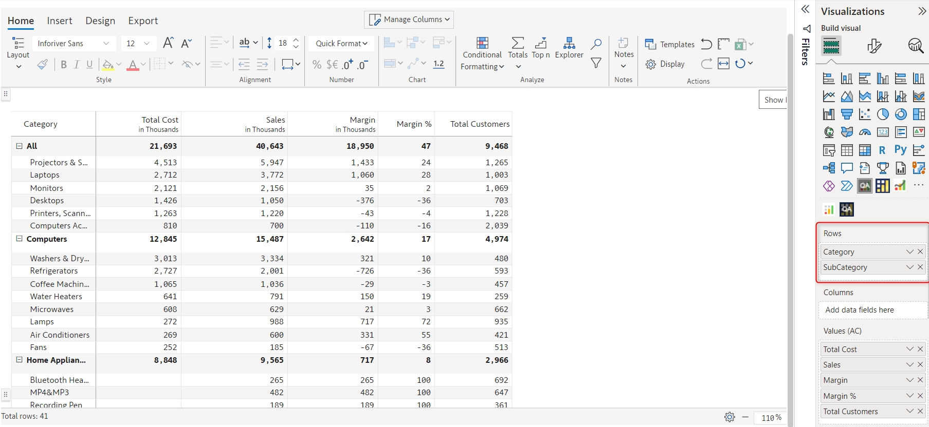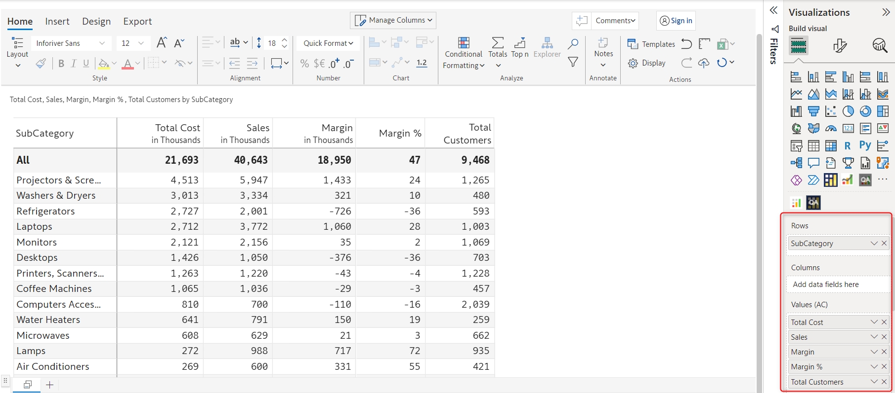 a) We have added 'SubCategory' in the 'Rows' field and 'Total cost', 'Sales', 'Margin', 'Margin %', and 'Total customers' in the 'Values (AC)' field in the visualization pane.