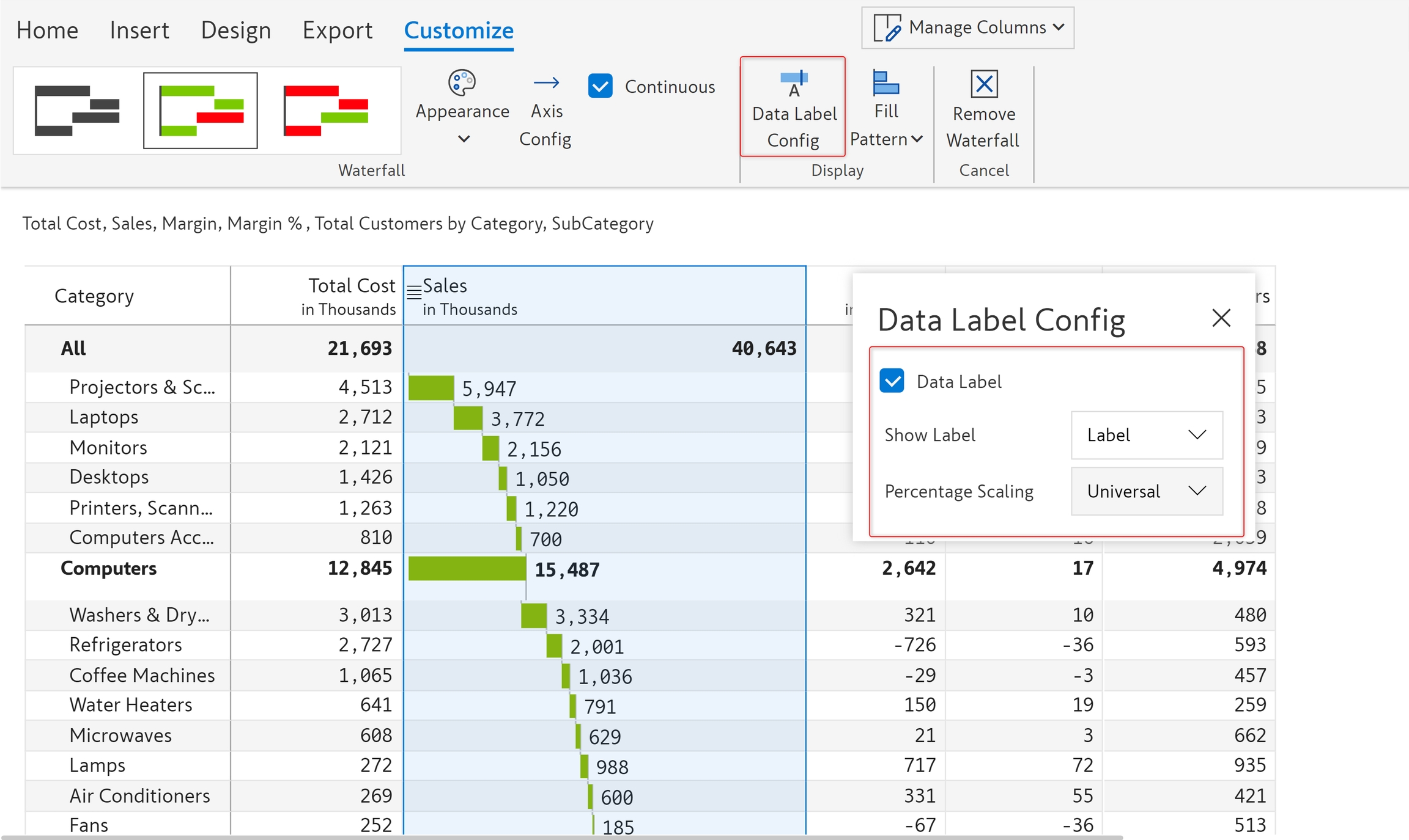 c) The waterfall chart gets inserted as shown below. You can see the 'Customize' tab in the toolbar and the following customization options.