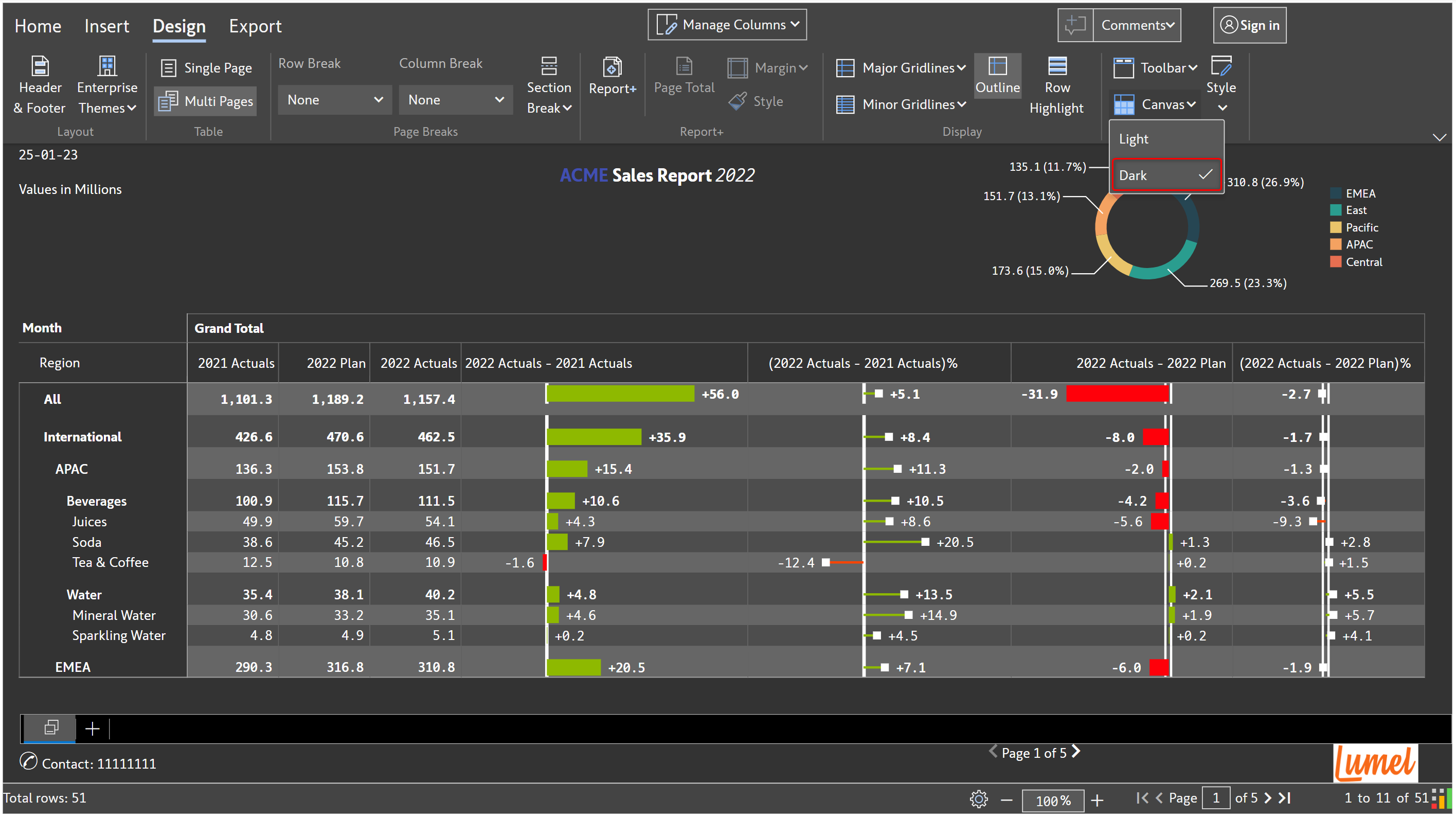 Inforiver offers dark themes for the toolbar and canvas which helps to reduce the strain on your eyes, conserve battery power and enhance the aesthetic appeal of your reports. You can also customize text color, header text color or canvas style.&#x20;