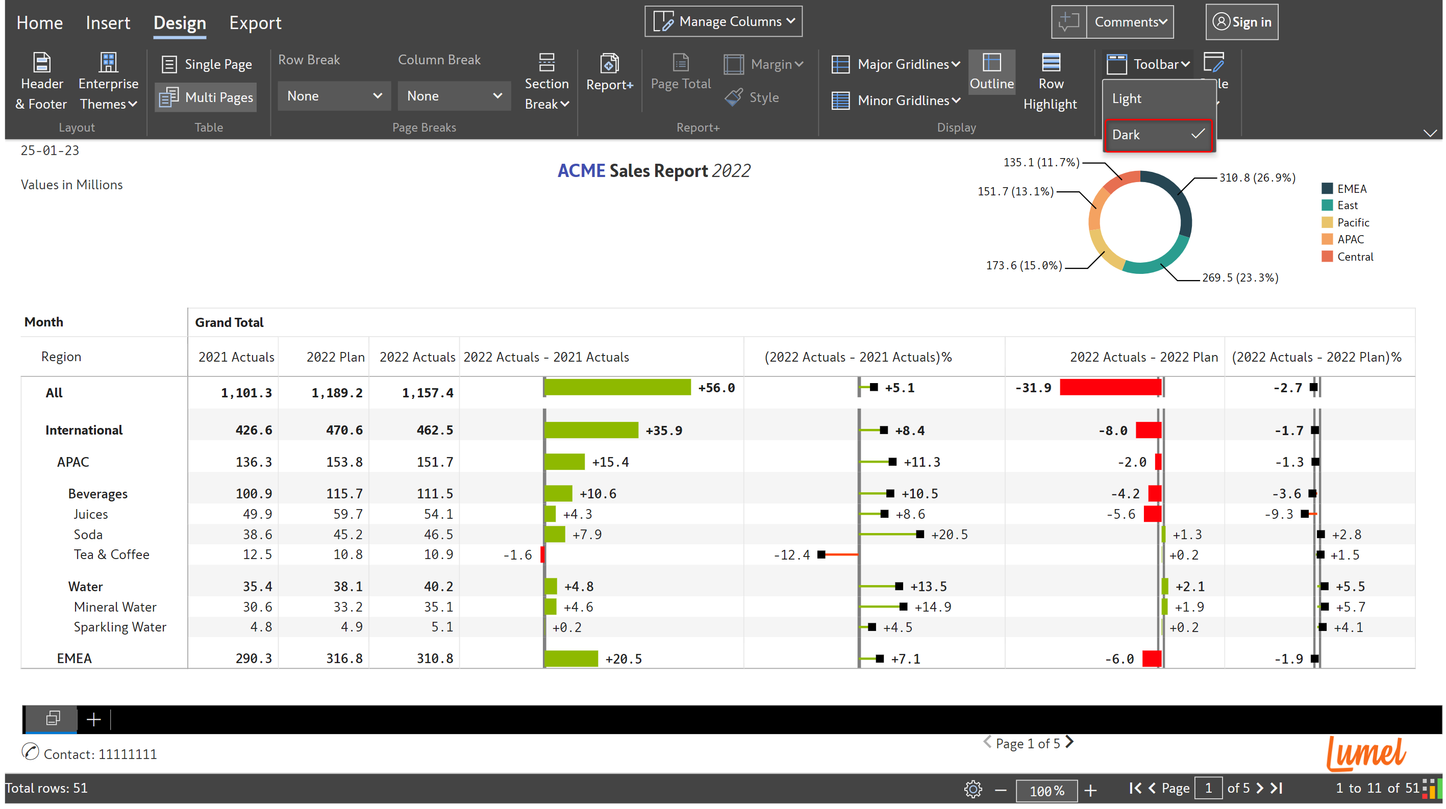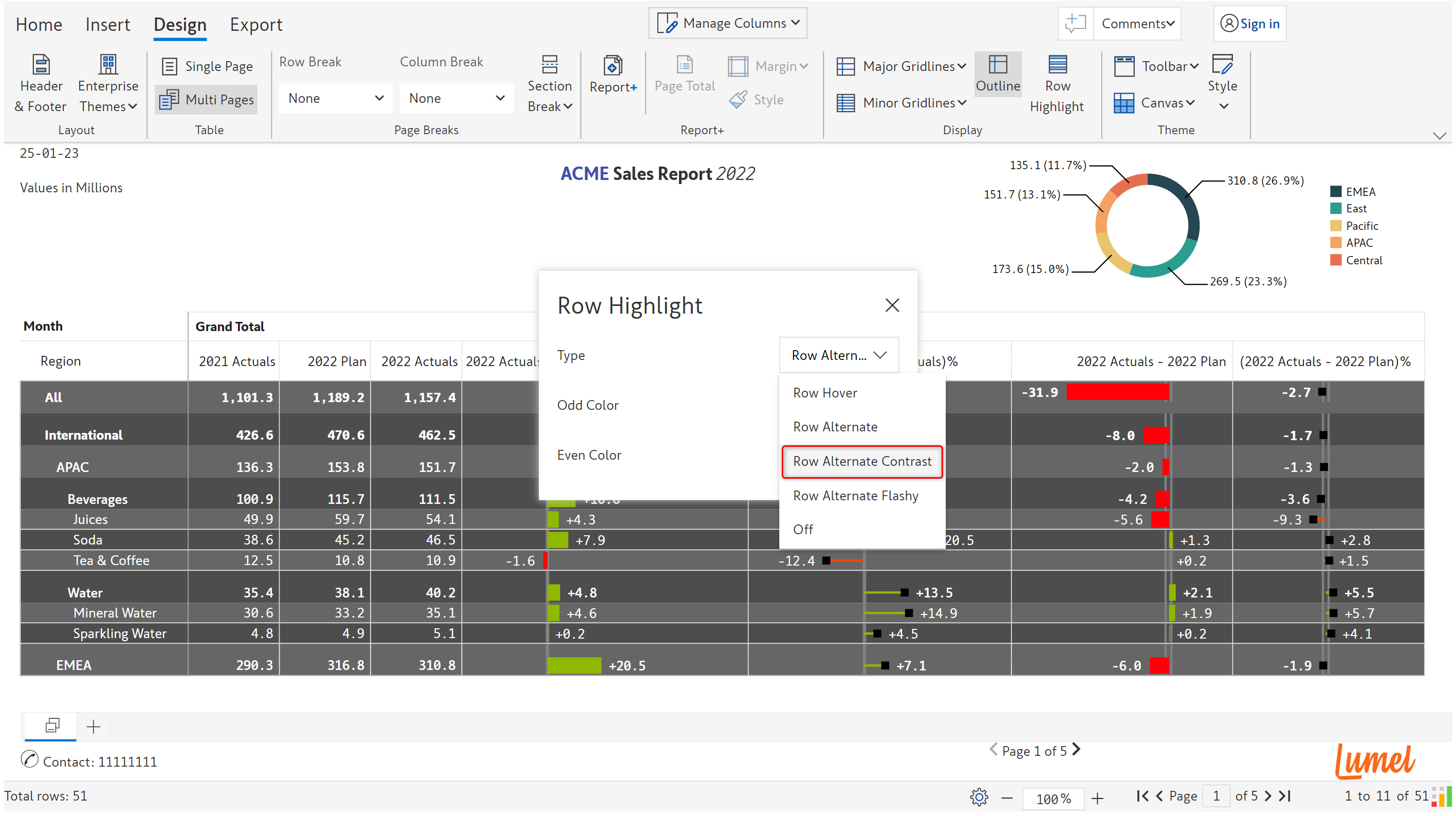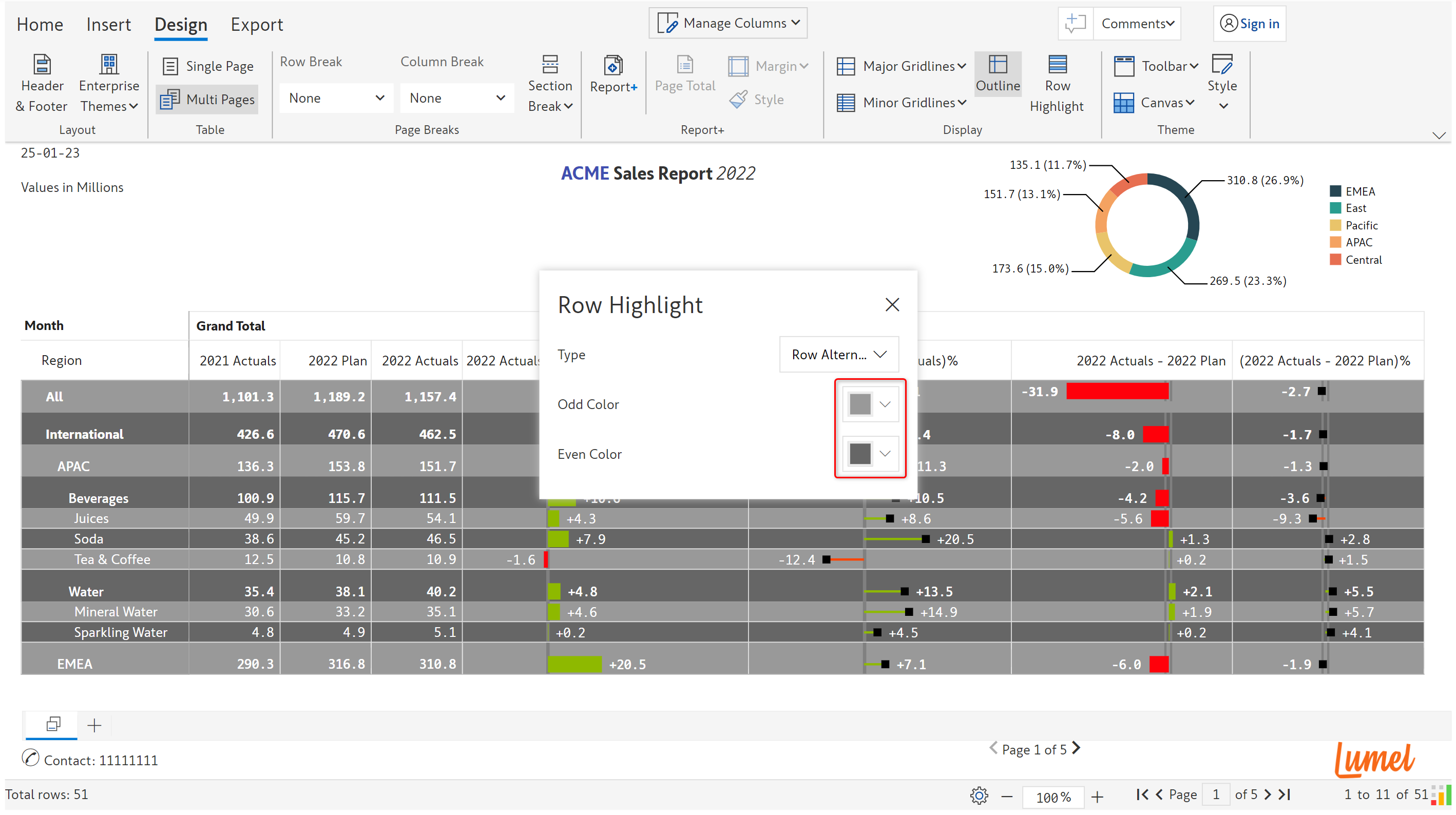 Several customization options that are part of the [Display settings](https://docs.inforiver.com/premium-table/display-settings/general-settings) are also available in the 'Design' tab of the toolbar for improved usability. These are highlighted in the image below.