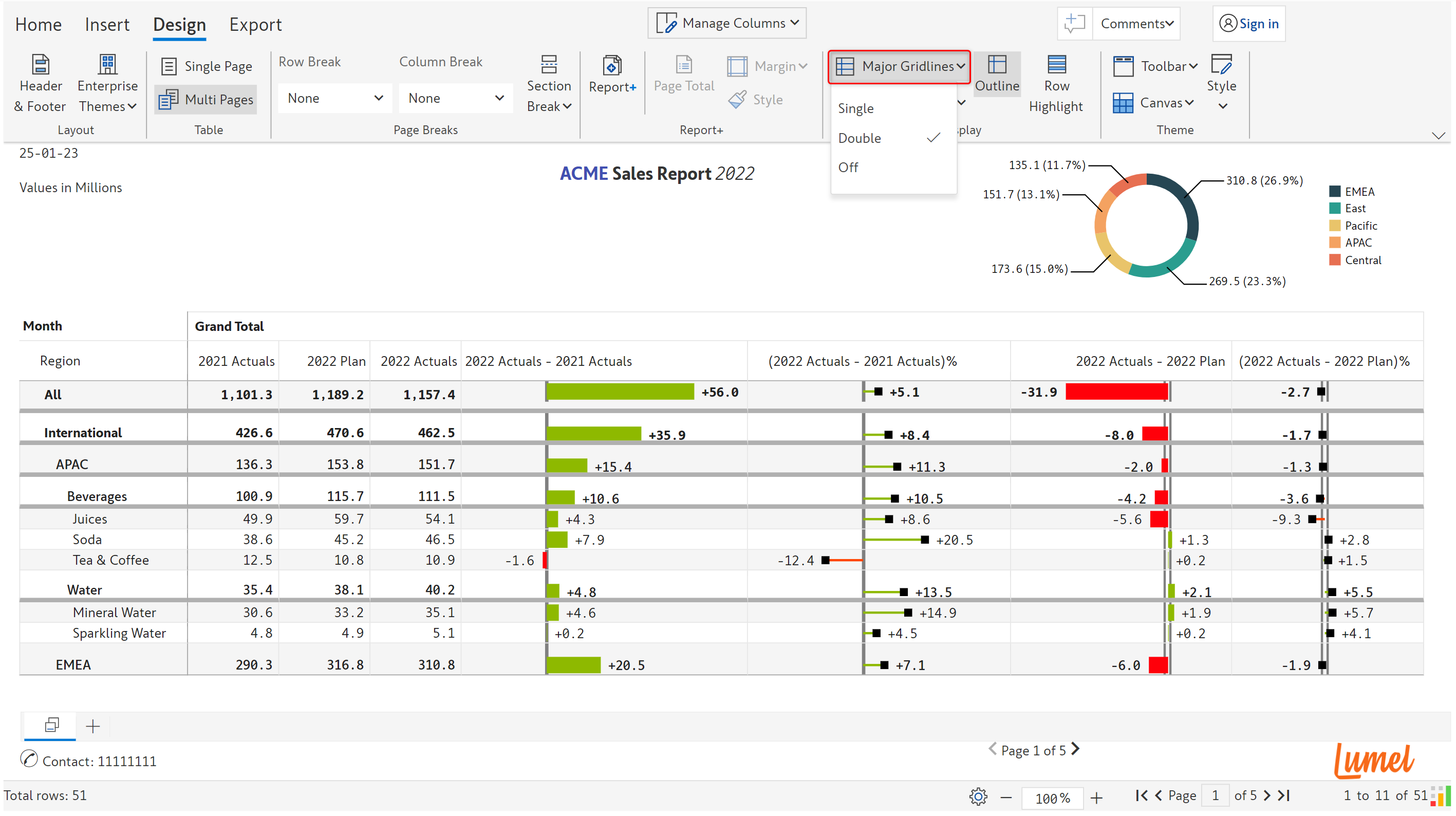 Major gridlines are single or double underlines shown for the parent rows. In the below image, we have selected the 'Double' option in the 'Major gridlines' option. To change the color of the gridline, go to the 'Home' tab -> 'Display' -> General.&#x20;