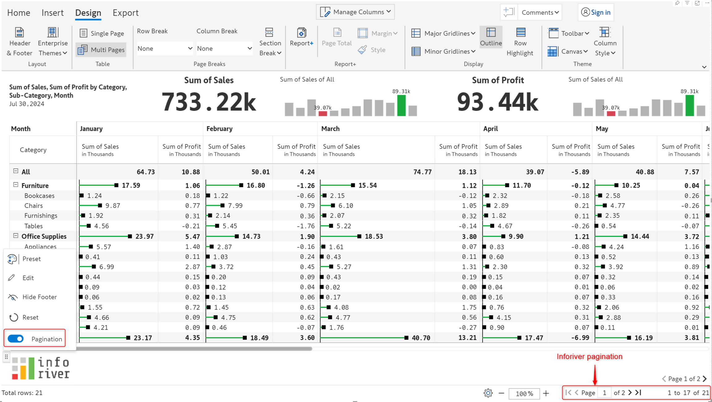 STEP 3: The footer displays the page number by default. You can disable the Inforiver pagination using the Pagination toggle from the context menu.