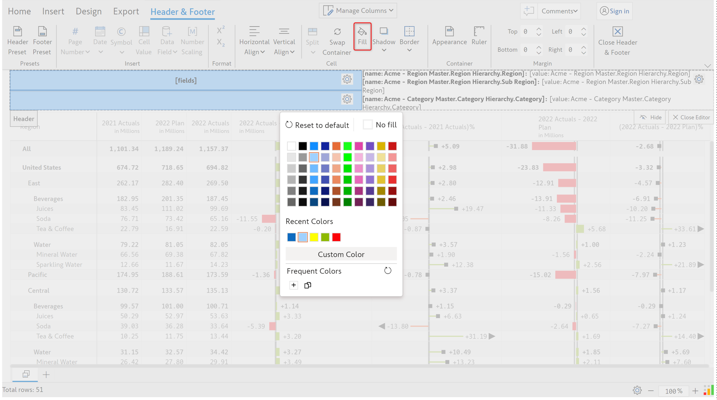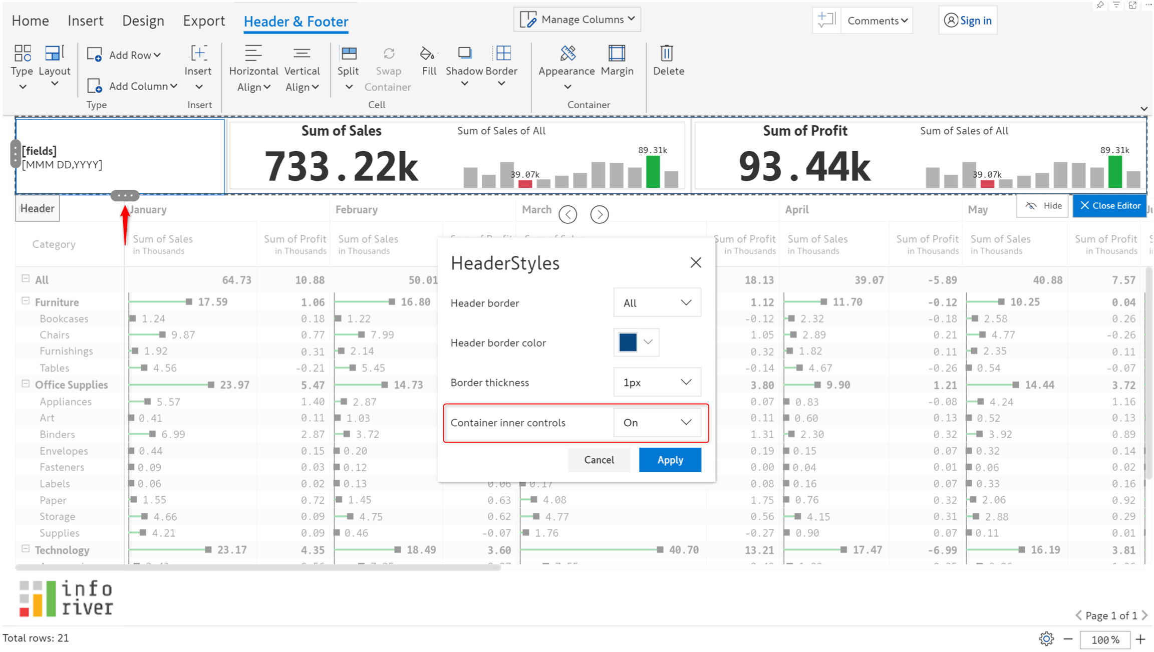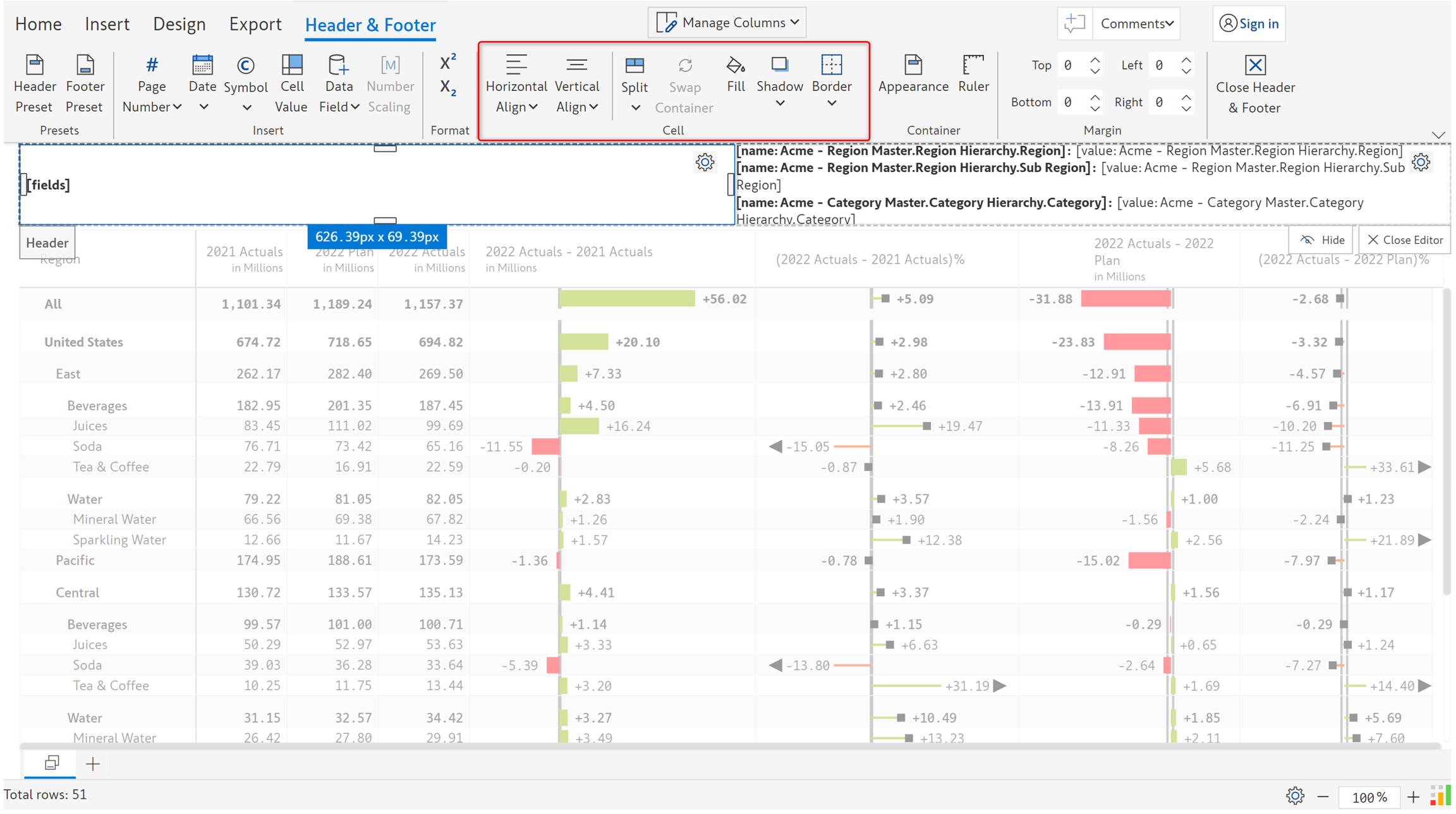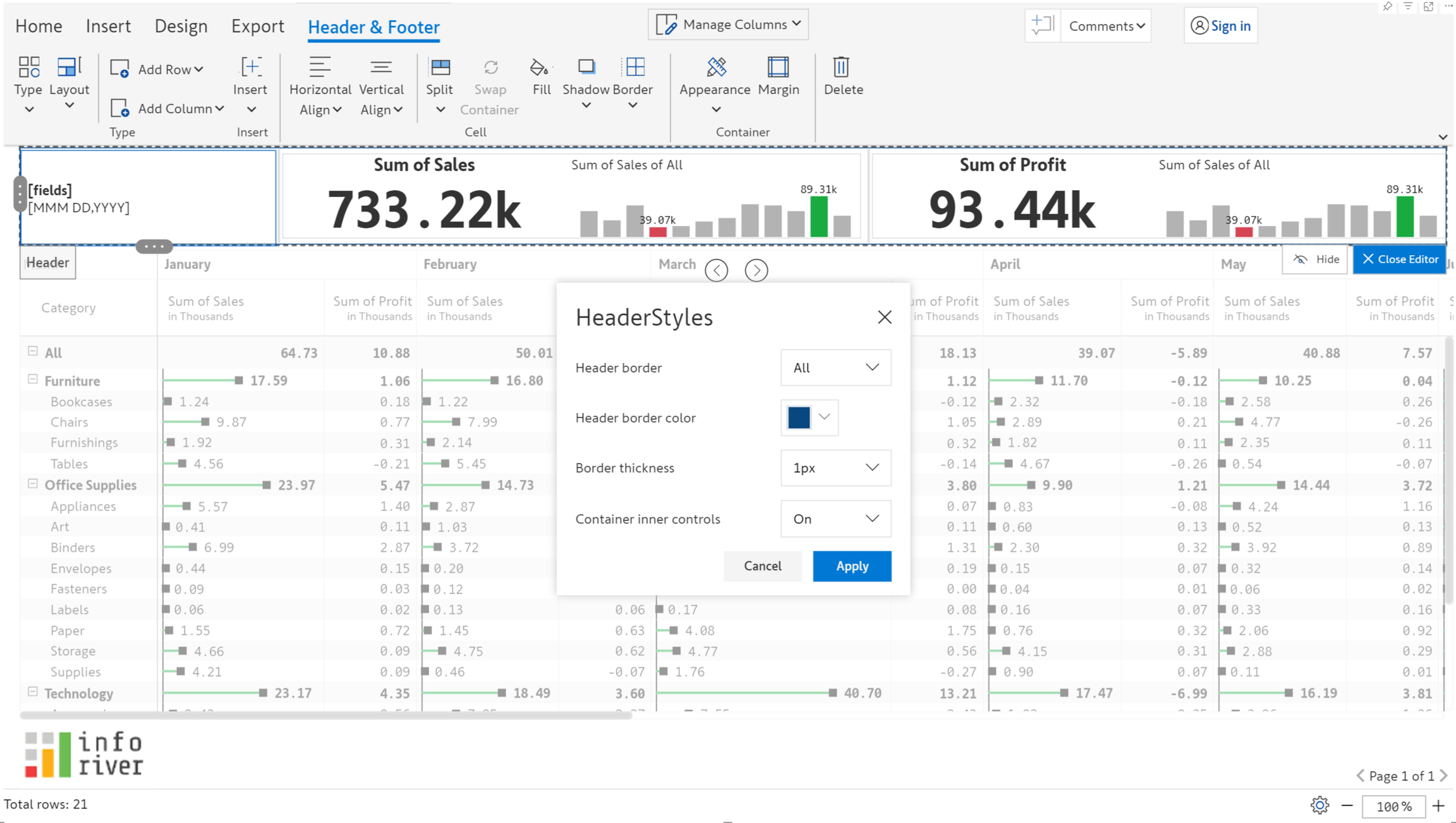 The header and footer in business reports provide a consistent way to identify the content, promote the company's brand, and ensure that important information is easily accessible. Inforiver Premium table offers powerful header & footer customization capabilities and can be used to show charts, KPIs, images, and text.