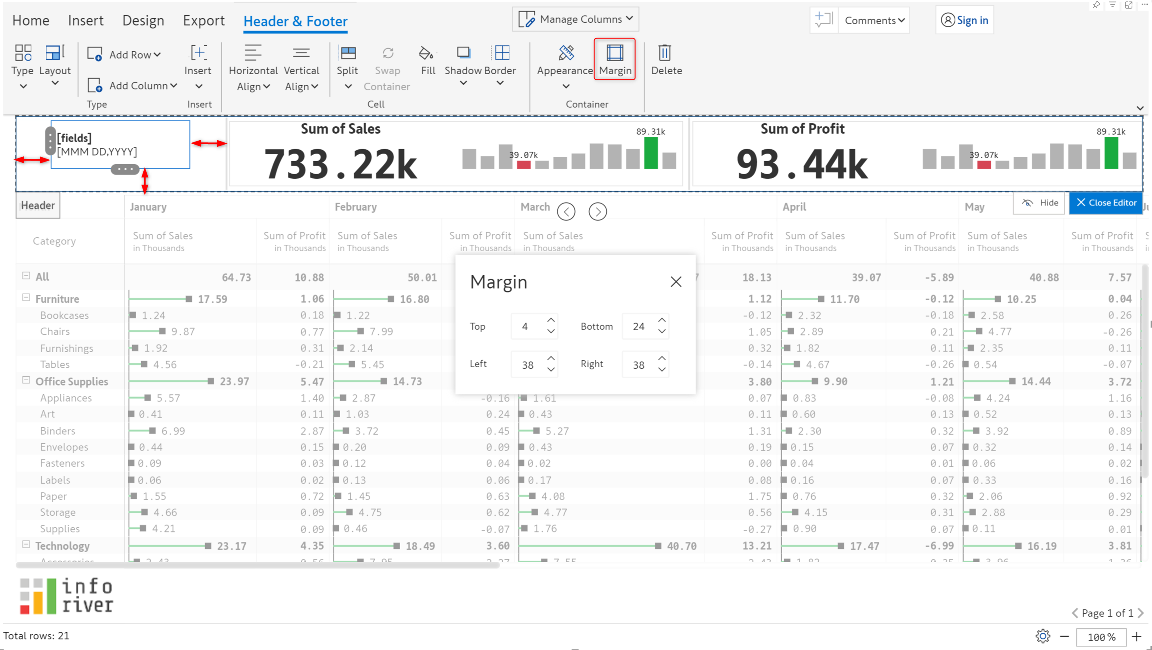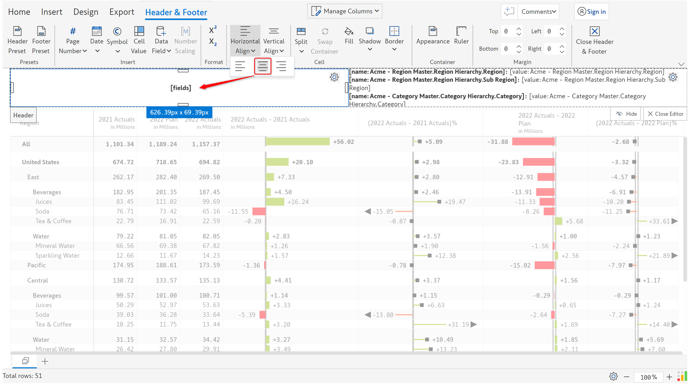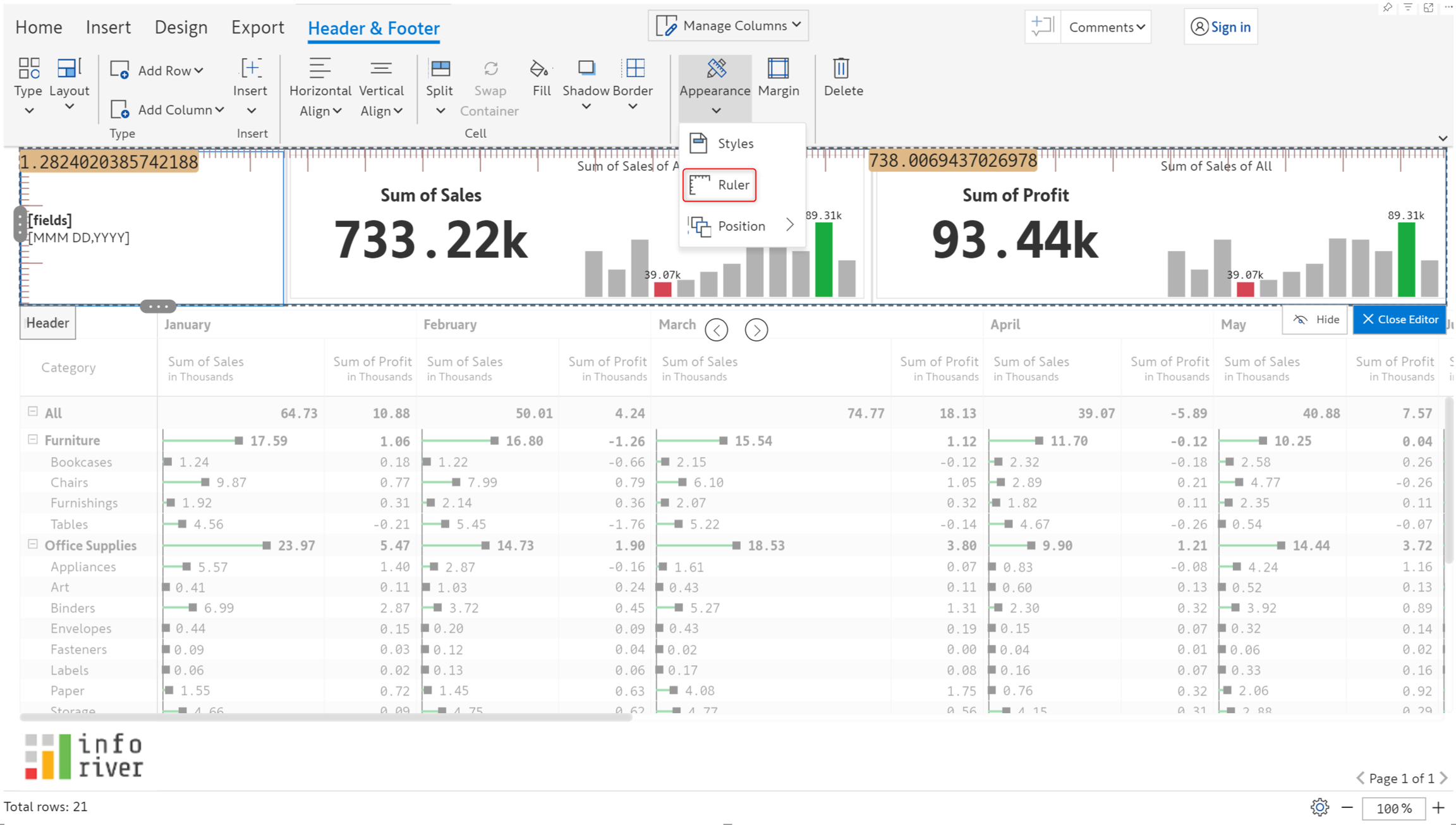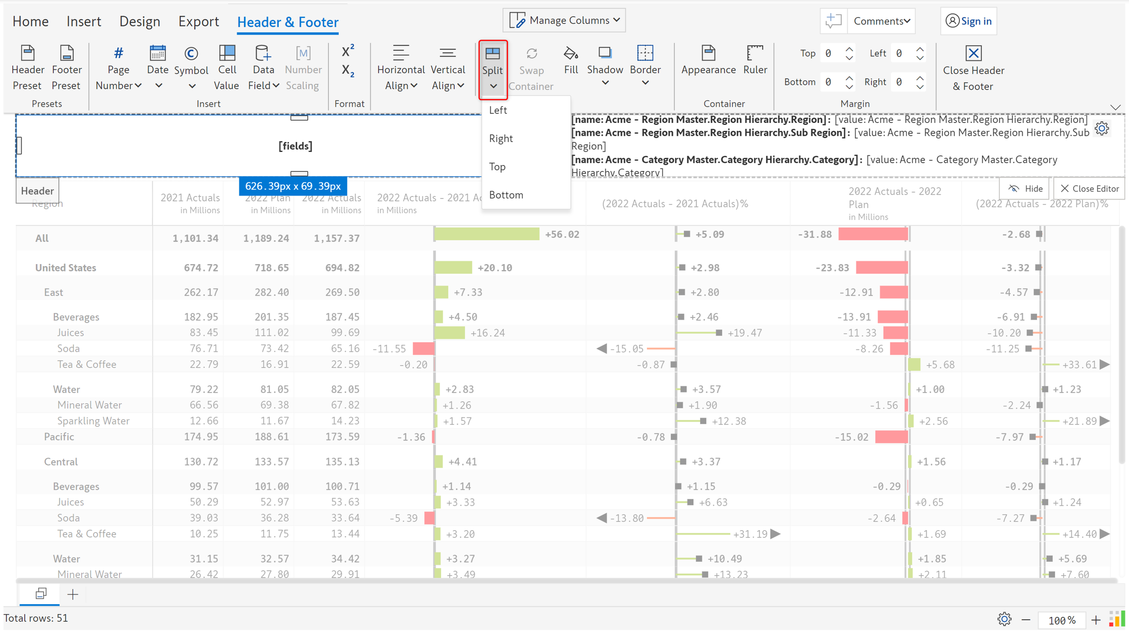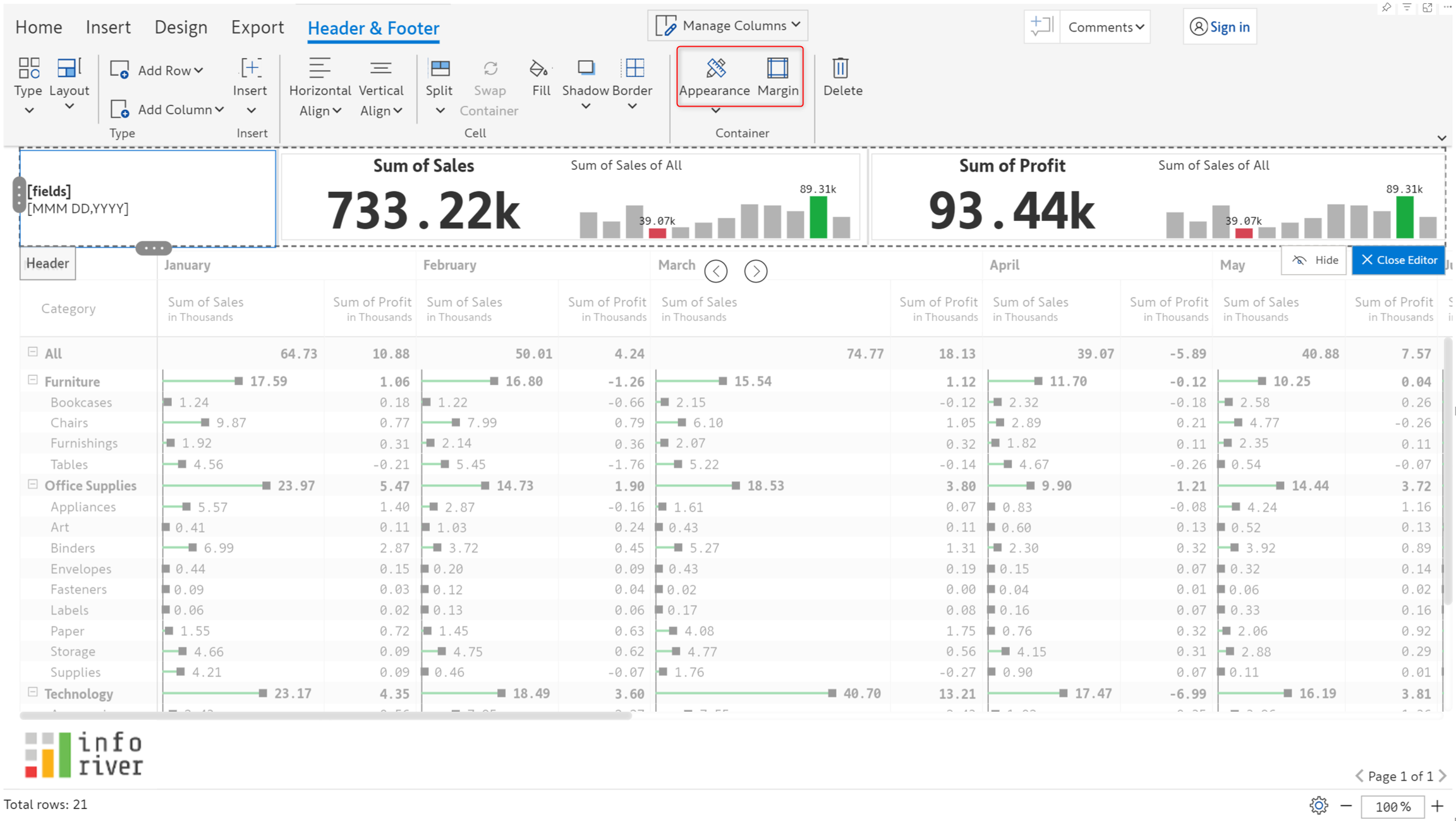 The header and footer in business reports provide a consistent way to identify the content, promote the company's brand, and ensure that important information is easily accessible. Inforiver Premium table offers powerful header & footer customization capabilities and can be used to show charts, KPIs, images, and text.