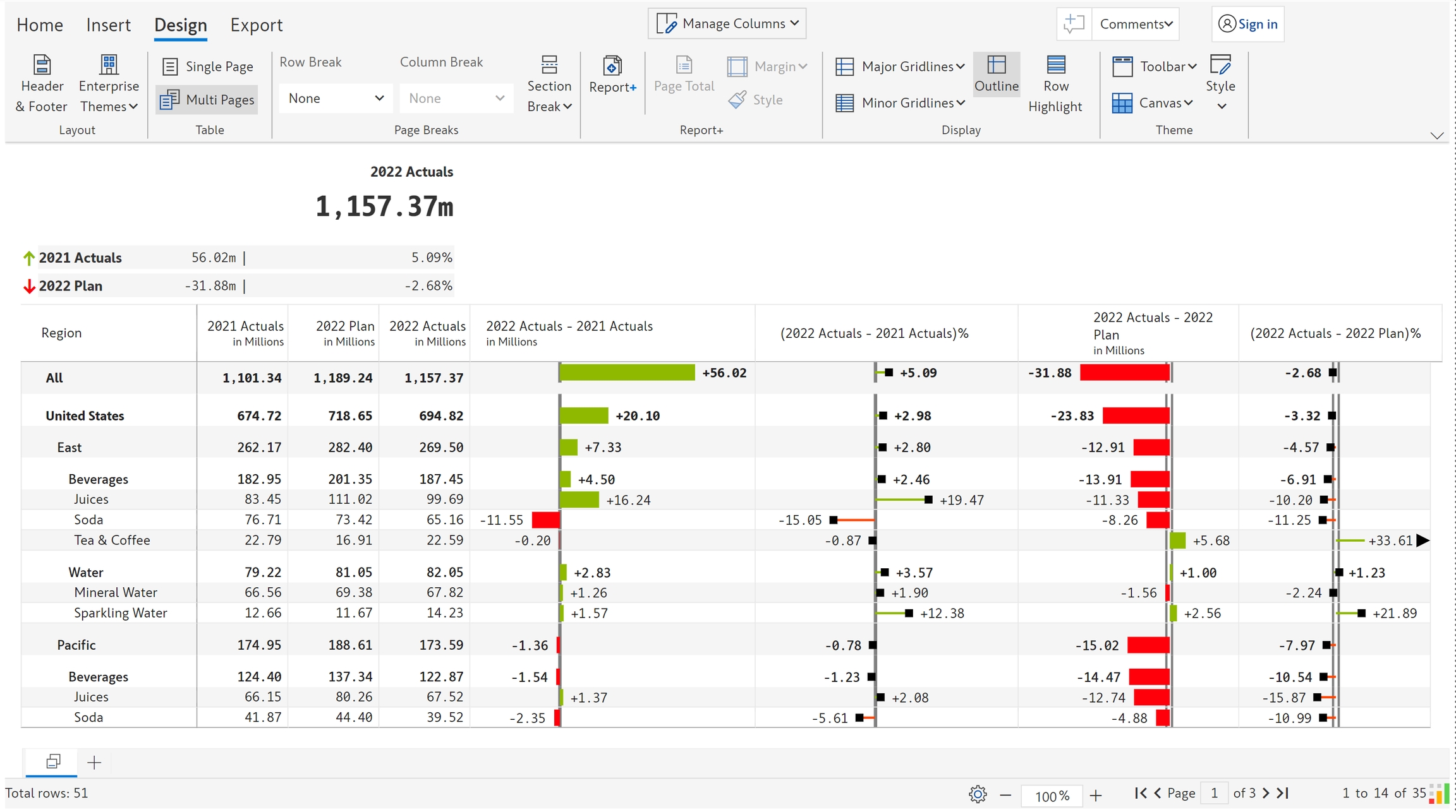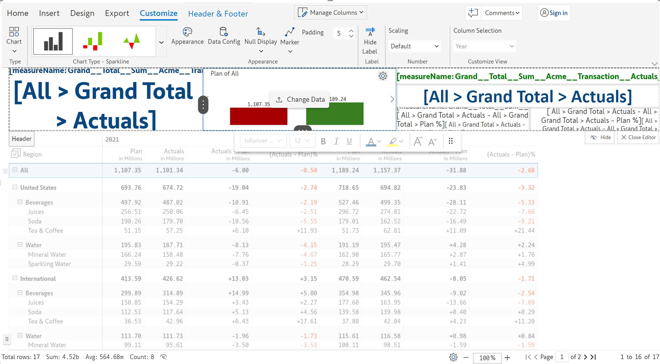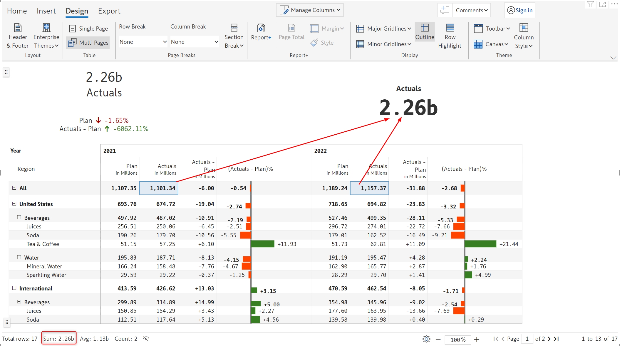 In cases where positive variance has a negative impact, you can invert the sign using the Invert variance option. In the below image, 2023 Actuals has a variance of 5.09% which is indicated by a green arrow. On clicking Invert variance, you can see that the arrow changes to red and the 2024 Plan variance turns green.
