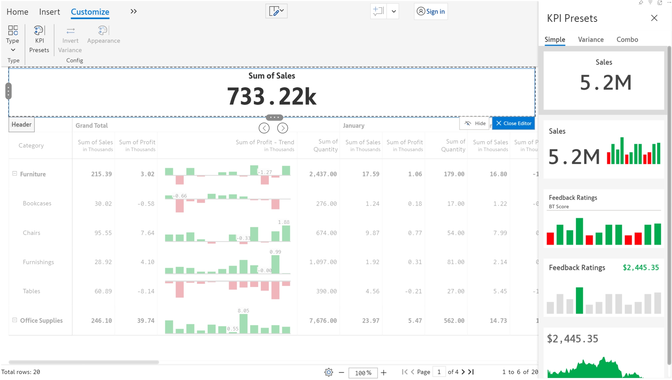 The appearance and styling of KPI cards can be customized by clicking on the Appearance button in the Customize ribbon.