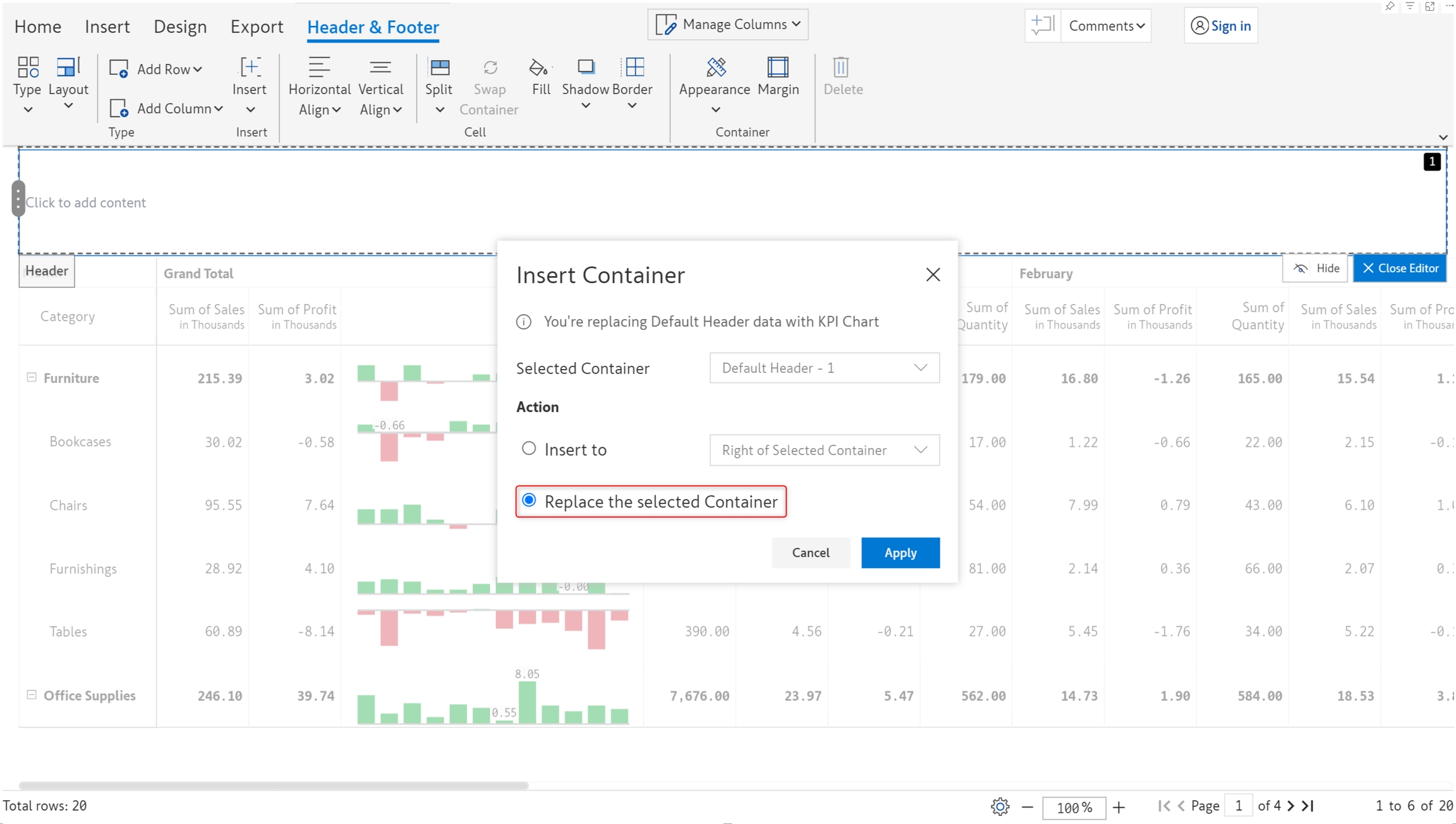 STEP 2: The Header & Footer tab is enabled. Let's remove the default header and choose KPI from the Type dropdown.