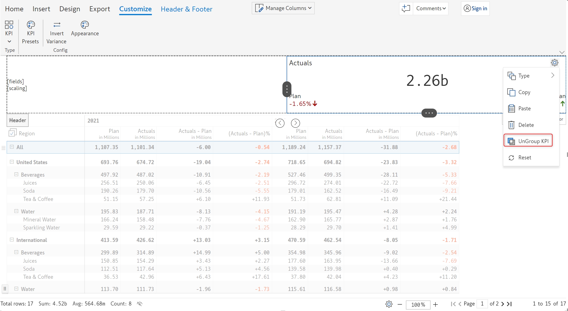 KPI presets can be further customized using this feature. From the header cell settings, select the ungroup KPI option.
