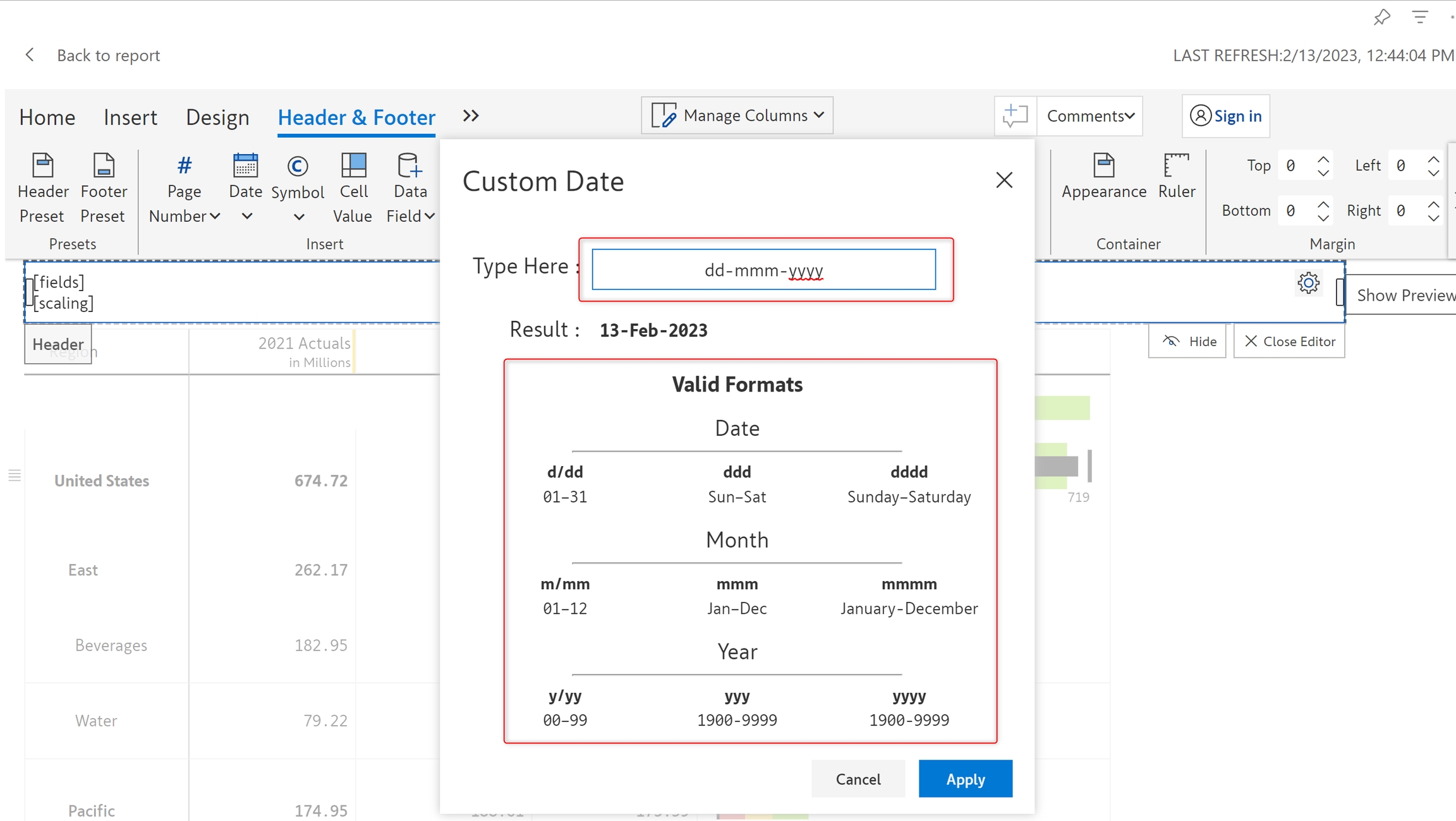 The available date formats are shown in the below image. The date in the header will get displayed in the selected format.