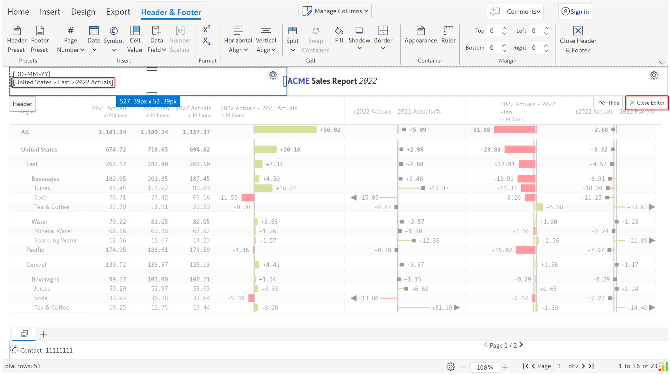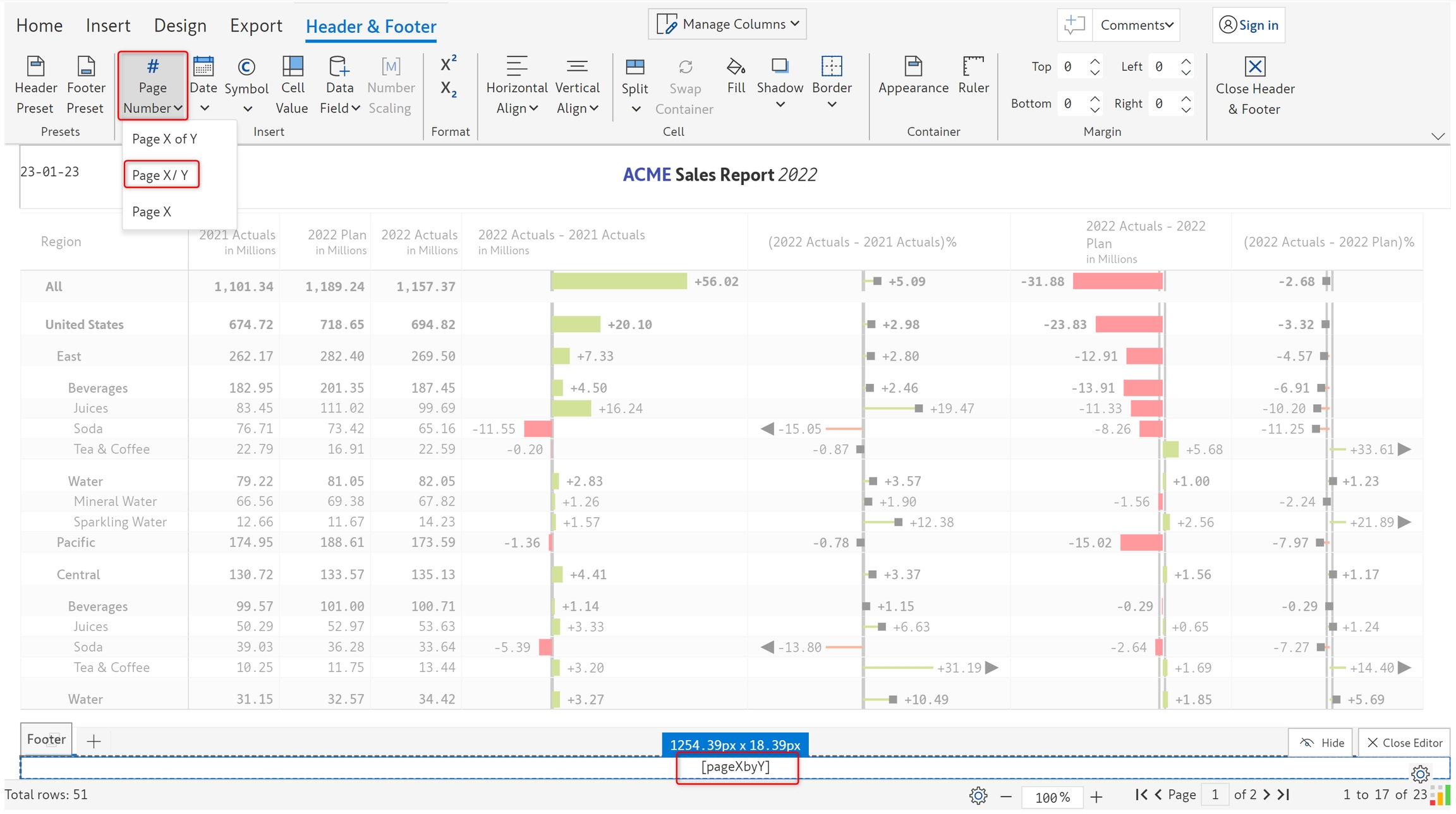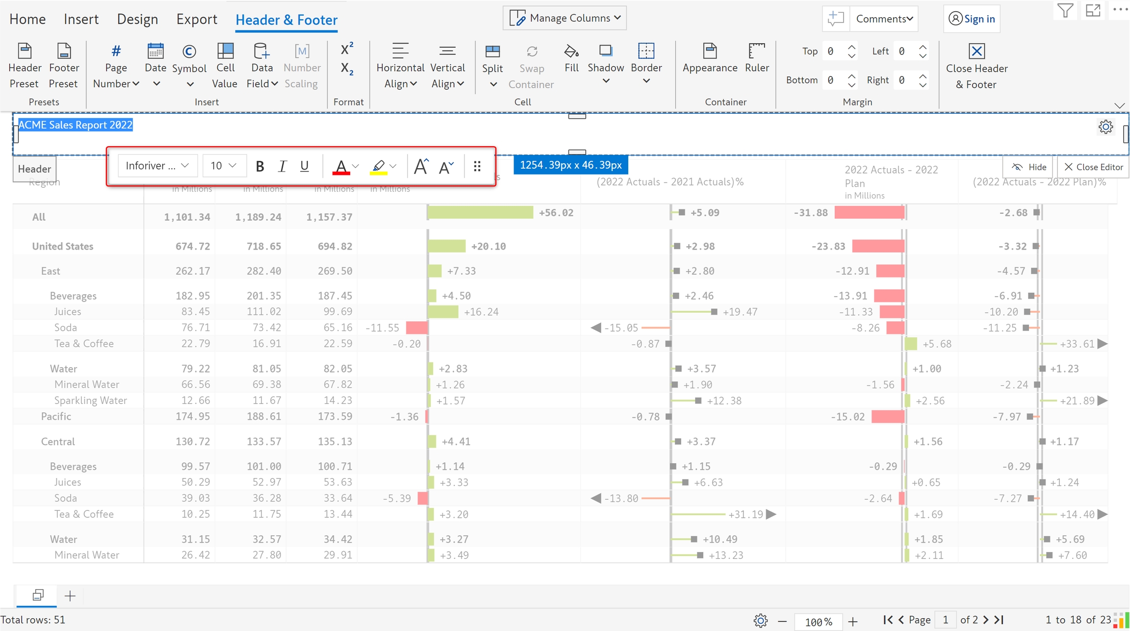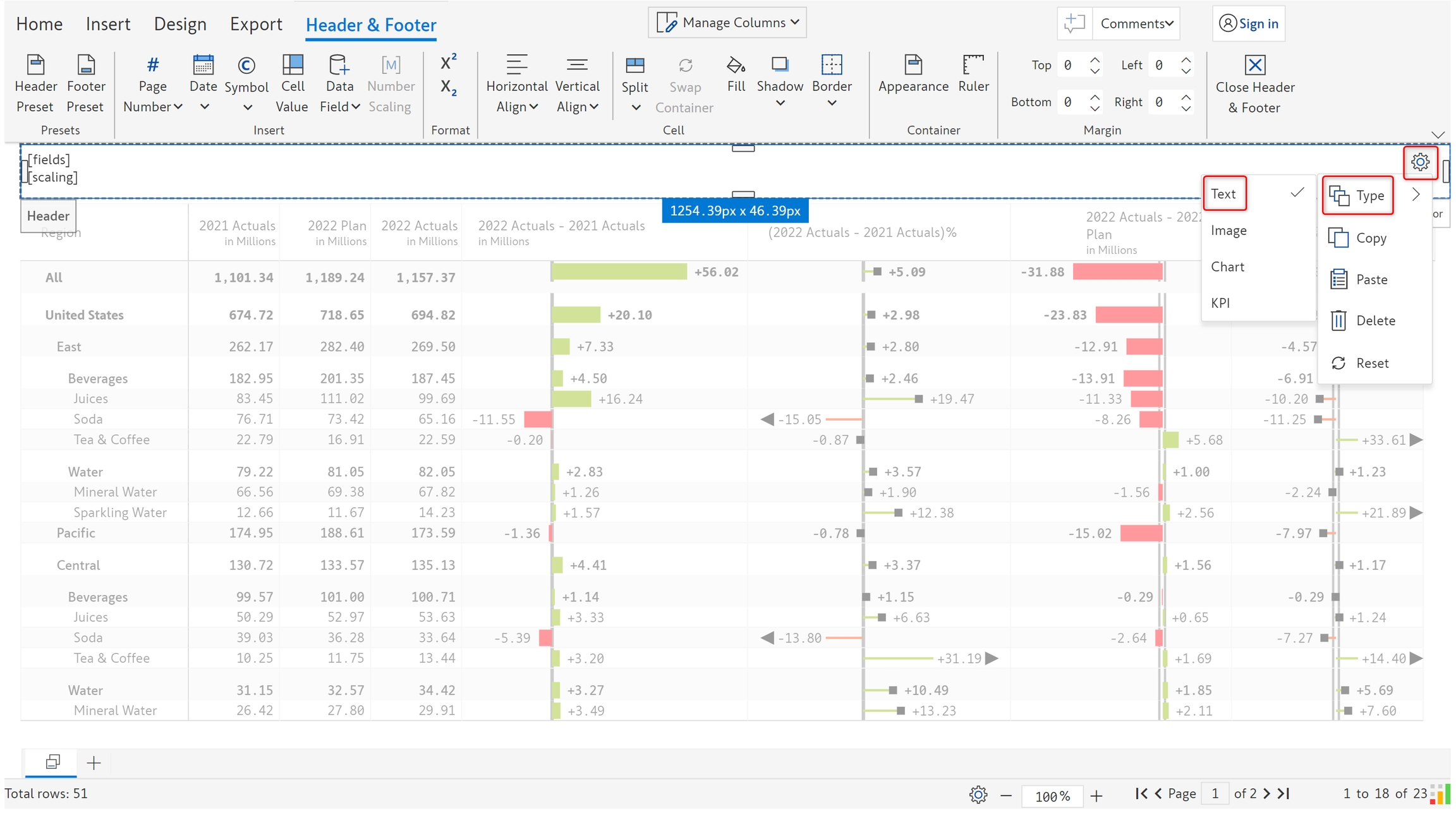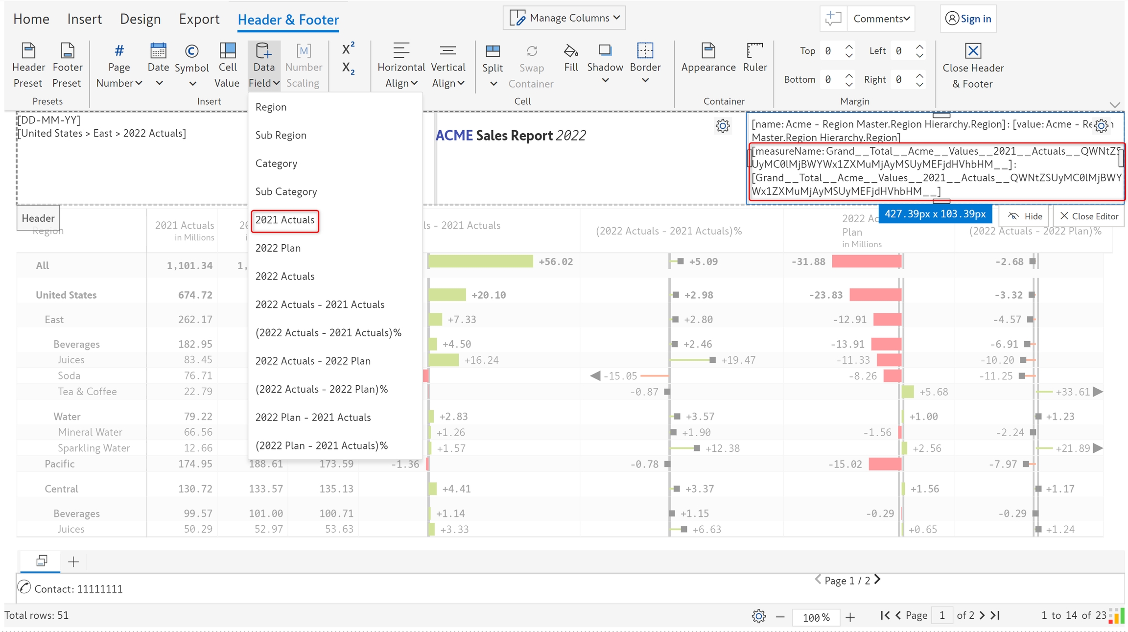 You can insert the row & category members and measures in the header/footer. On clicking the 'Data field' option, you can see a list of all the categories, data source measures and calculations made in Inforiver.