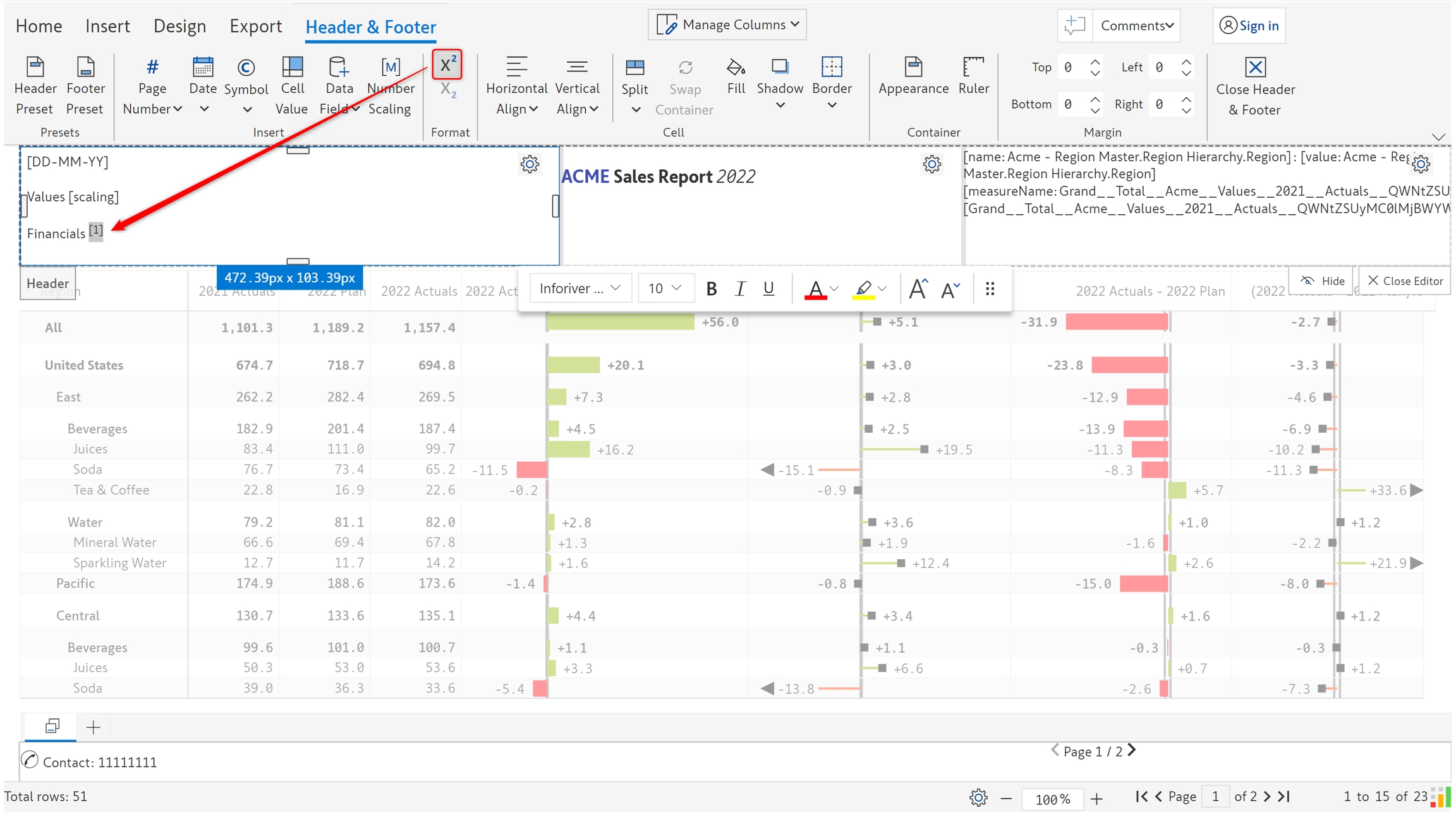 You can insert cell values in the header/footer. You can notice that generally, the report is greyed out. Click on 'Cell value'.