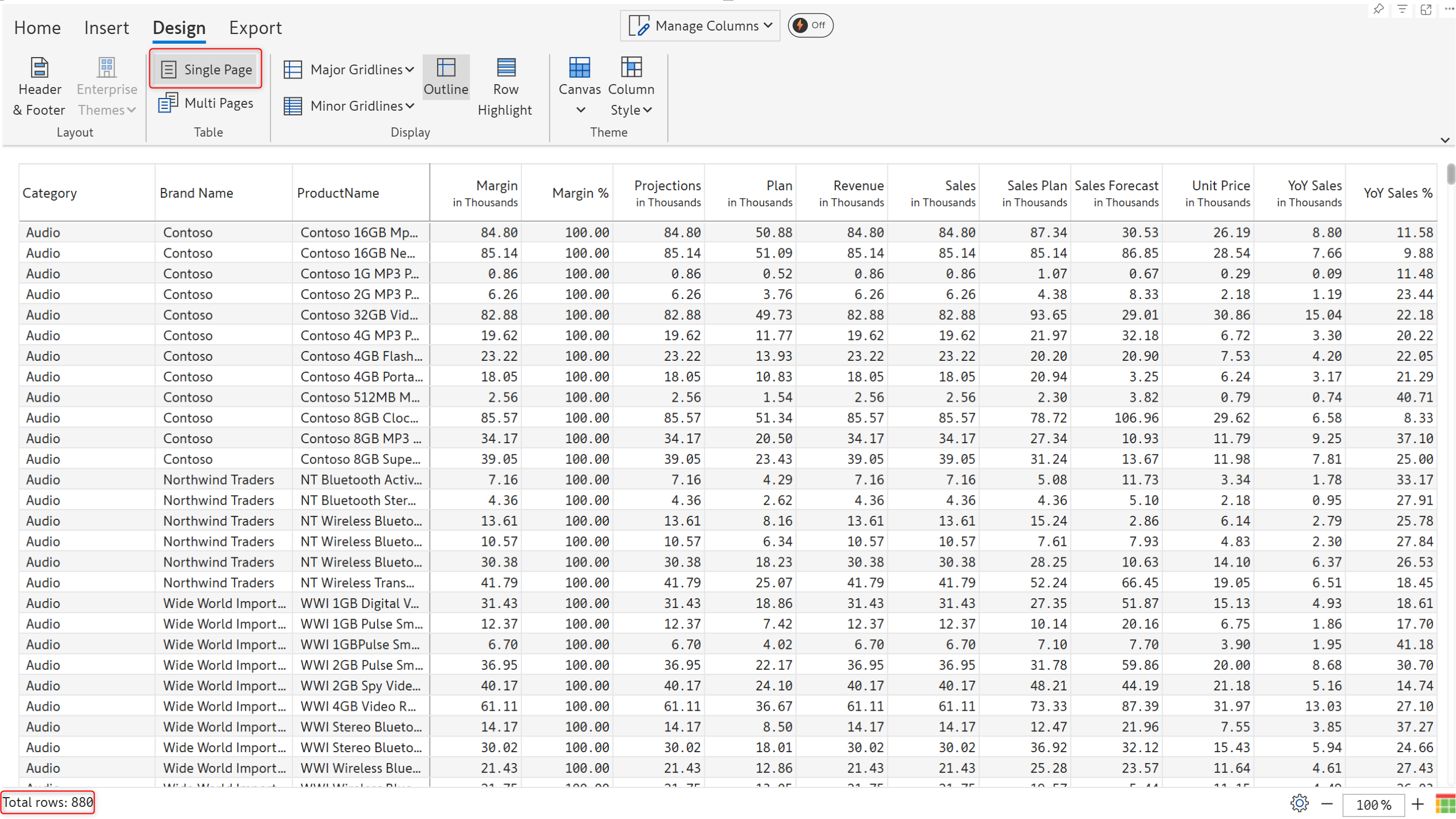 'Single page' displays all the rows on a single page with a scroll (depending on the number of rows). Notice how all 880 rows in the report are displayed on the same page.
