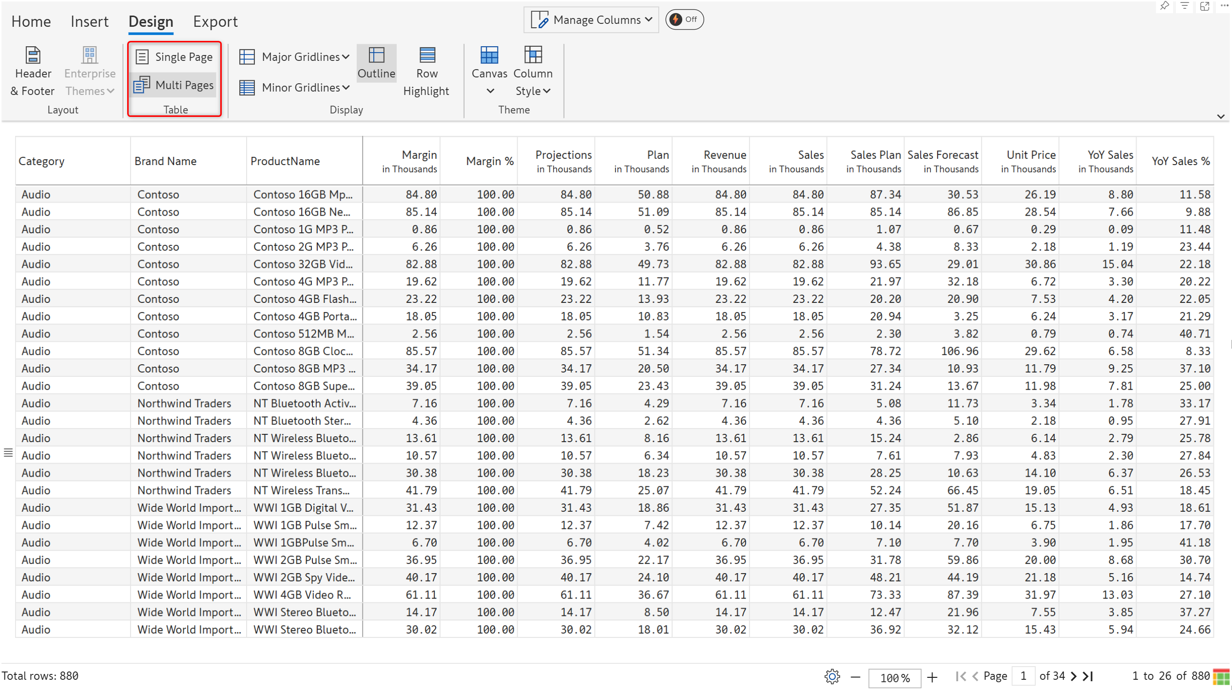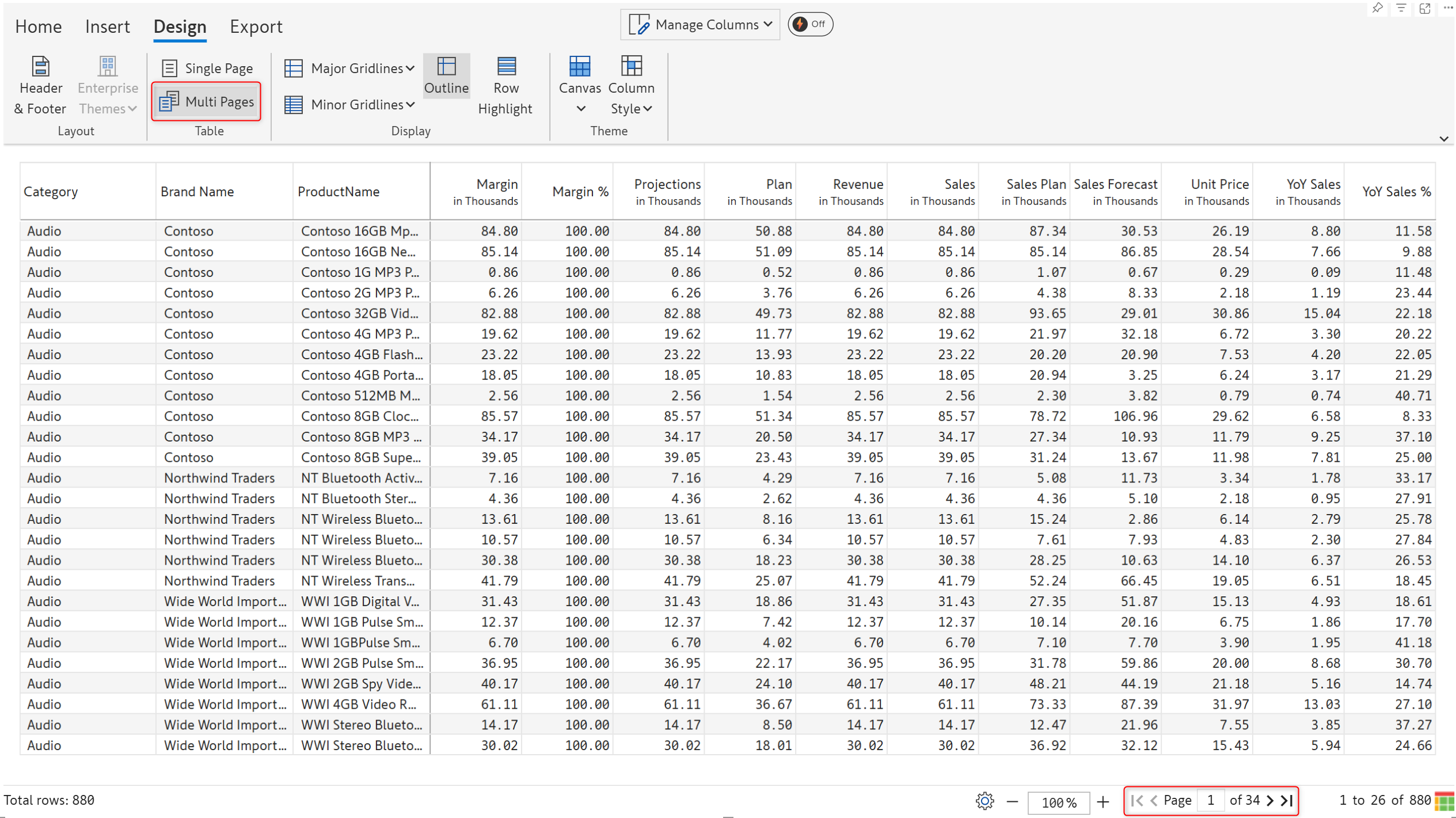 By using the 'Multi pages' option, you can automatically display the rows that fit on a single page and split the report into multiple pages. In the example below, you can see that the table is split into 34 pages.