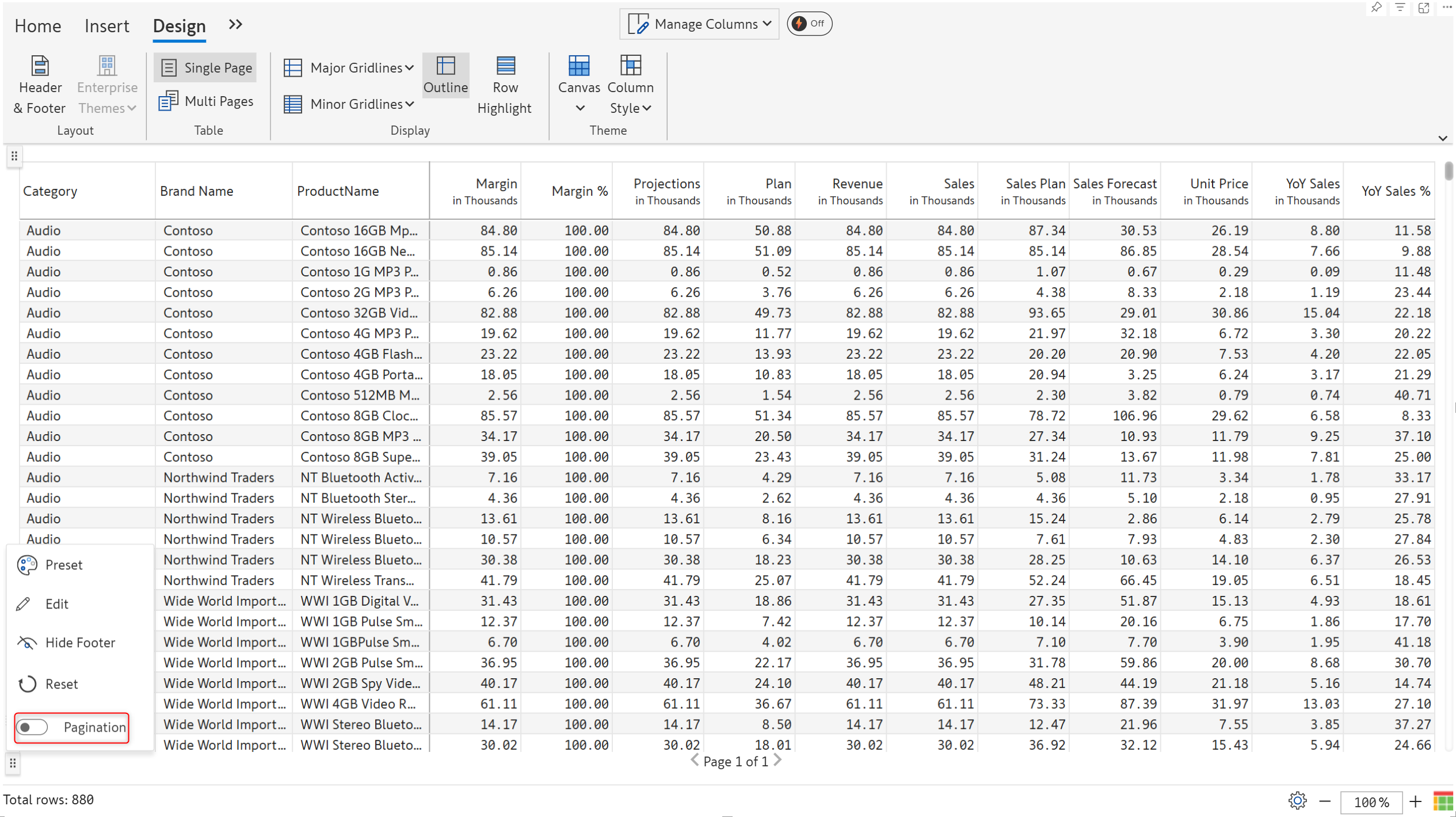 Let's discuss the single & multi-page options and pagination controls. In the Design ribbon, you'll find two options - ‘Single page’ and ‘Multi pages’.