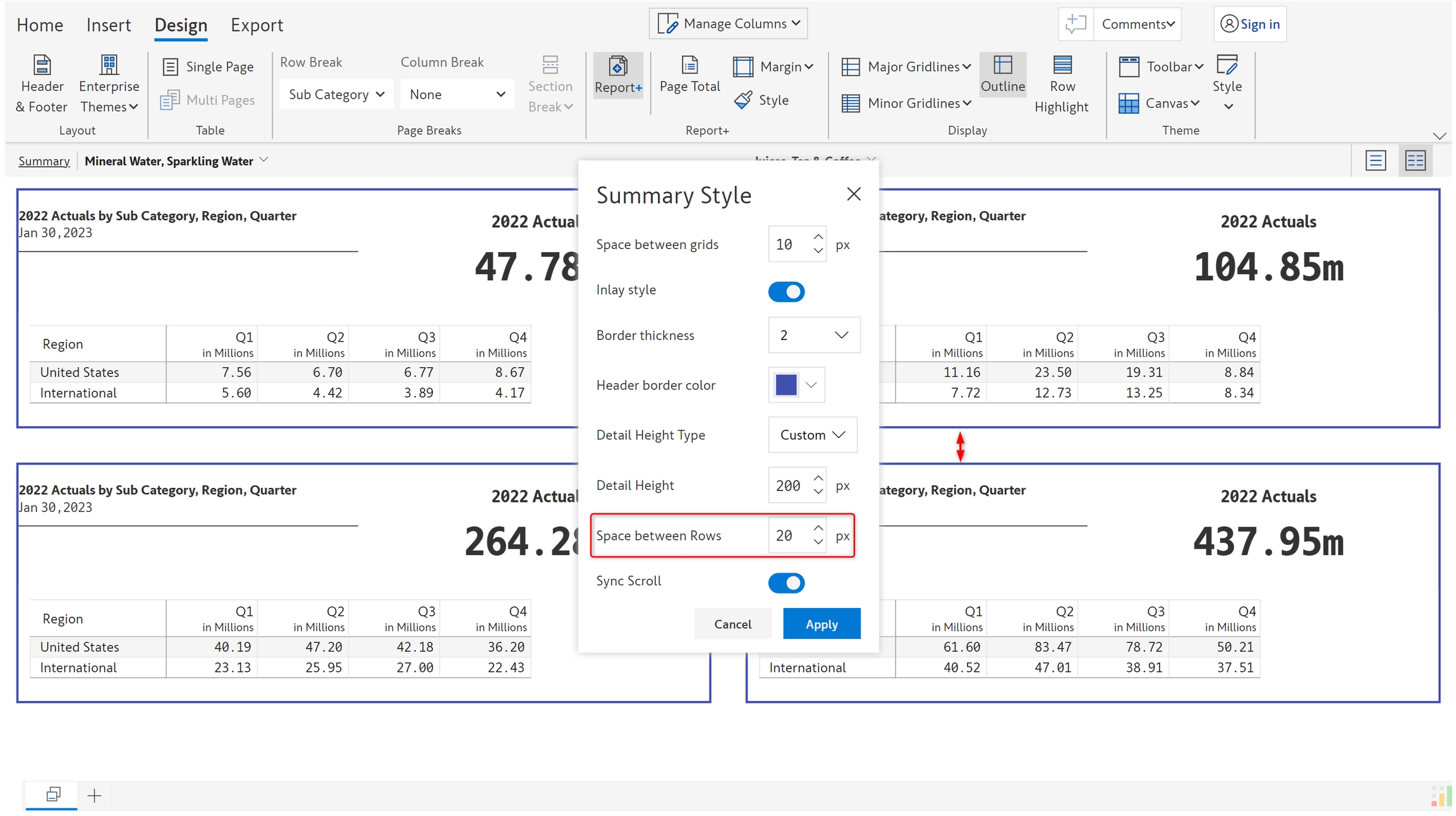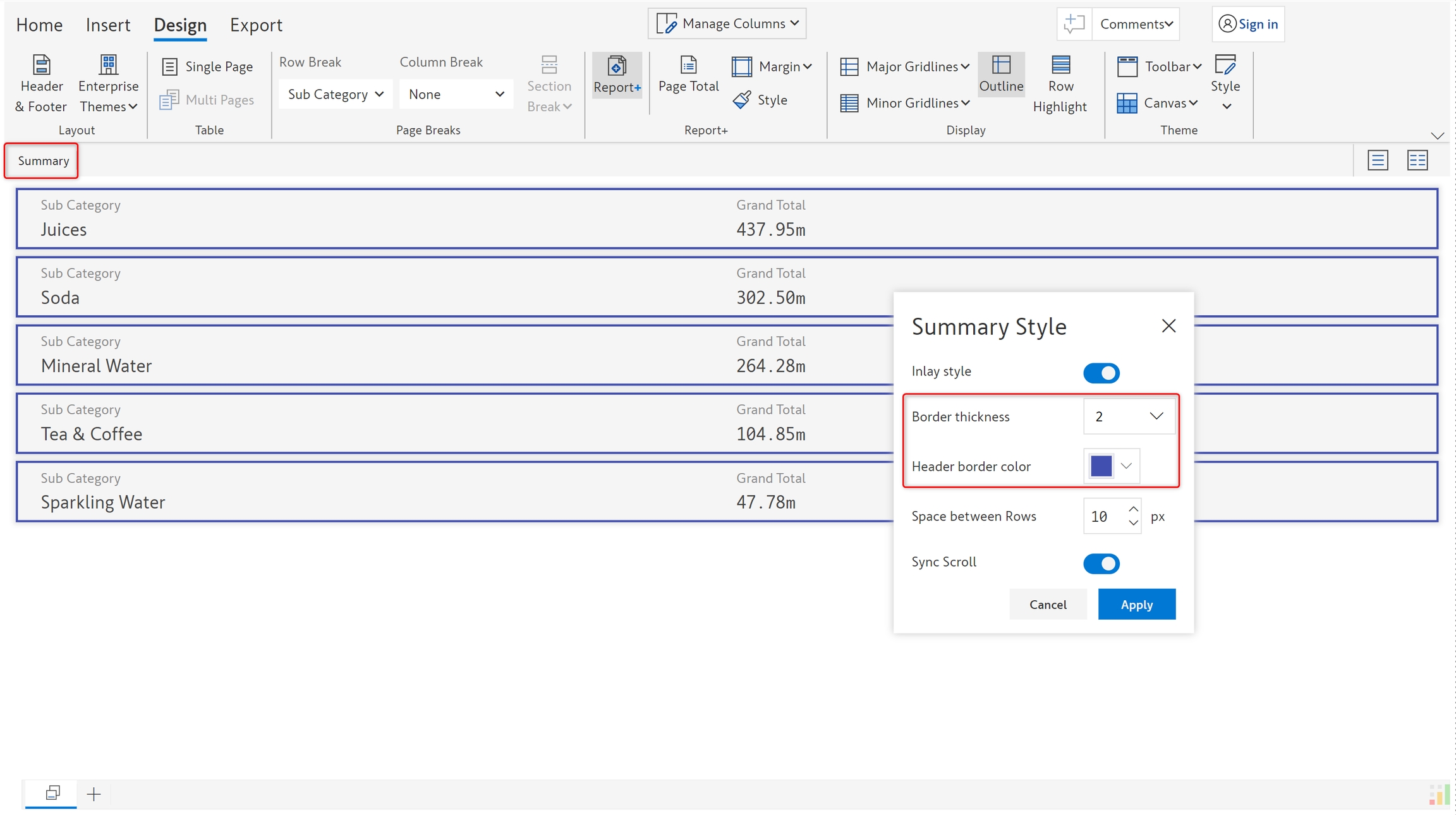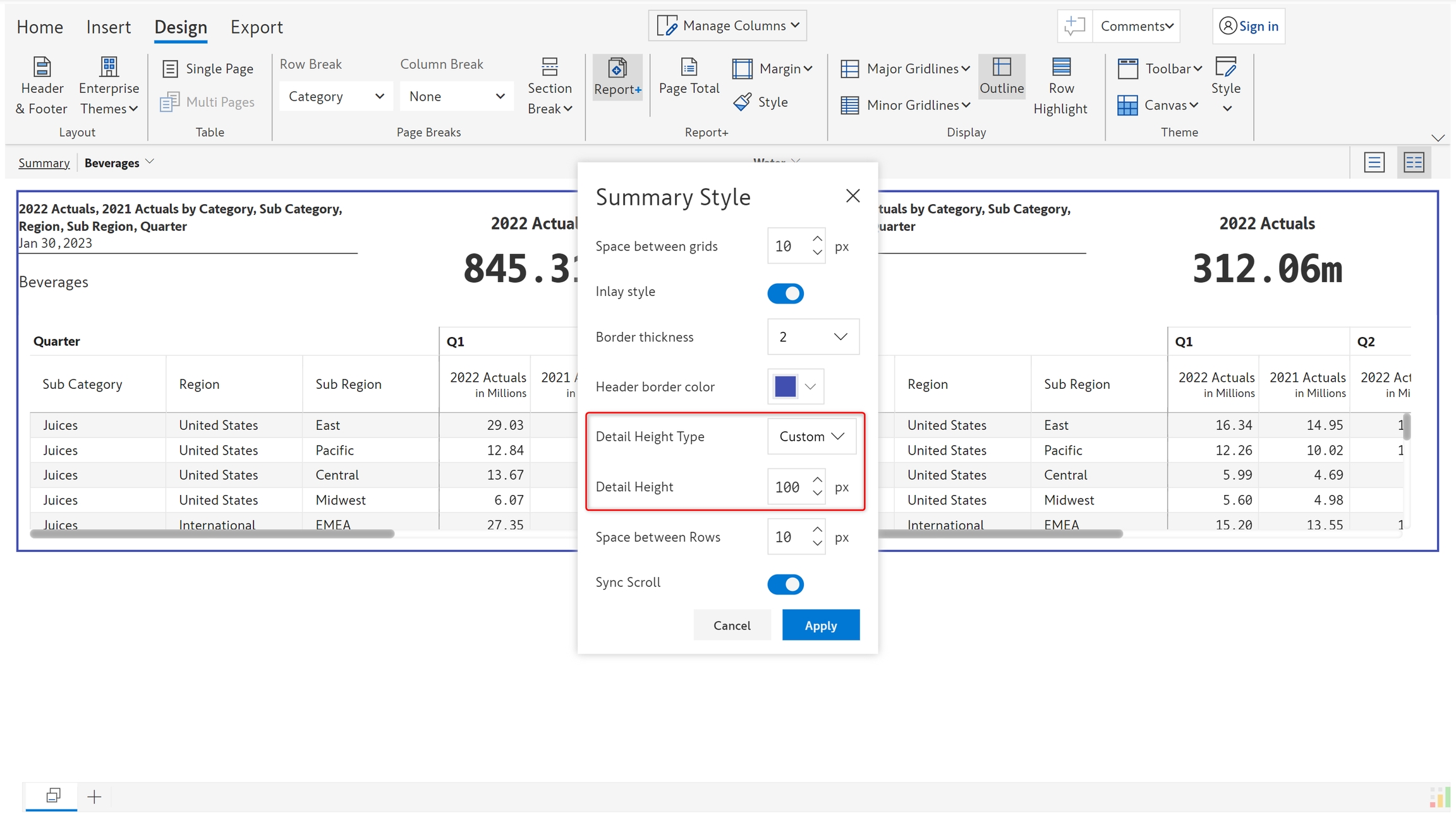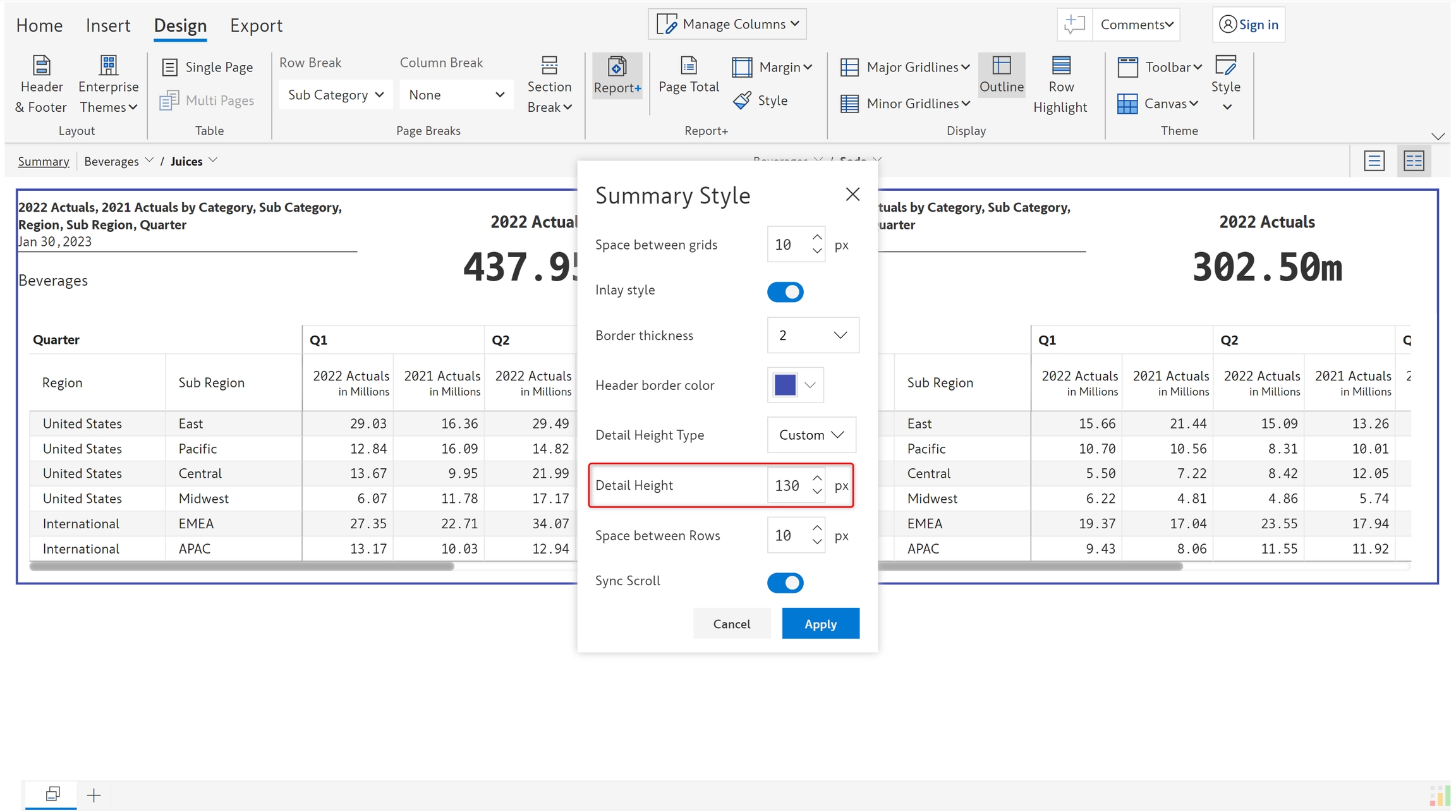 You can also define custom heights for the details as shown below. The detail height should be between 0 px and 300 px.