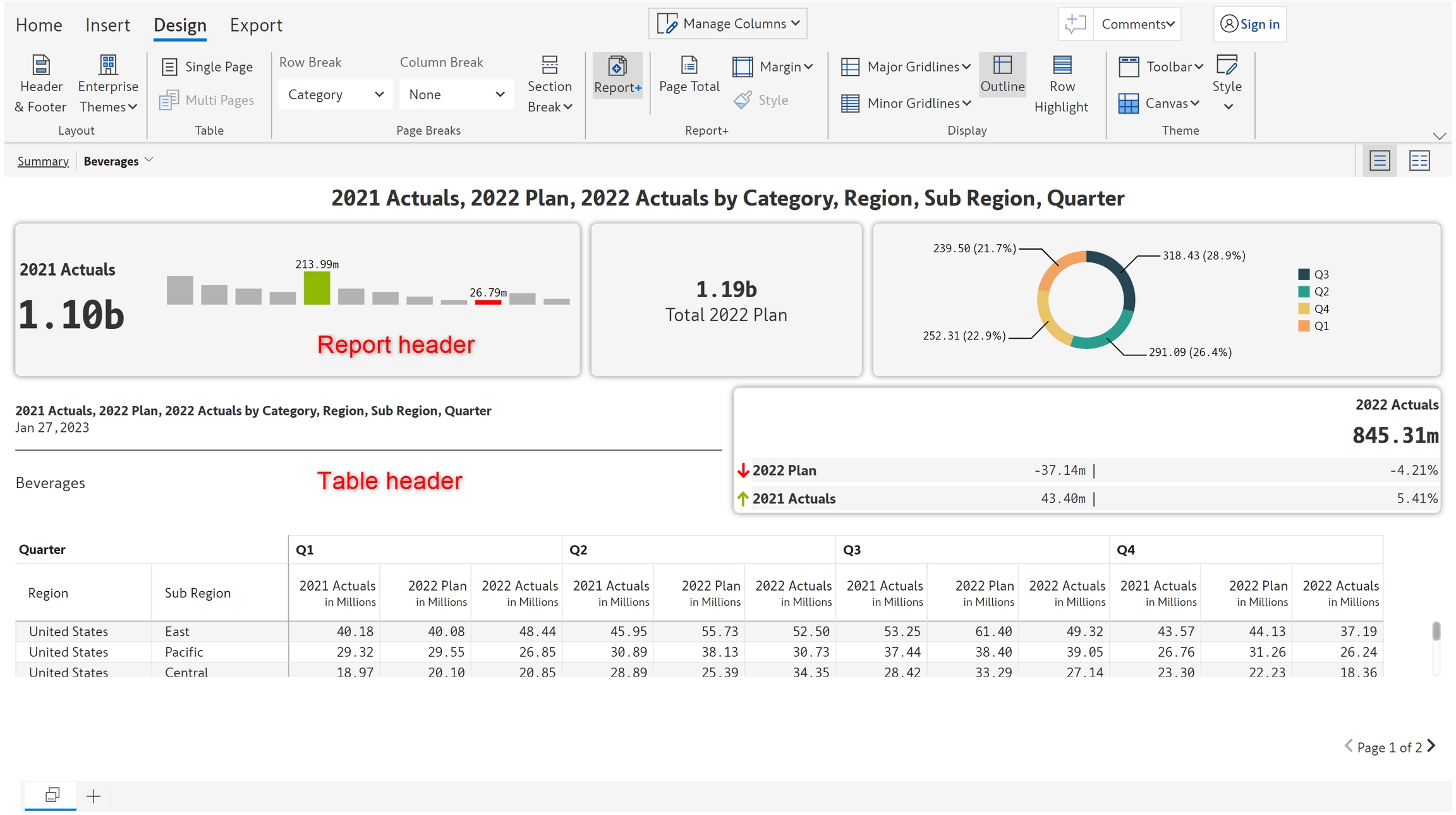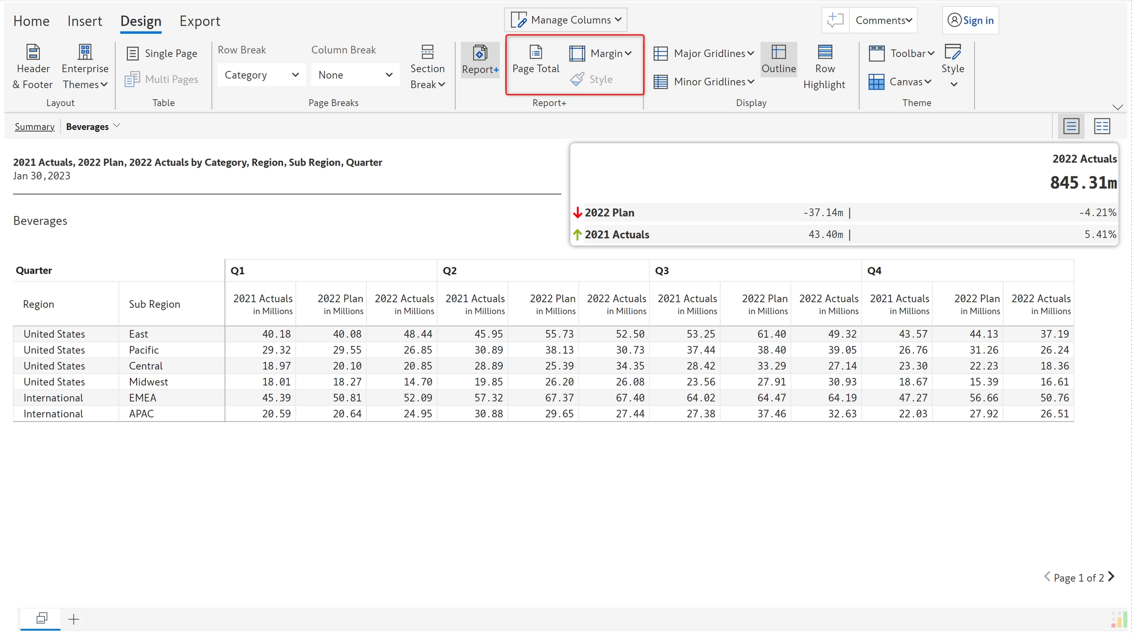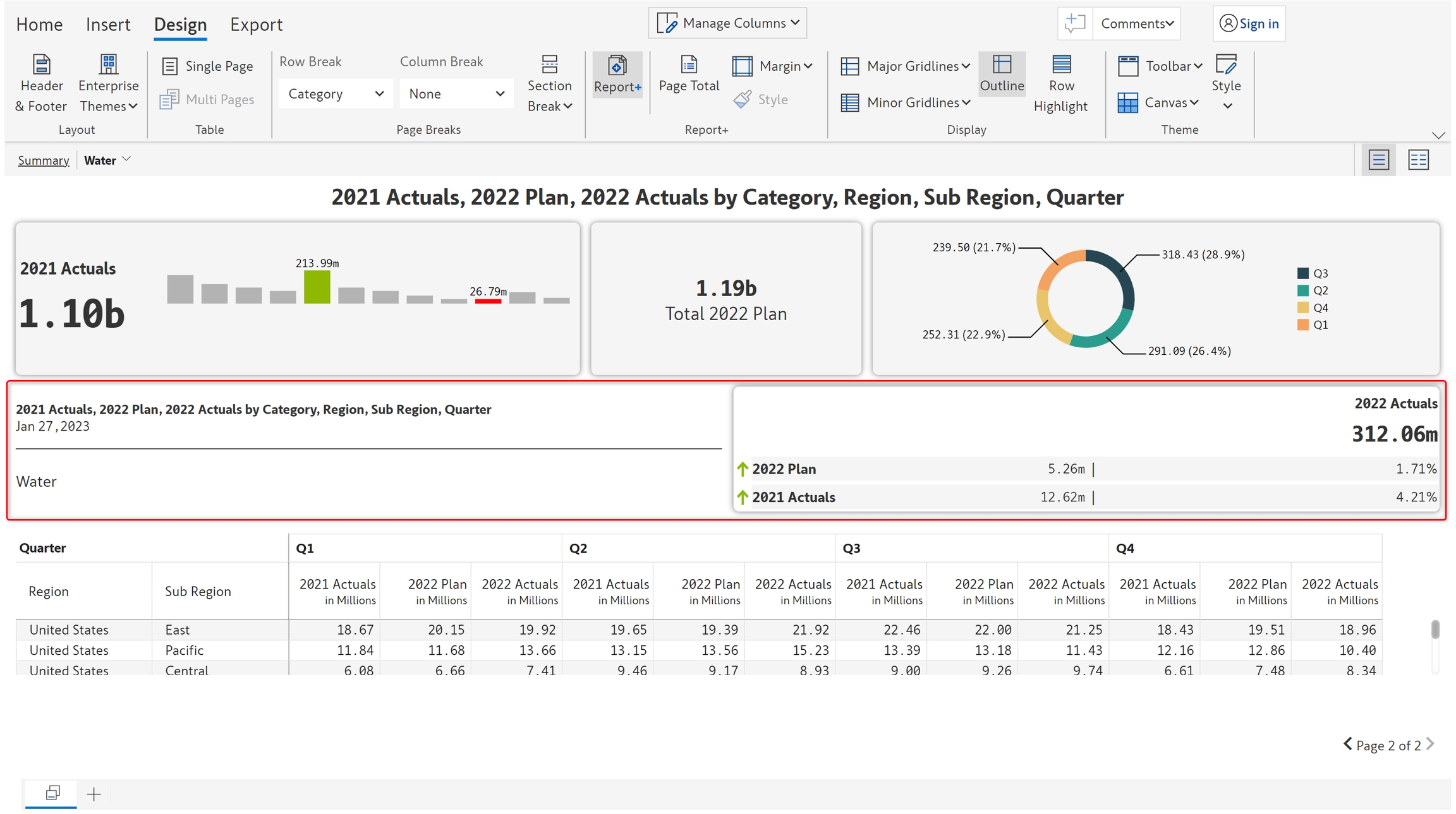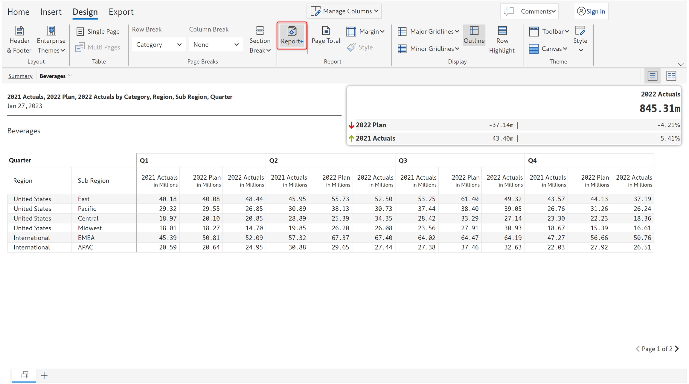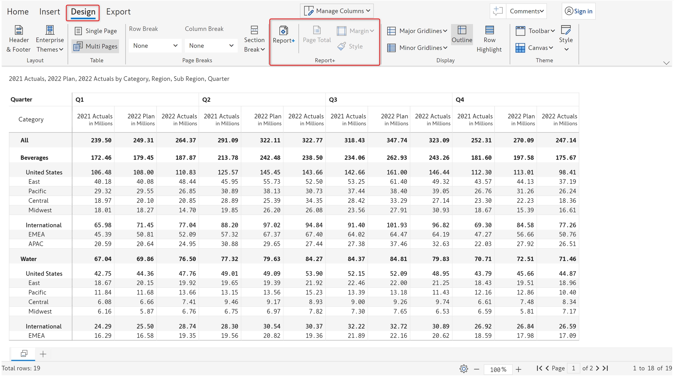 In the 'Design' tab, you can see the 'Report+' section highlighted in the below image. Let's take a detailed look.
