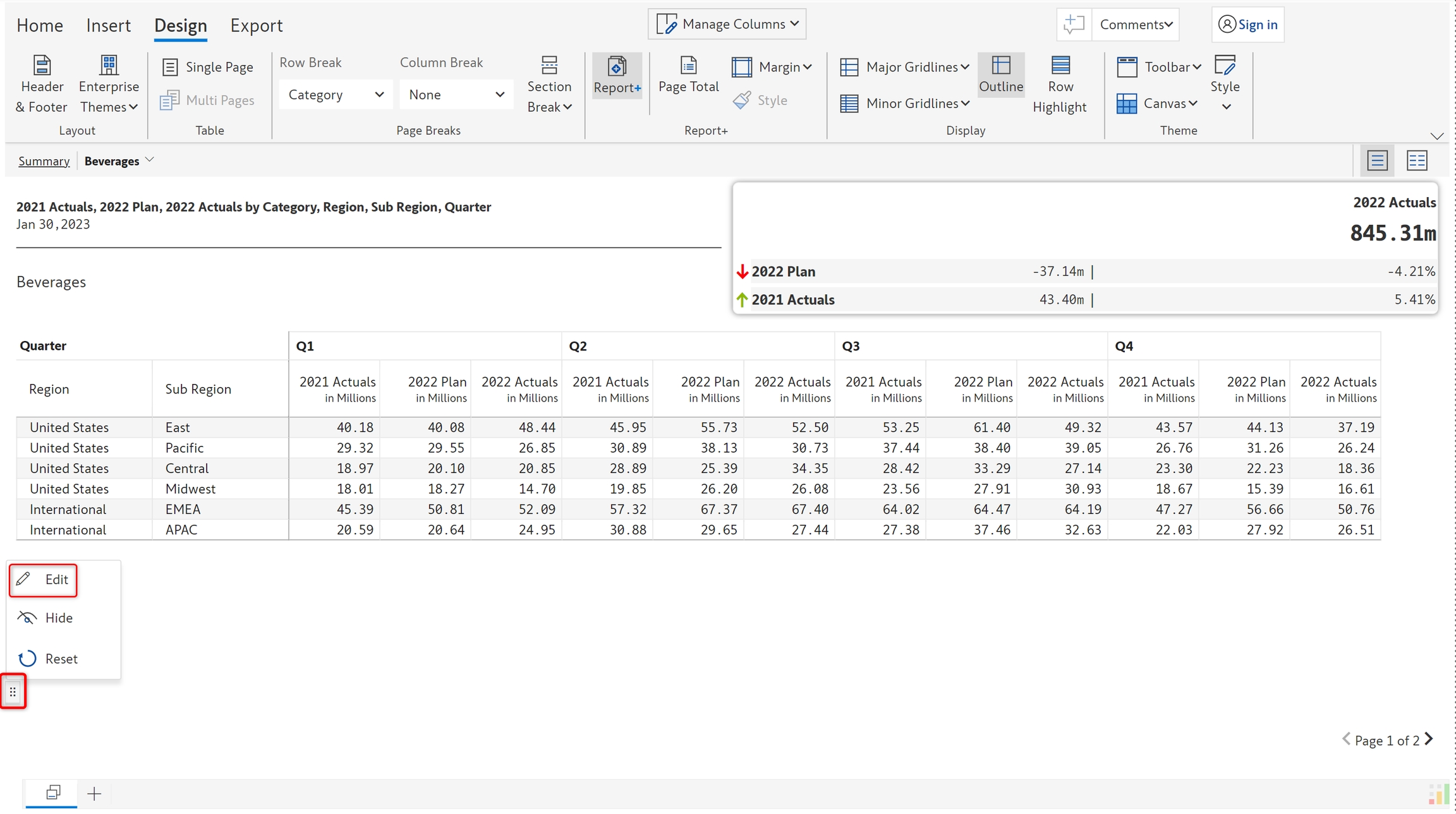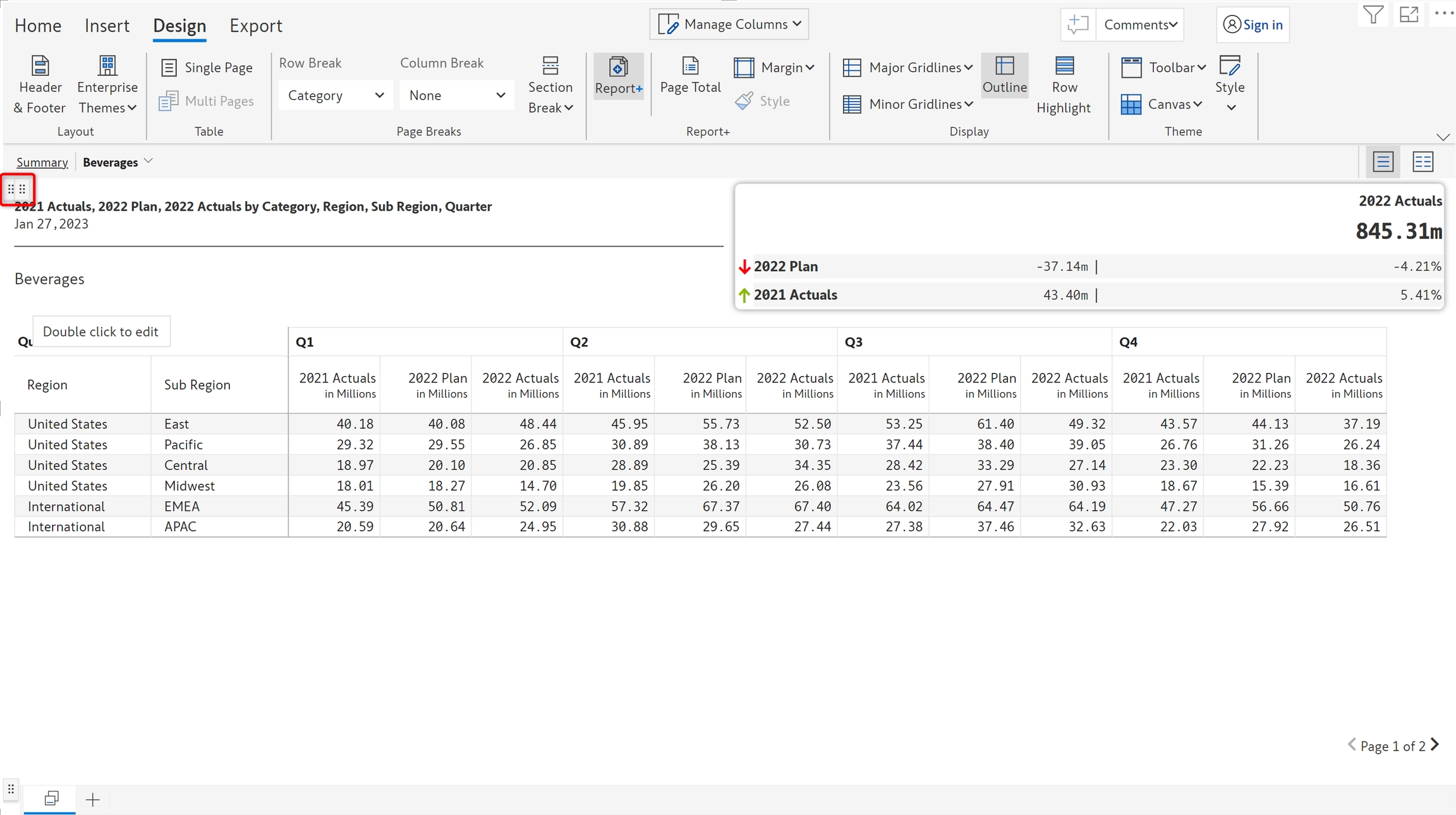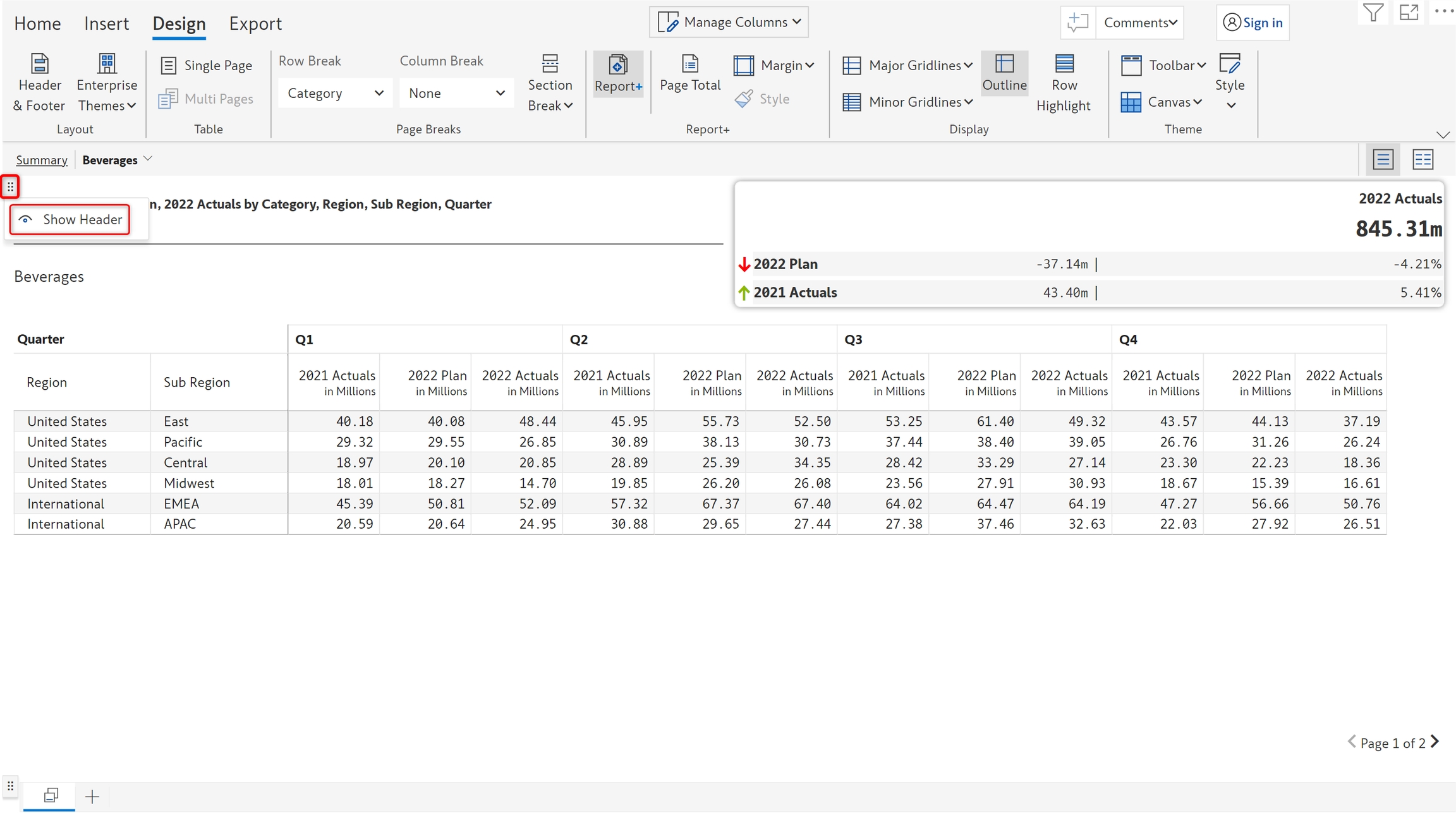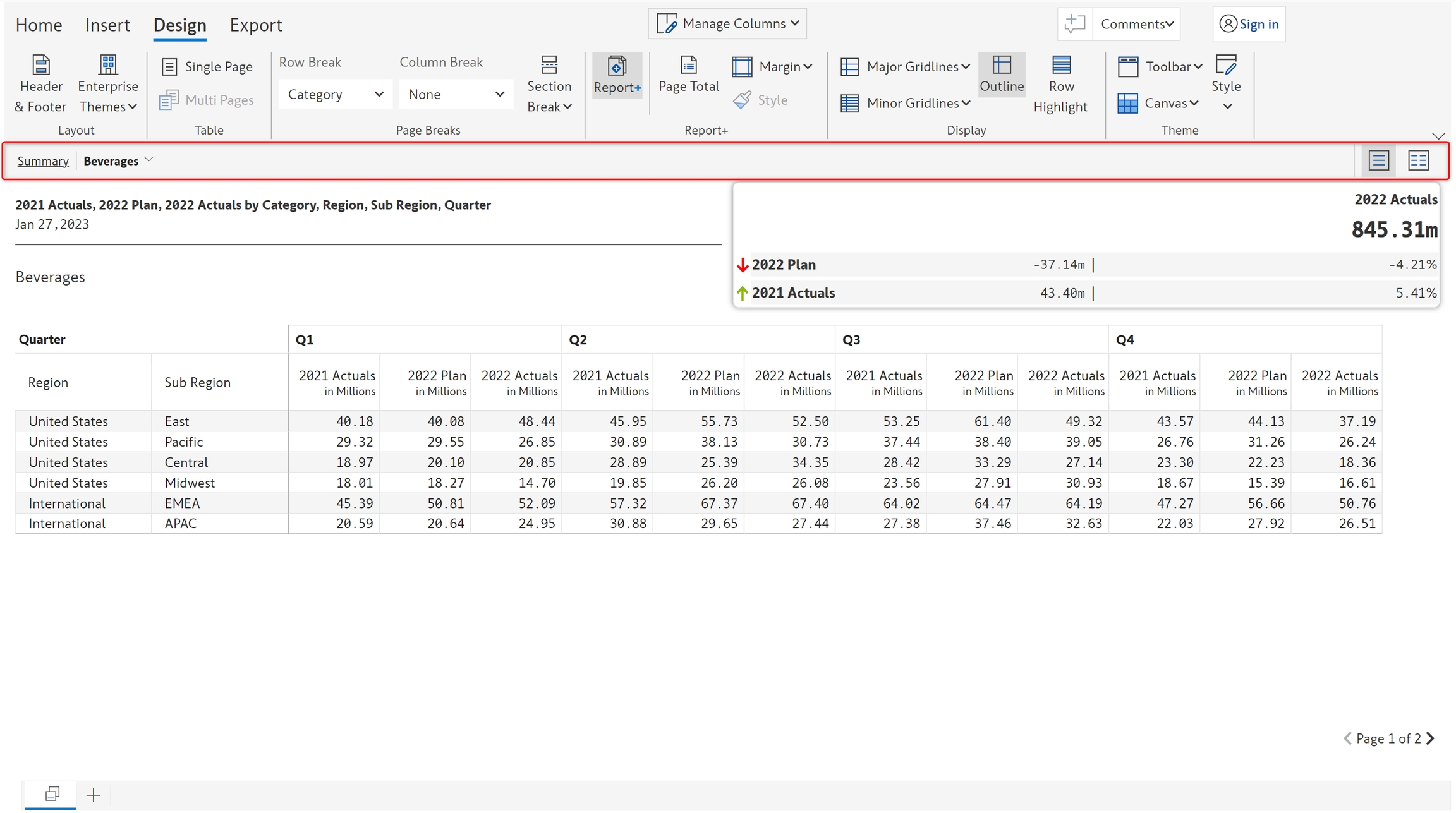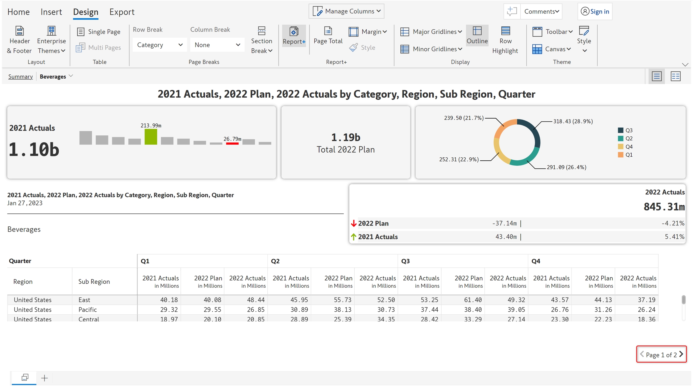 In the 'Design' tab, you can see the 'Report+' section highlighted in the below image. Let's take a detailed look.