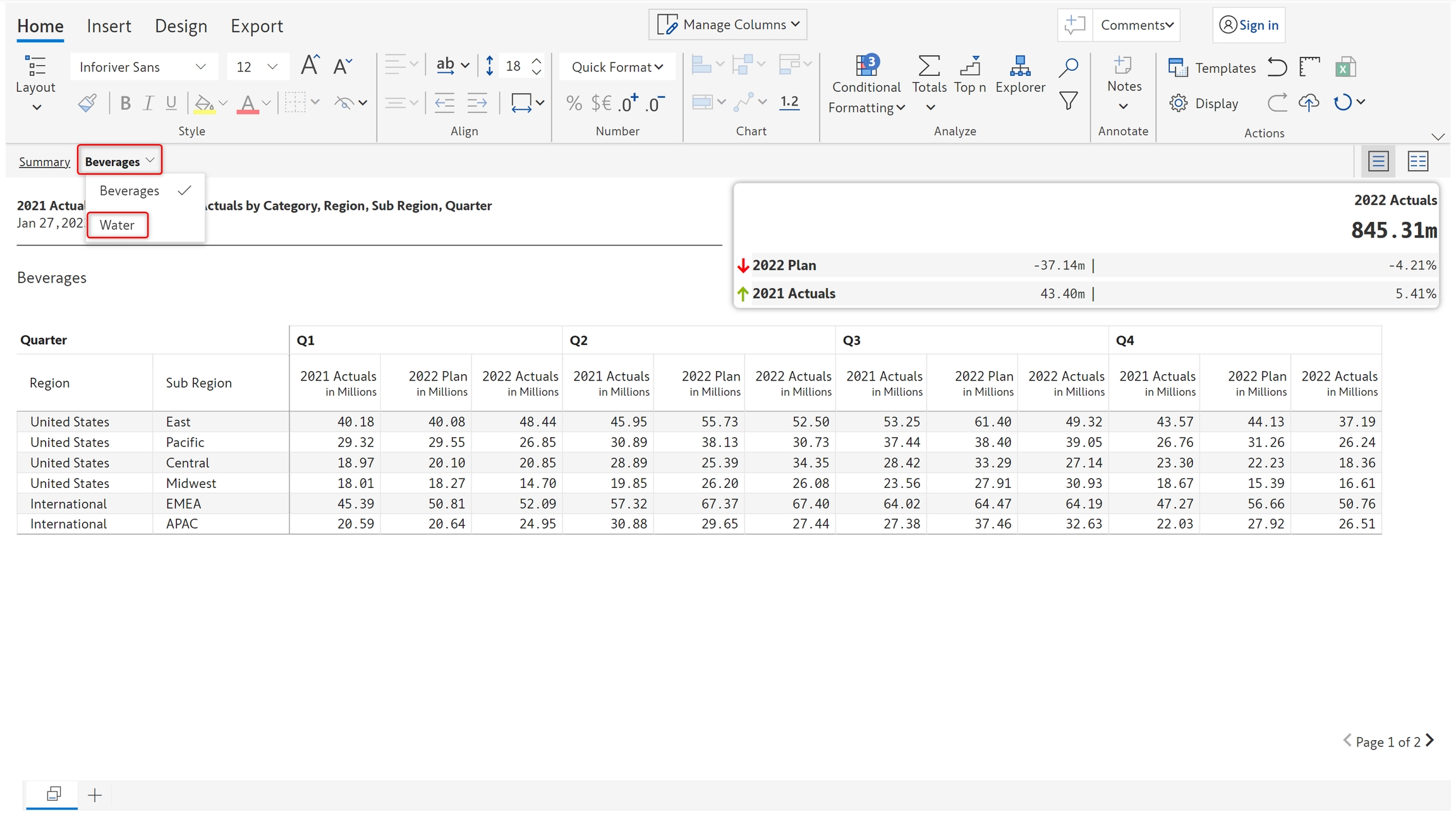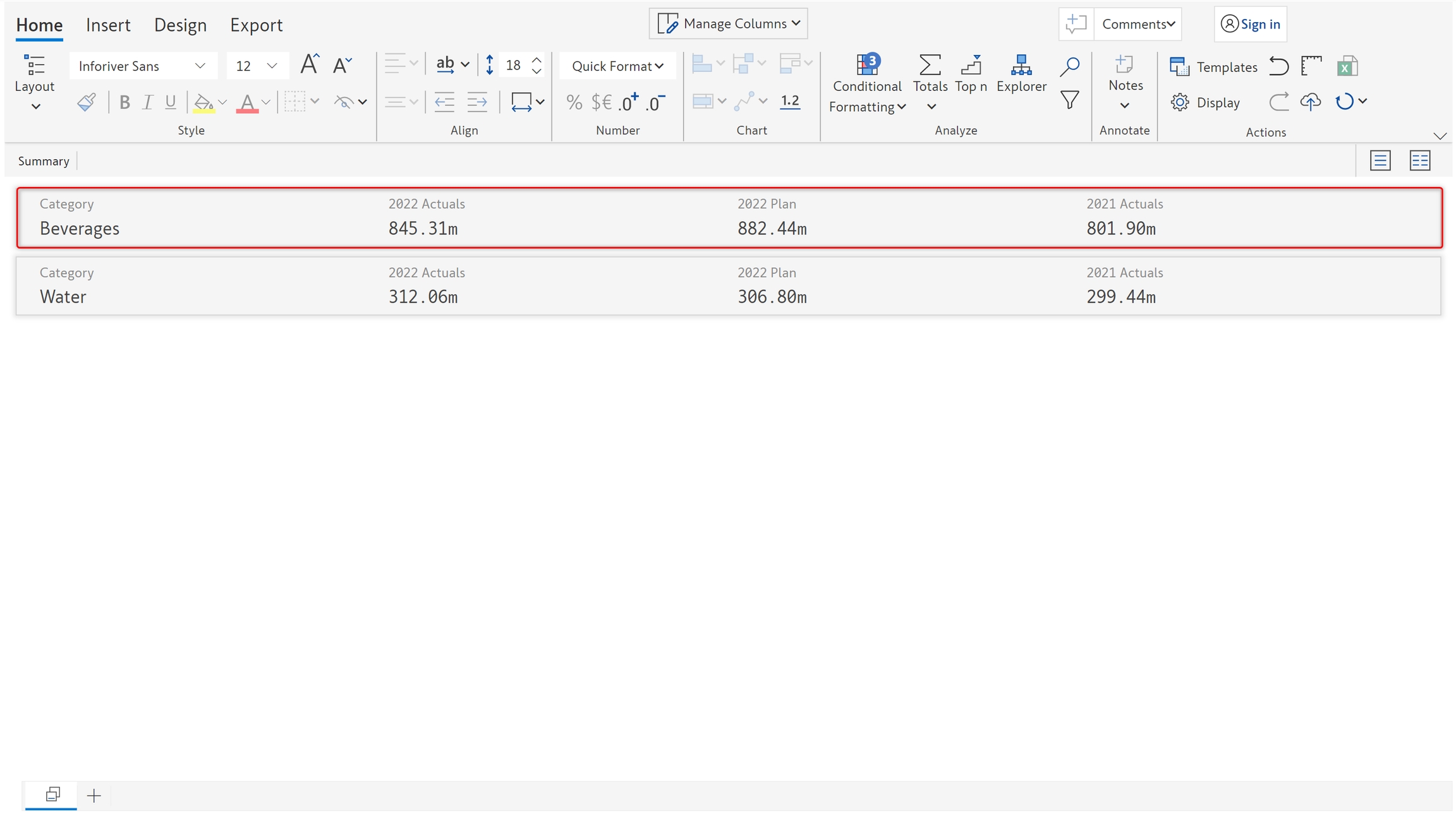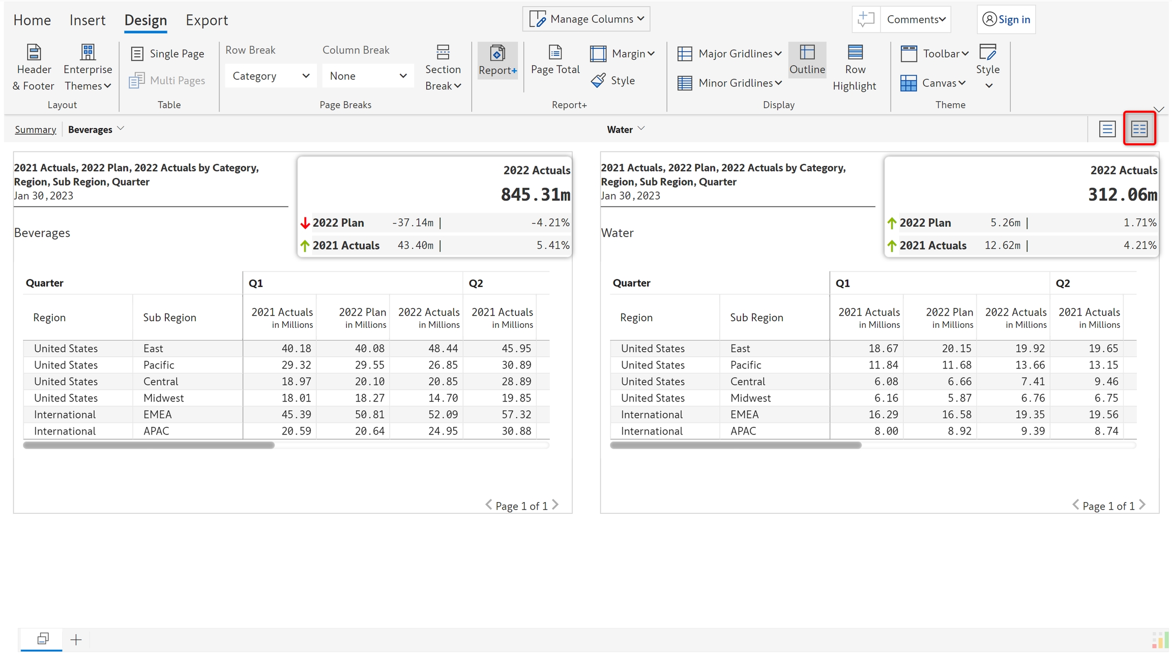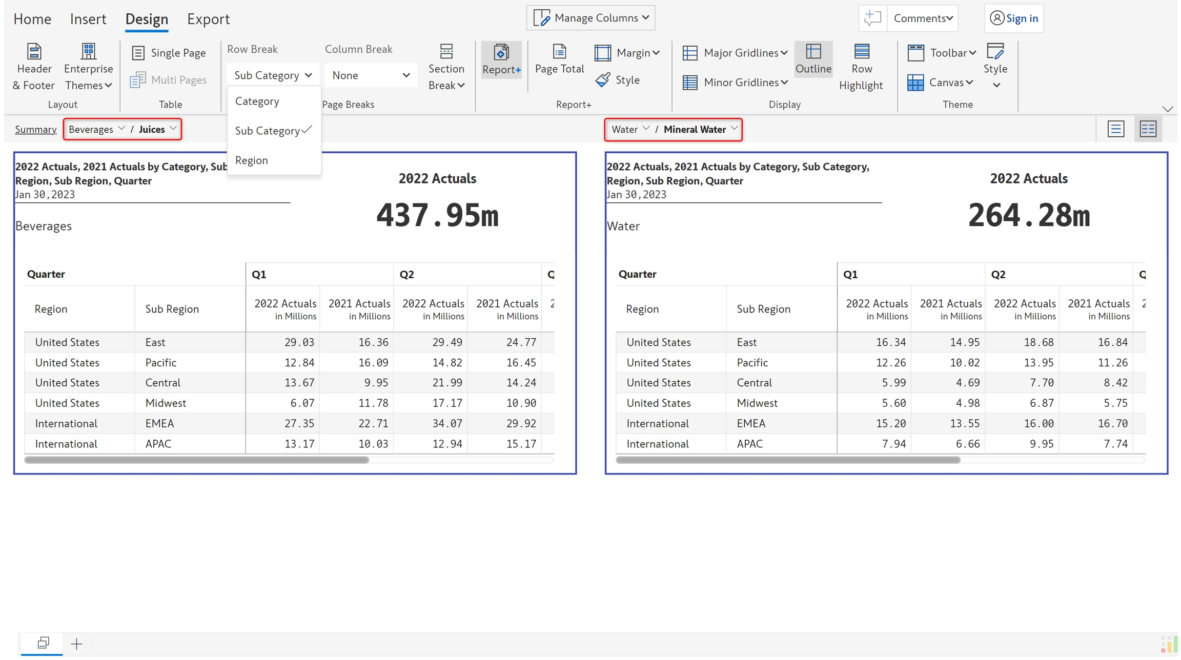 Note that if 'Row break' is not applied to the highest hierarchy level, you can compare different combinations of the category and its parent category. In this example, a row break is applied for subcategories, hence you can compare Beverages -> Juices and Water -> Mineral water.