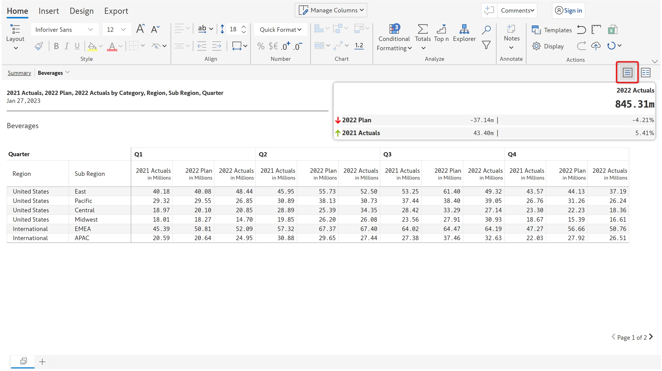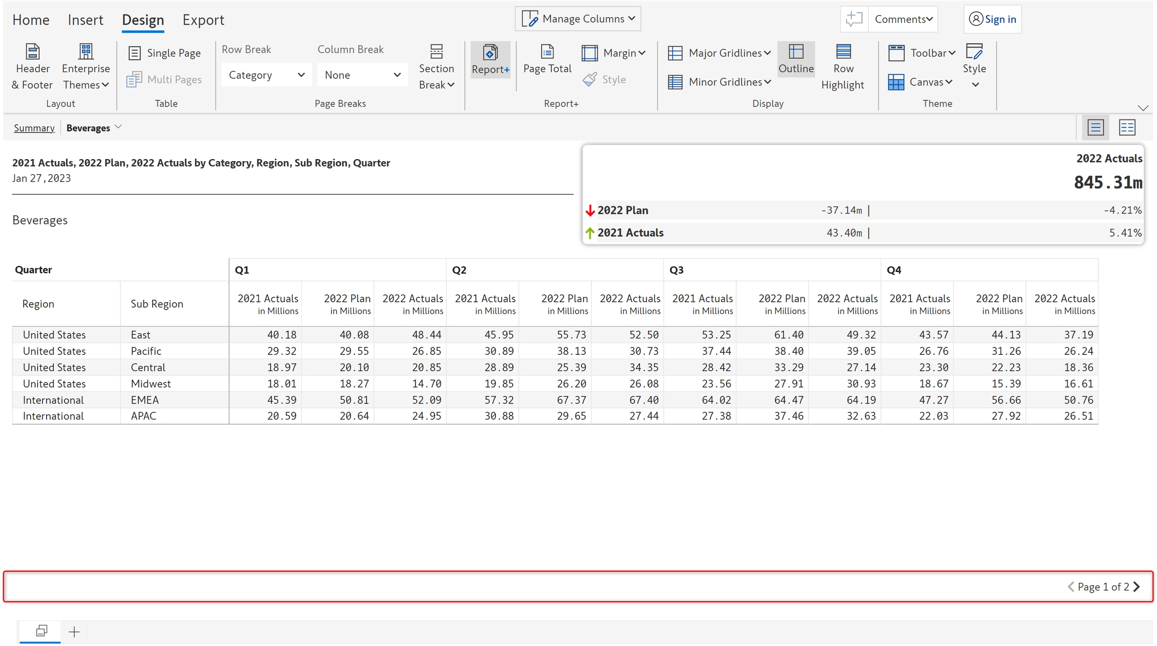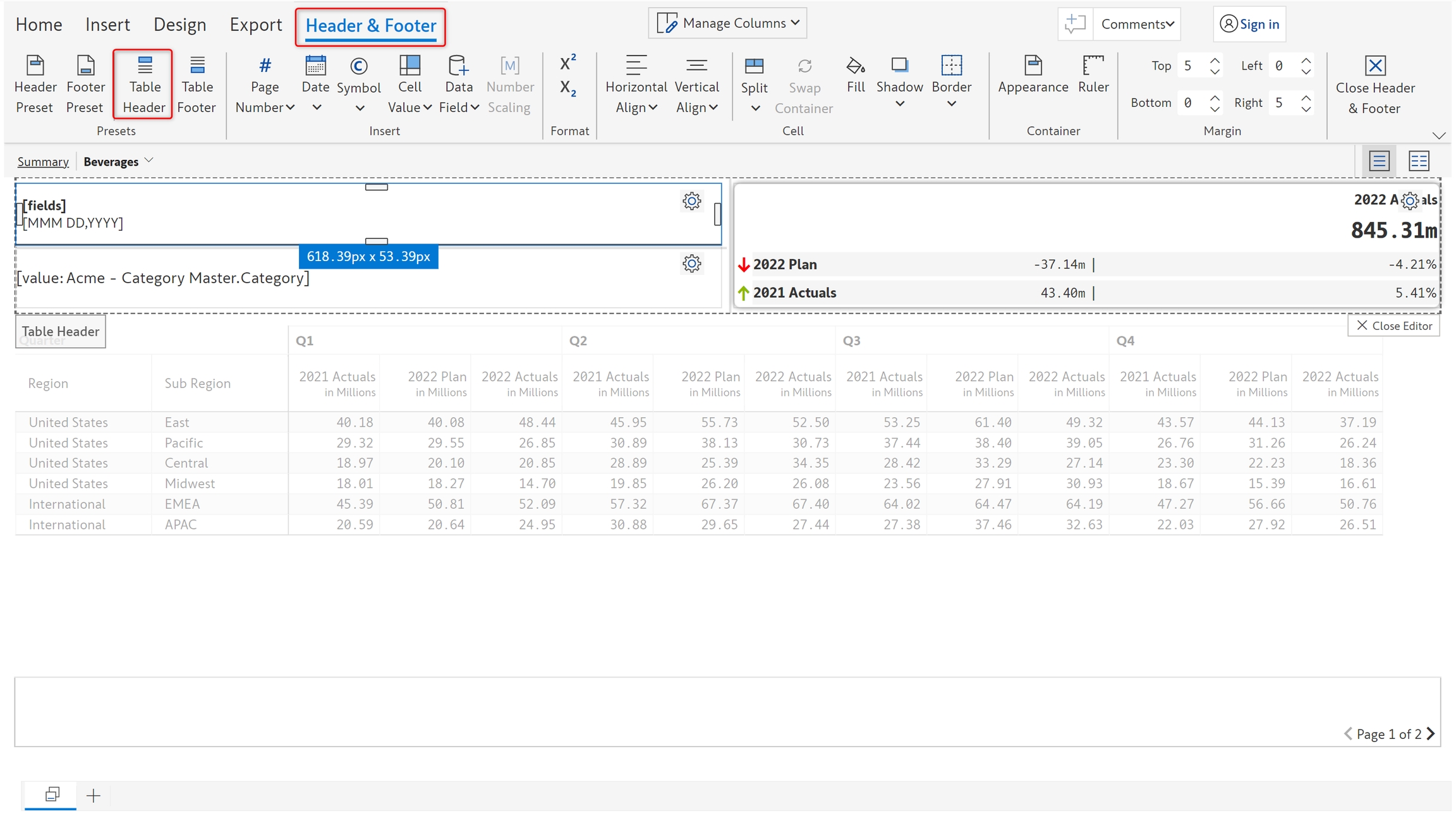 e) You can see that the report header shows the same values as it relates to the entire table, whereas the table header gets updated to reflect the values for the category in this page.