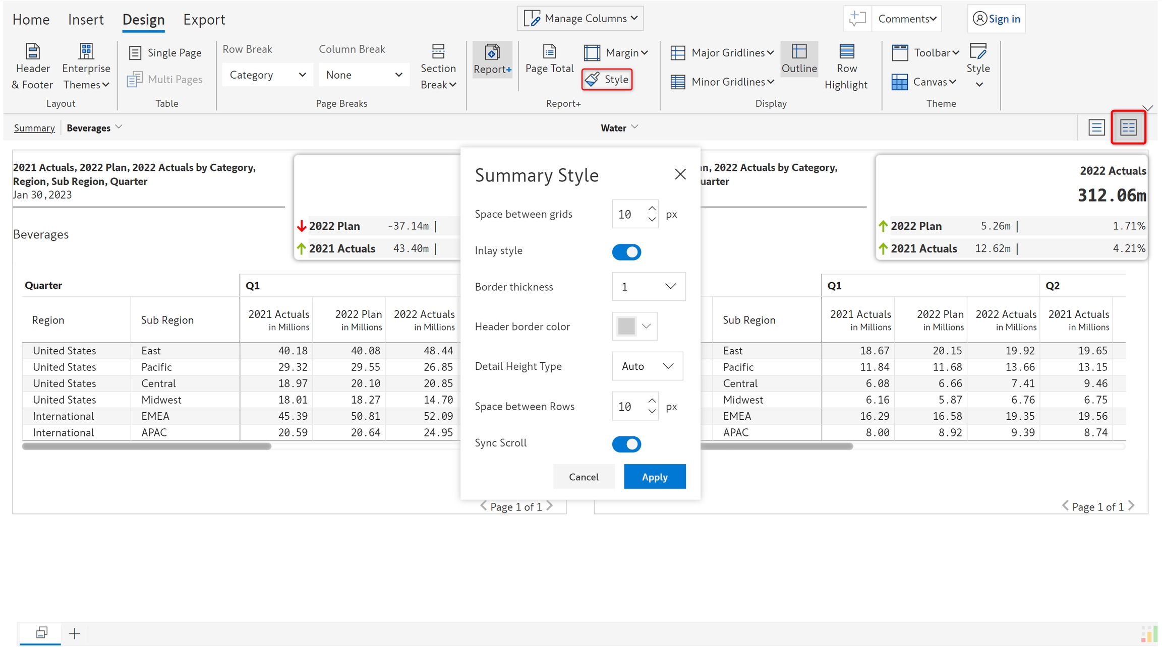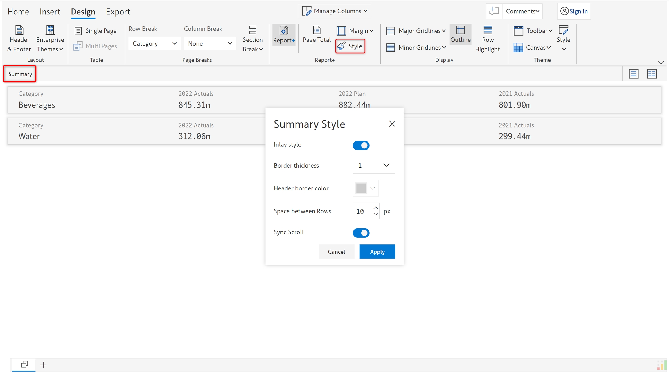 Style options are applicable for the summary view and compare view. The options available in the summary view are shown below.