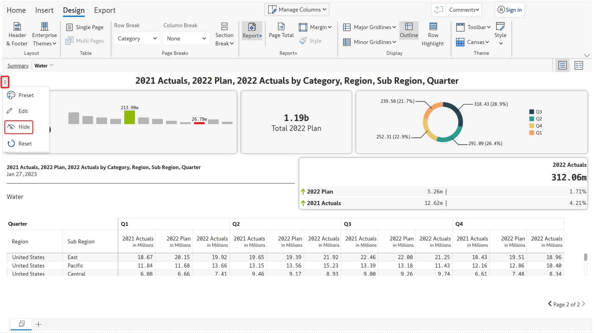 f) Let's hide the report header. Click on the context menu and select 'Hide'.
