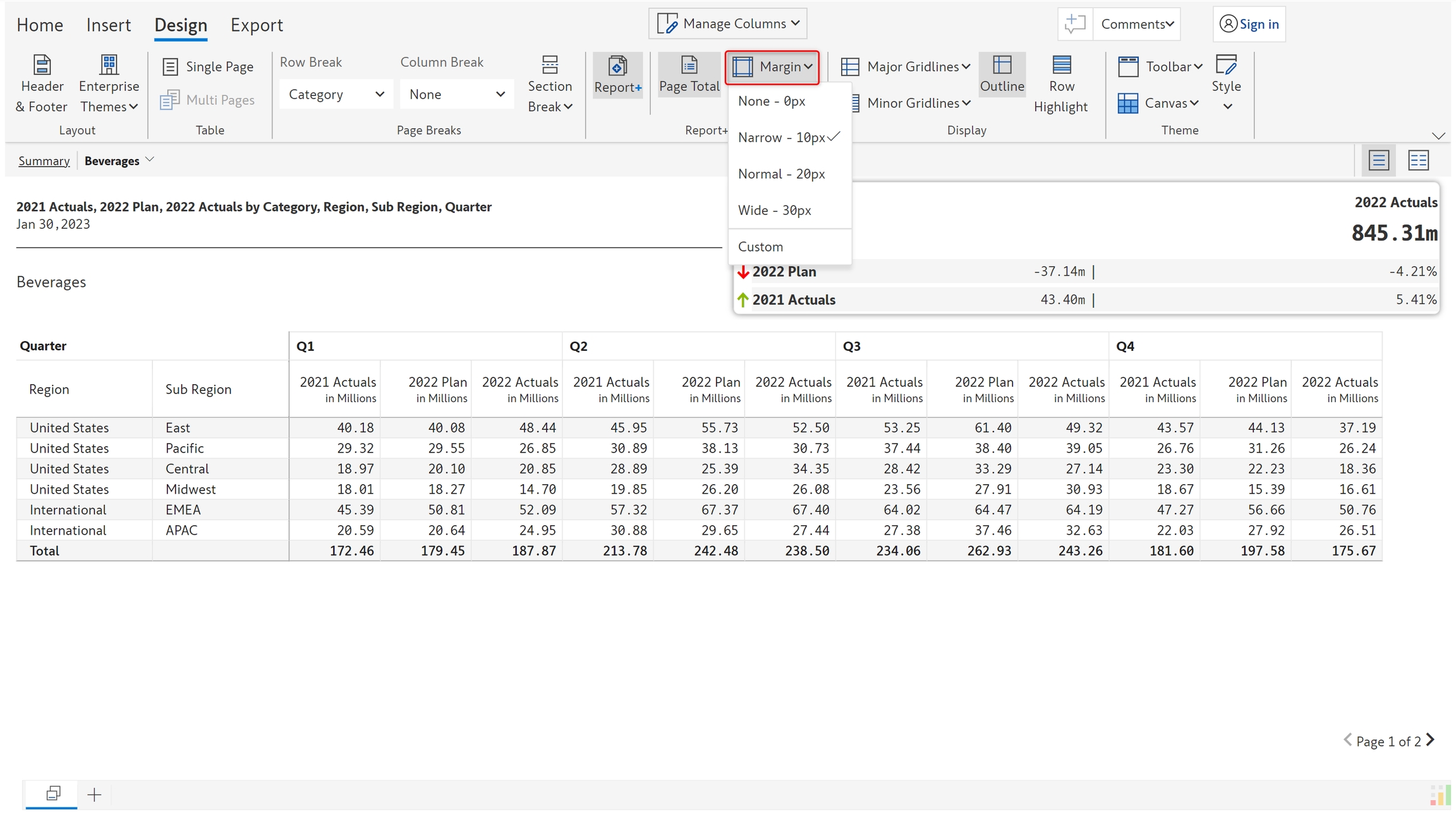 You can apply customizations such as page total, and margins, and customize the summary and compare views. These options are highlighted in the below image.